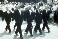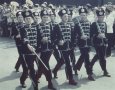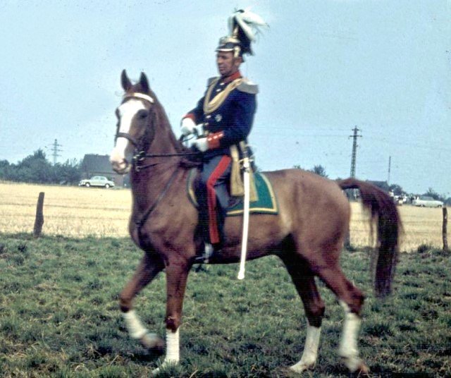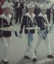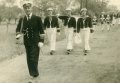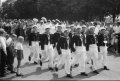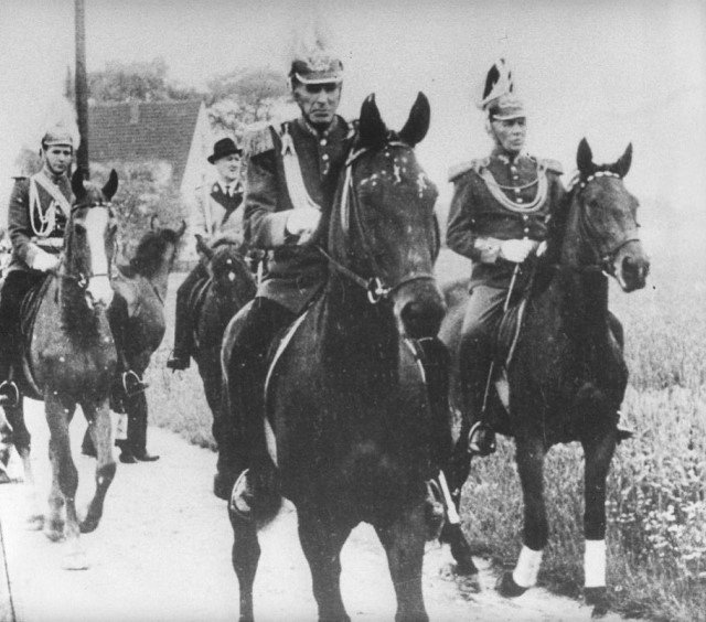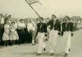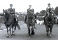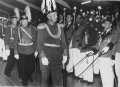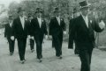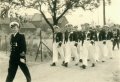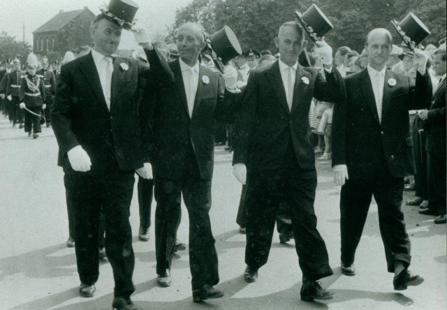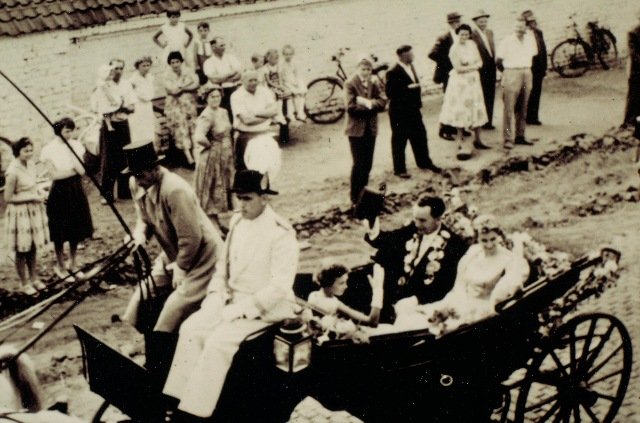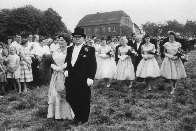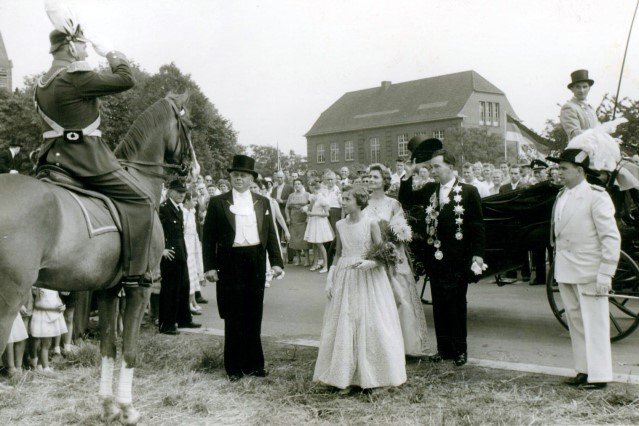 von links: General Josef Jonen zu Pferd, Präsident Josef Kohtes, Lilo Wellemsen, Königin Anni Wellemsen, König Paul Wellemsen, Mundschenk Ludwig Bommers,im Hintergrund: die Strümper Schule