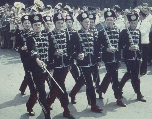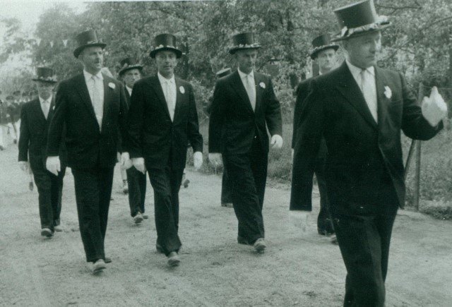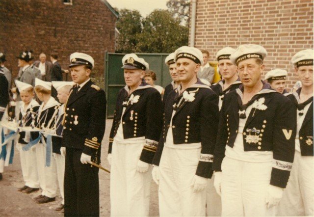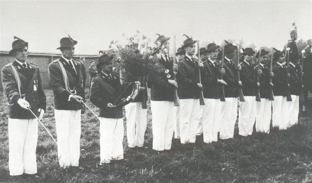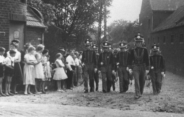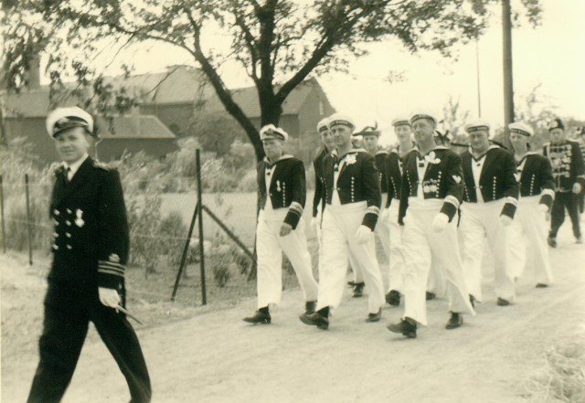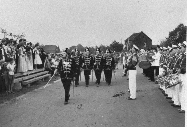 von links: Rudi Plenker, Rolf Beckmann, Hans Wingertches, Gerhard Louis, halb verdeckt = Emil Arts, Willi Birgels, Theo van Rieth, Michael Plenker, Heinrich Birgels, Karl Raukes (Kompaniekönig)