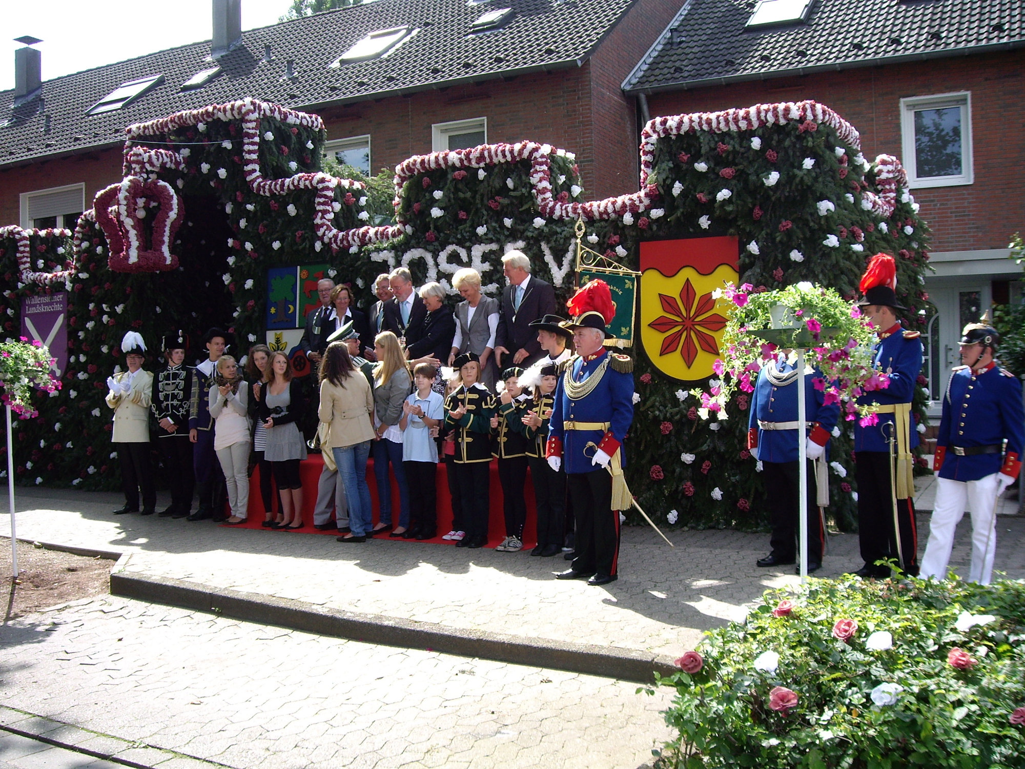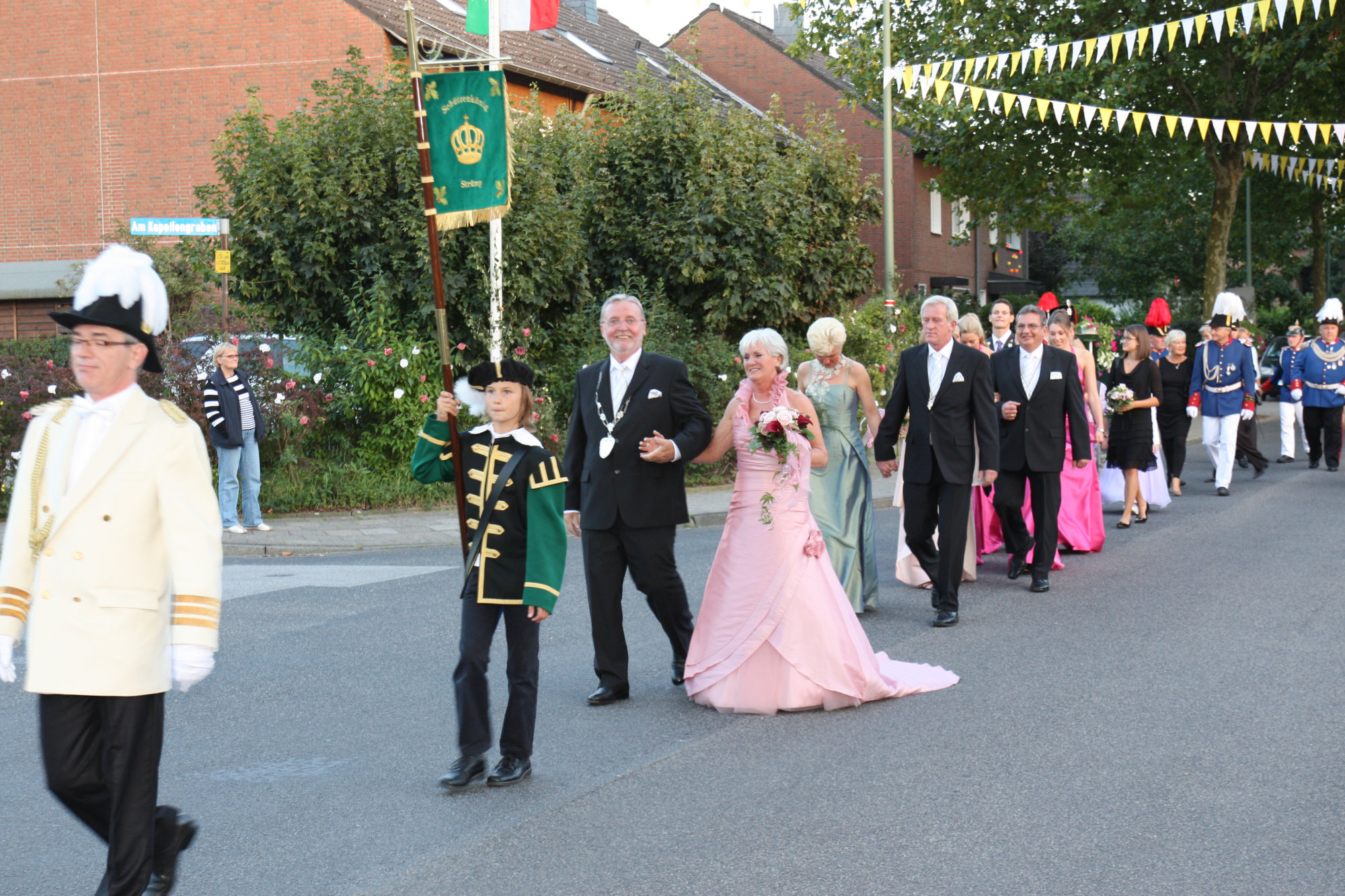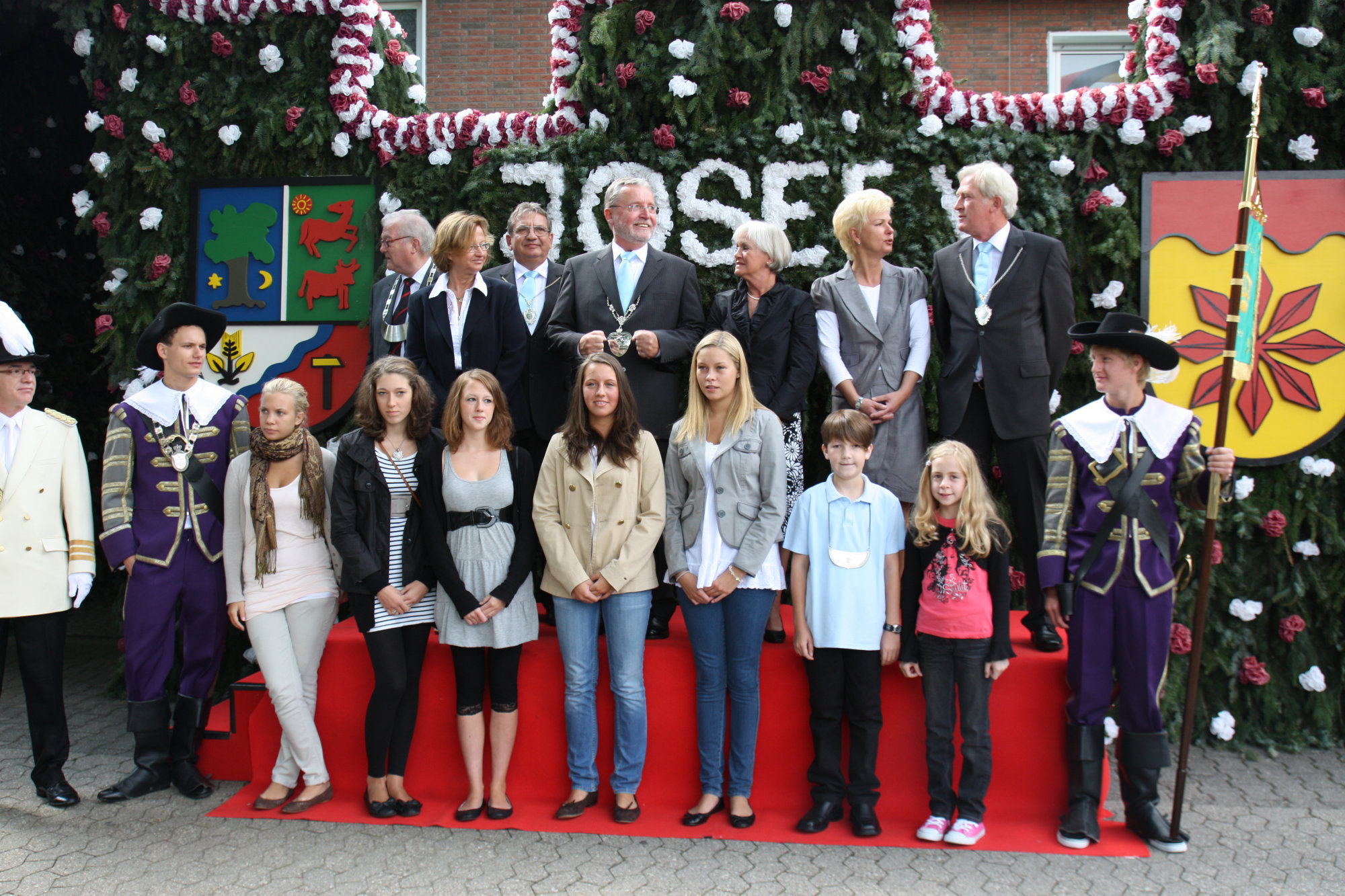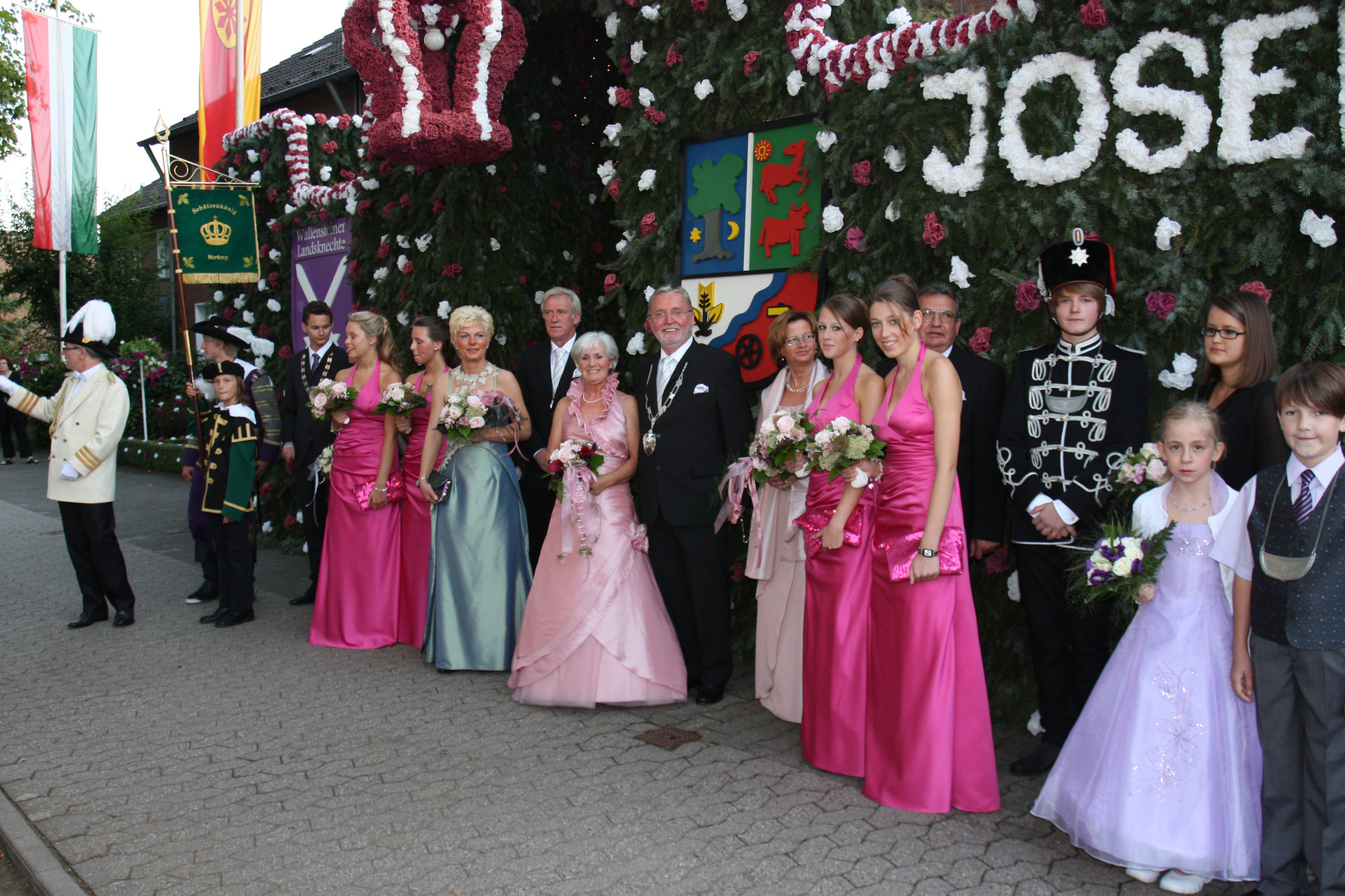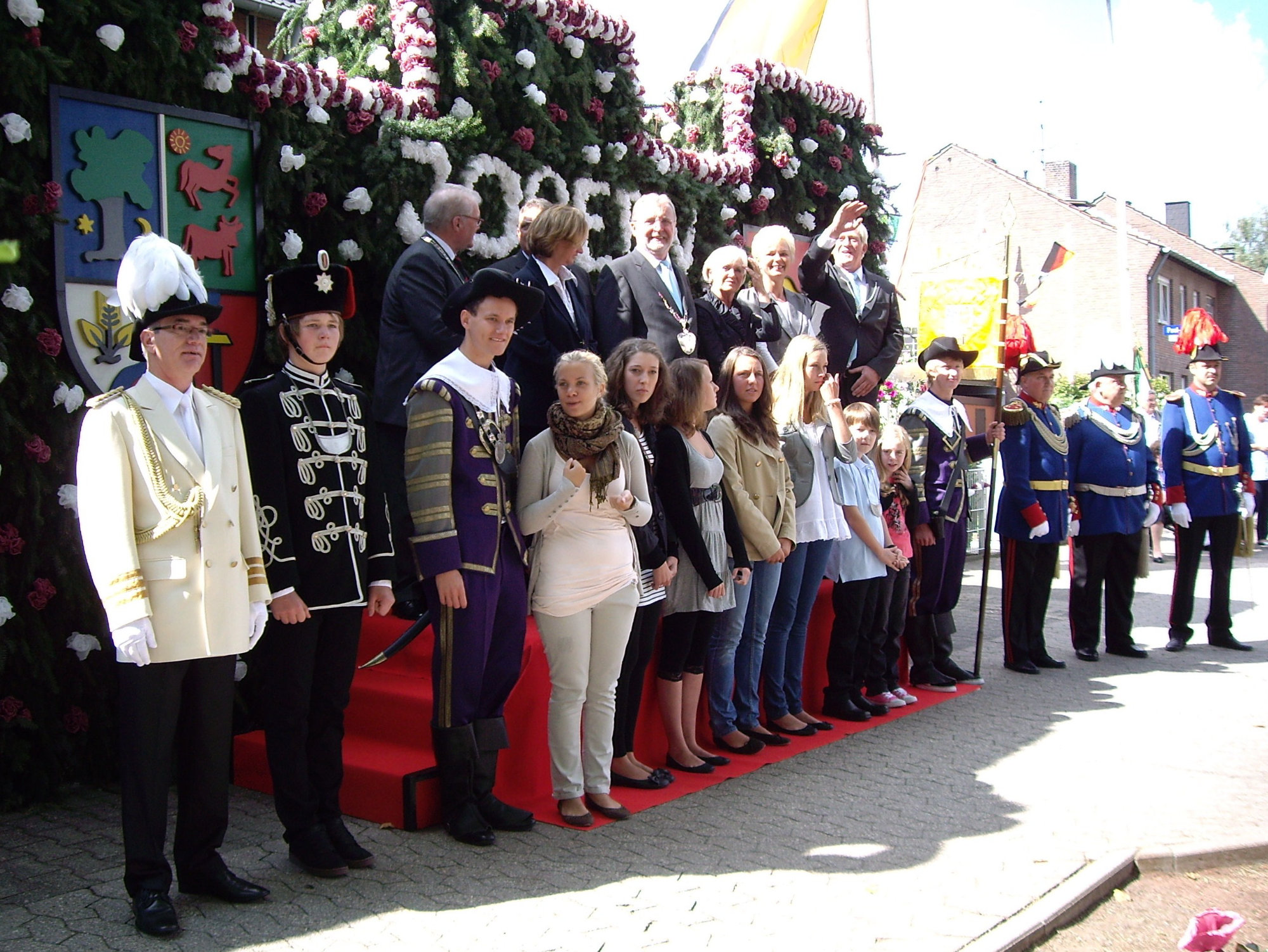 unten v.l.: Mundschenk Michael Grimm, Jungschützenkönigspaar Dominik Blömer und Linda Pukropski, Hofdamen Marie Giesler, Jayde Watton, Sophie Webers und Maureen Paas, Kinderprinzenpaar Linus Debüser und Sofia Steinfort, Standartenträger Maximilian Crieé
