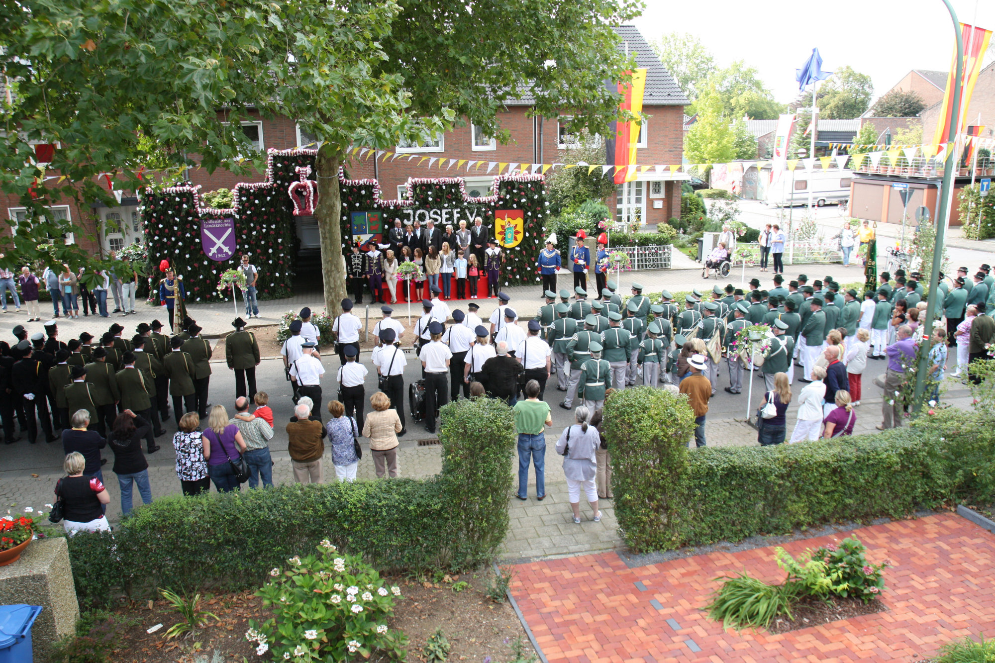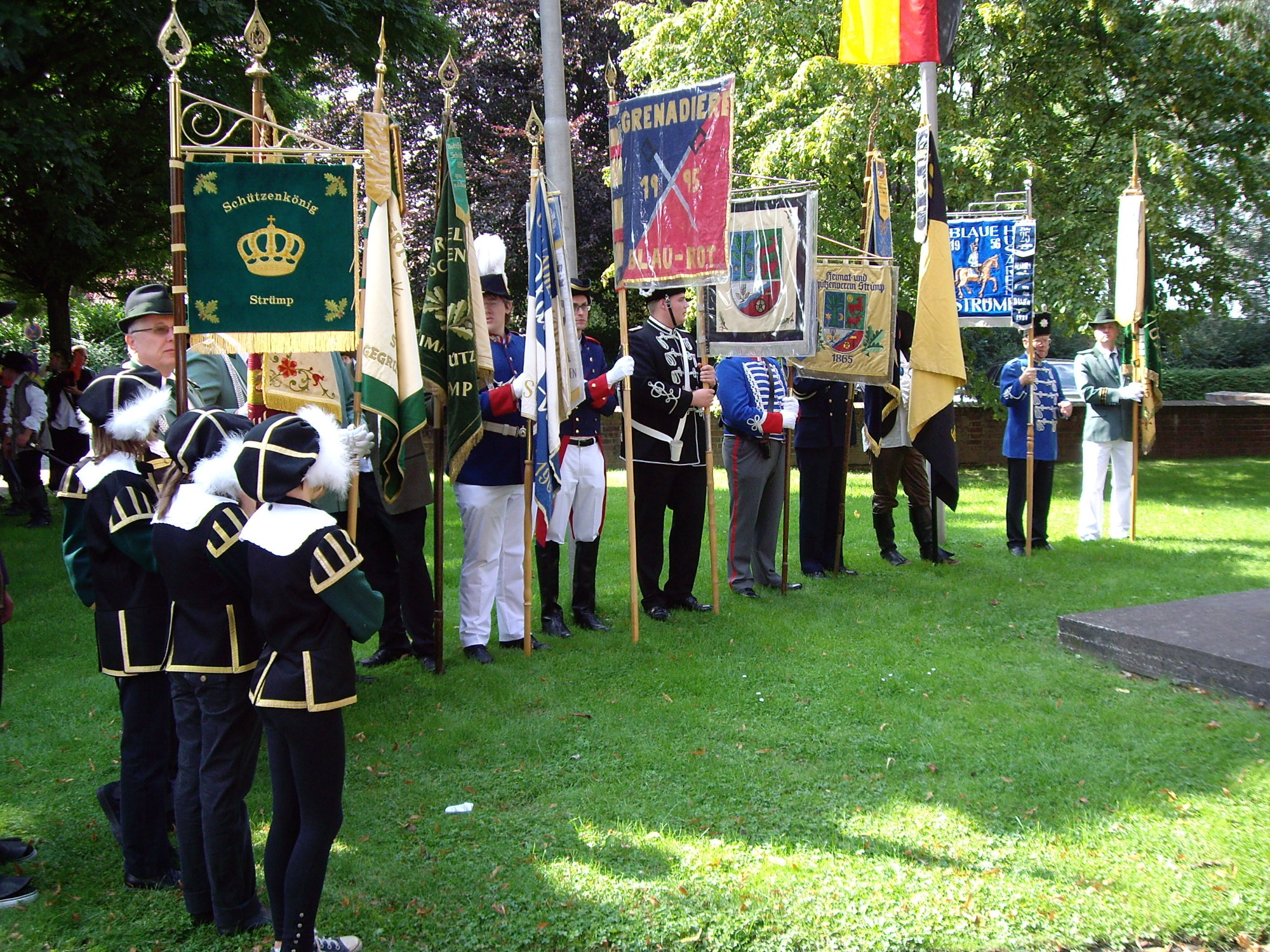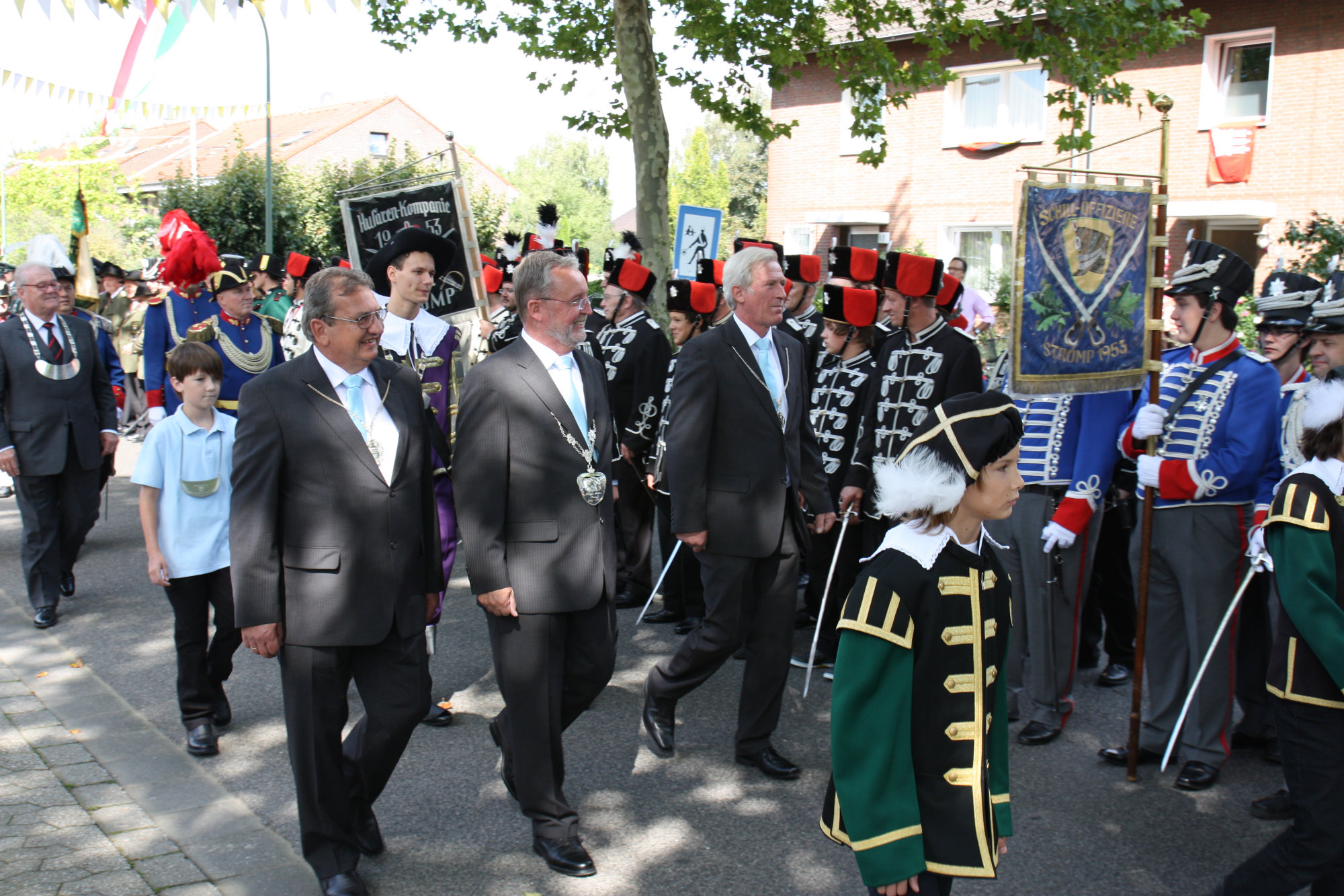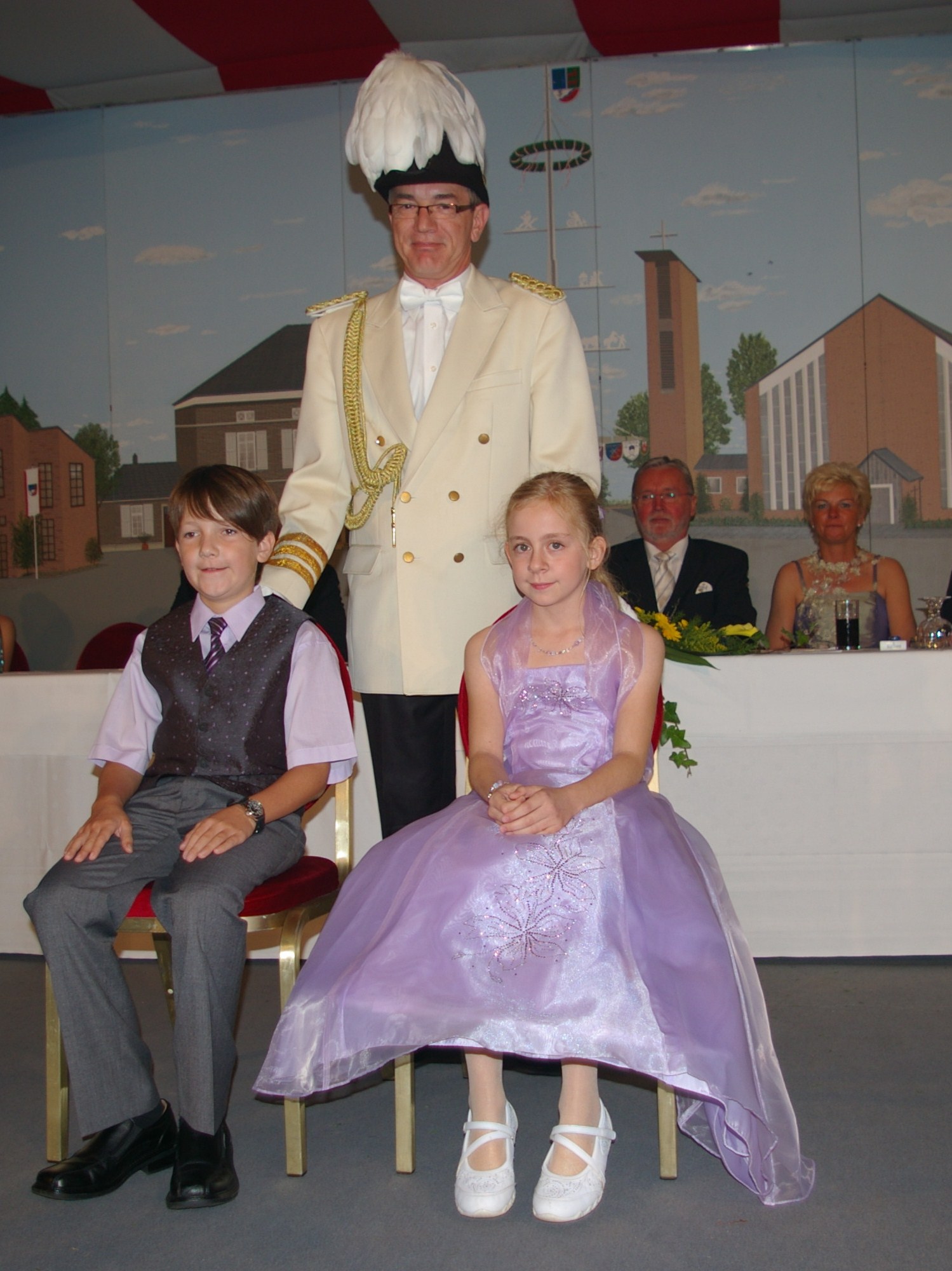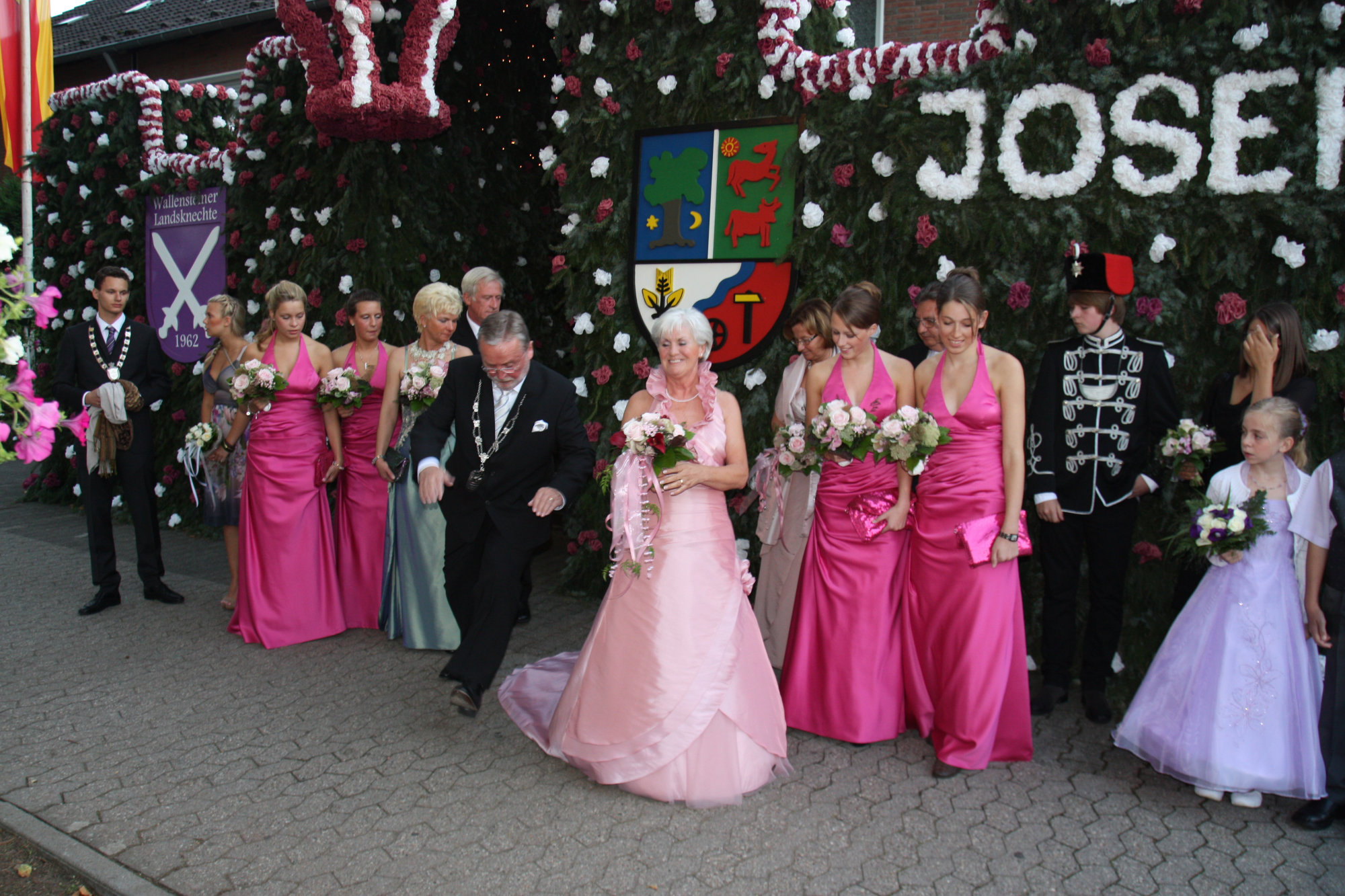 unten v.l.: Mundschenk Michael Grimm, Jungschützenkönigspaar Dominik Blömer und Linda Pukropski, Hofdamen Marie Giesler, Jayde Watton, Sophie Webers und Maureen Paas, Kinderprinzenpaar Linus Debüser und Sofia Steinfort, Standartenträger Maximilian Crieé