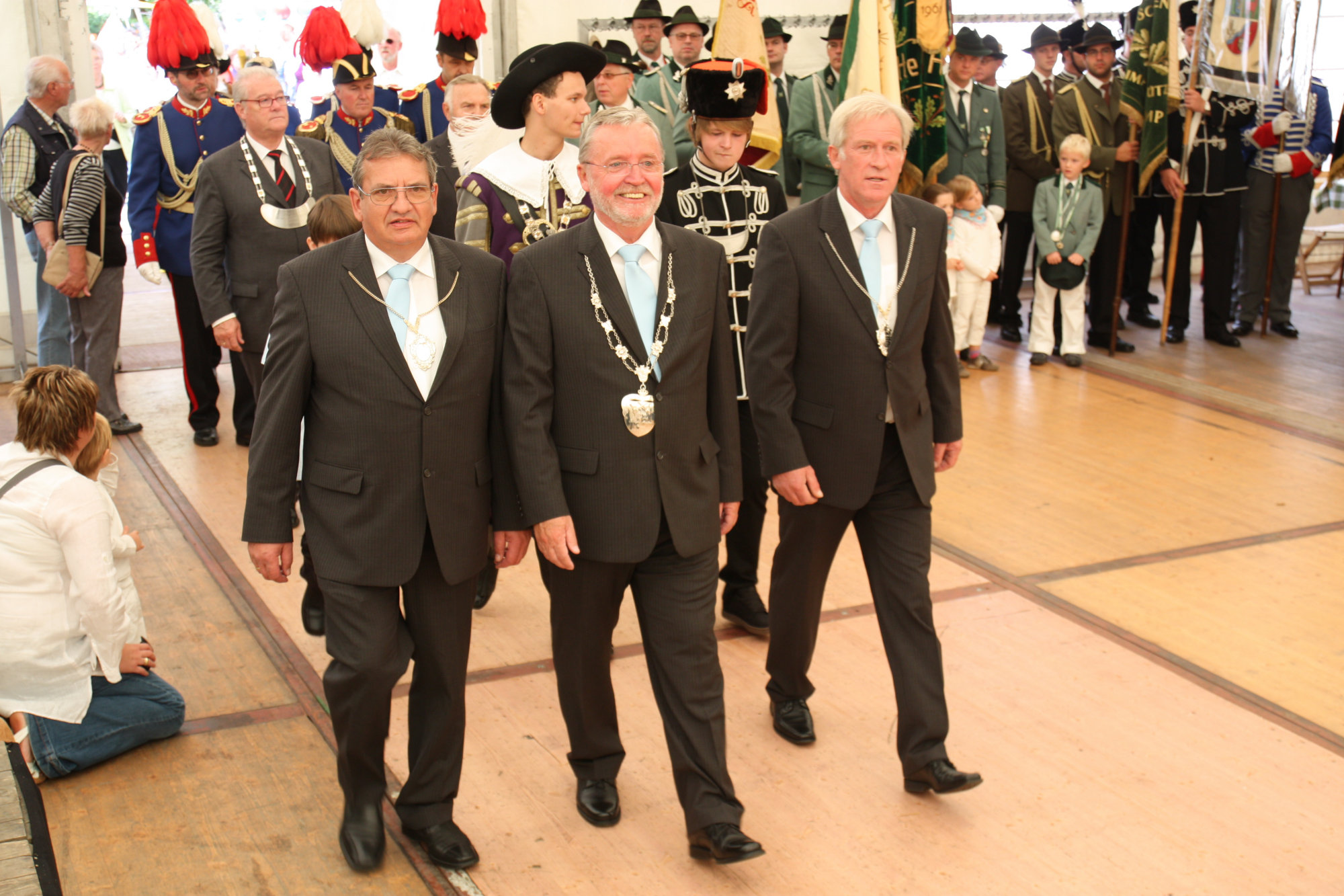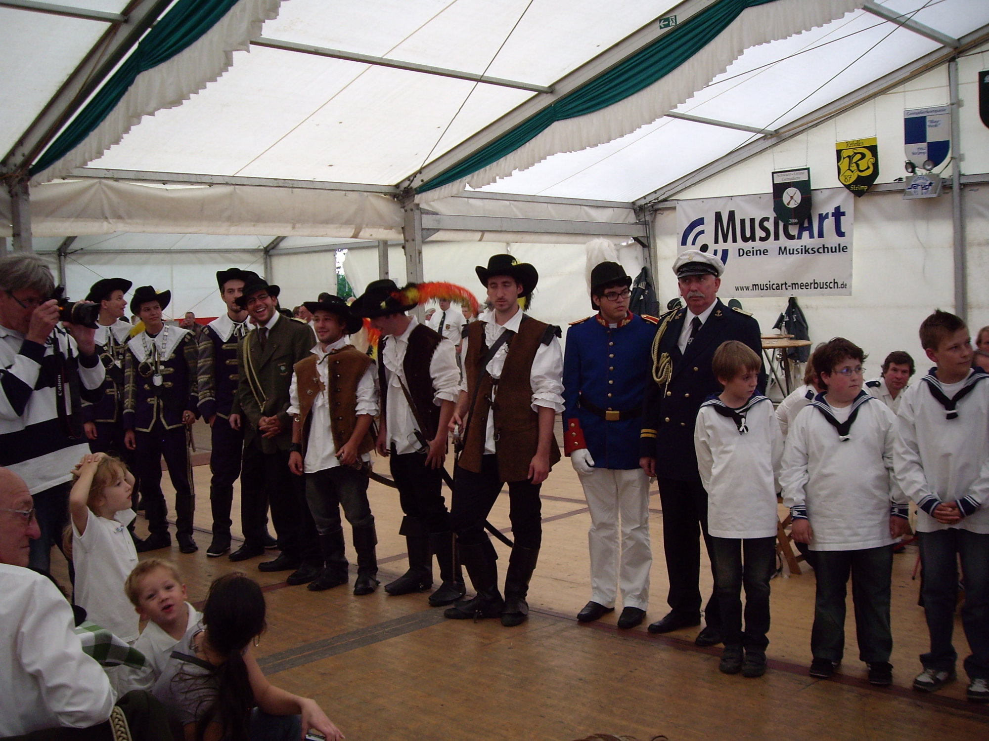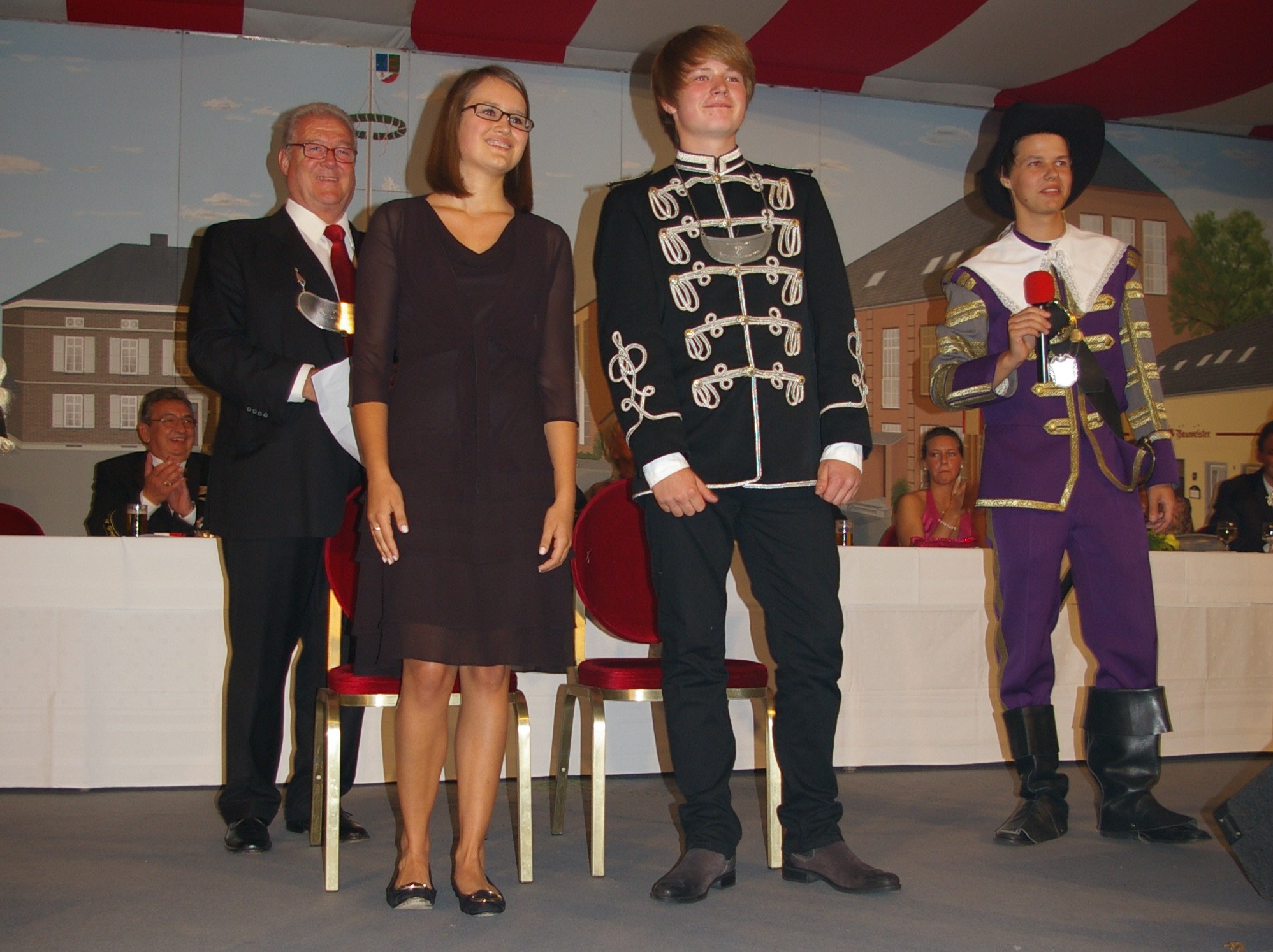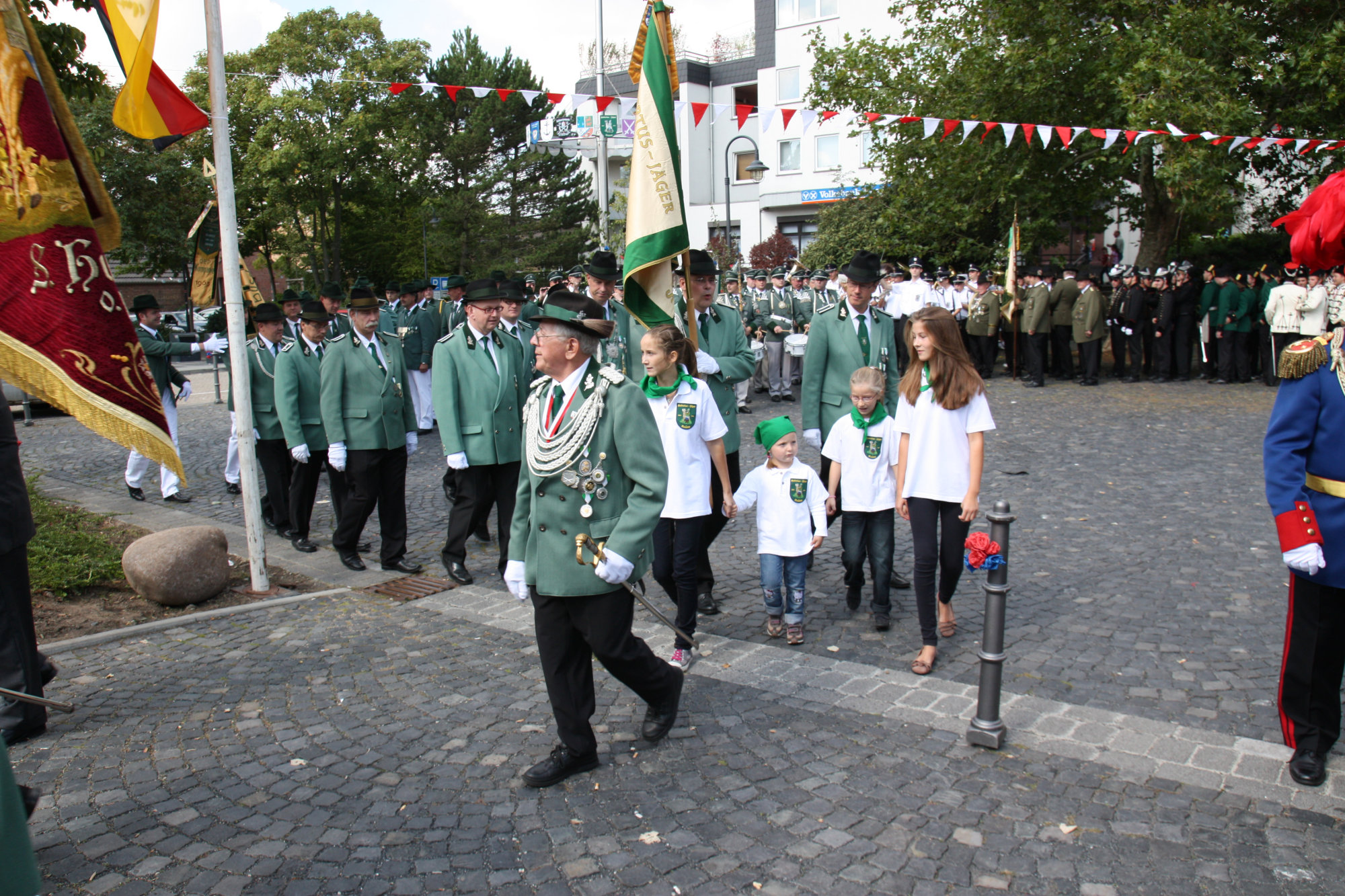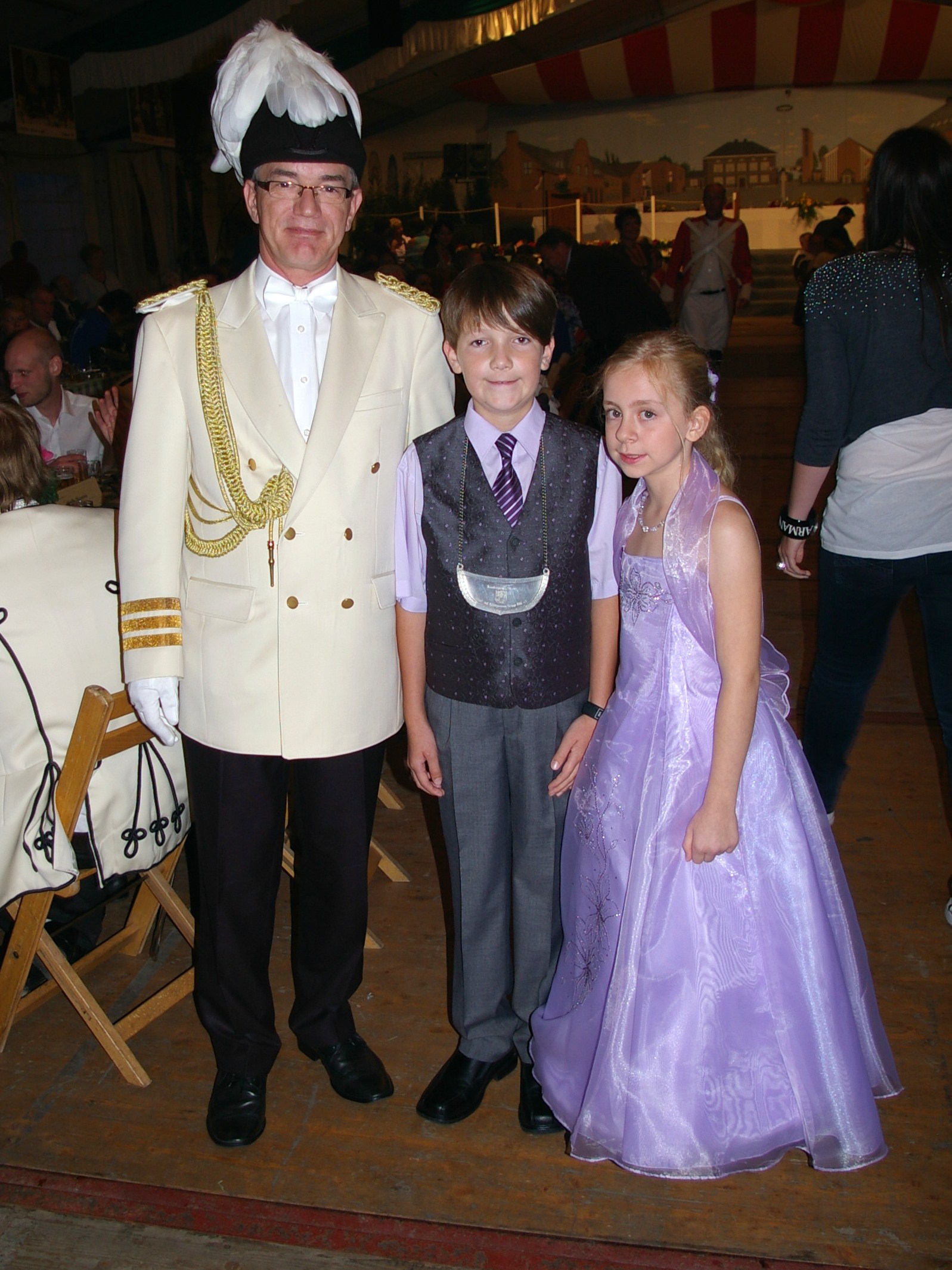 unten v.l.: Mundschenk Michael Grimm, Jungschützenkönigspaar Dominik Blömer und Linda Pukropski, Hofdamen Marie Giesler, Jayde Watton, Sophie Webers und Maureen Paas, Kinderprinzenpaar Linus Debüser und Sofia Steinfort, Standartenträger Maximilian Crieé