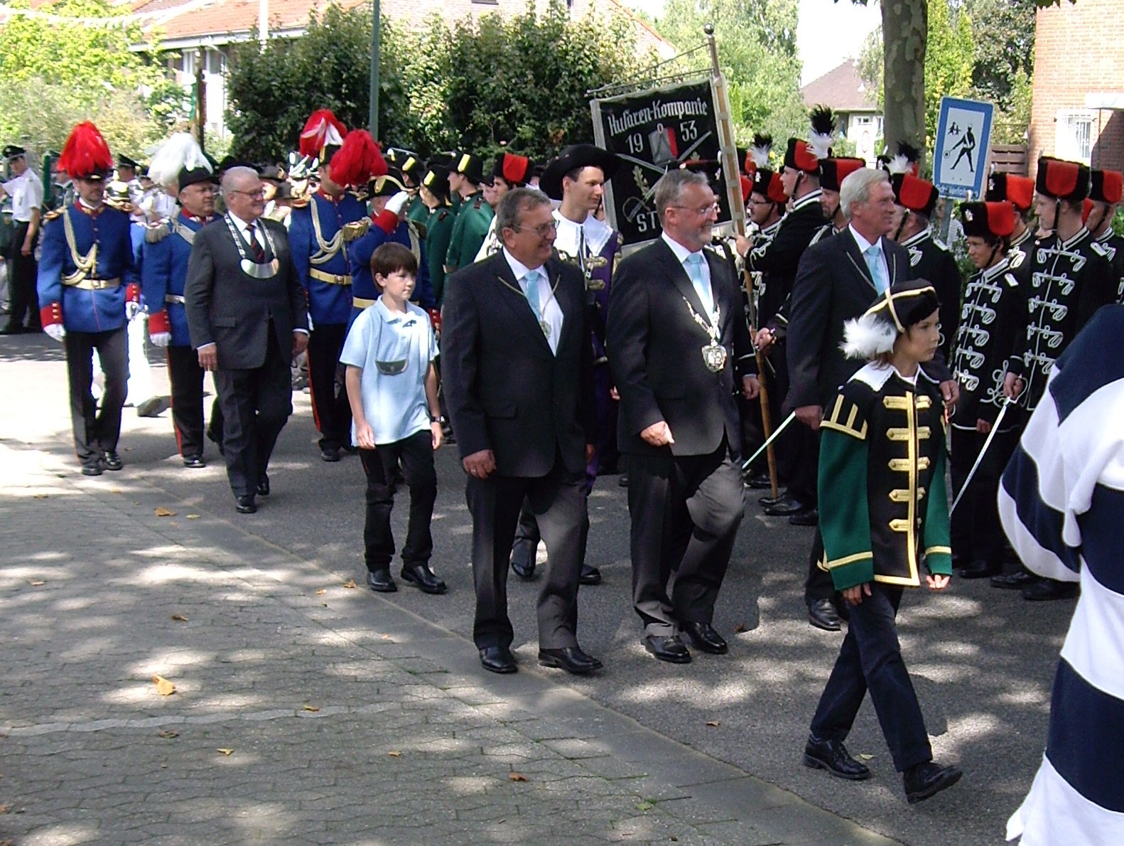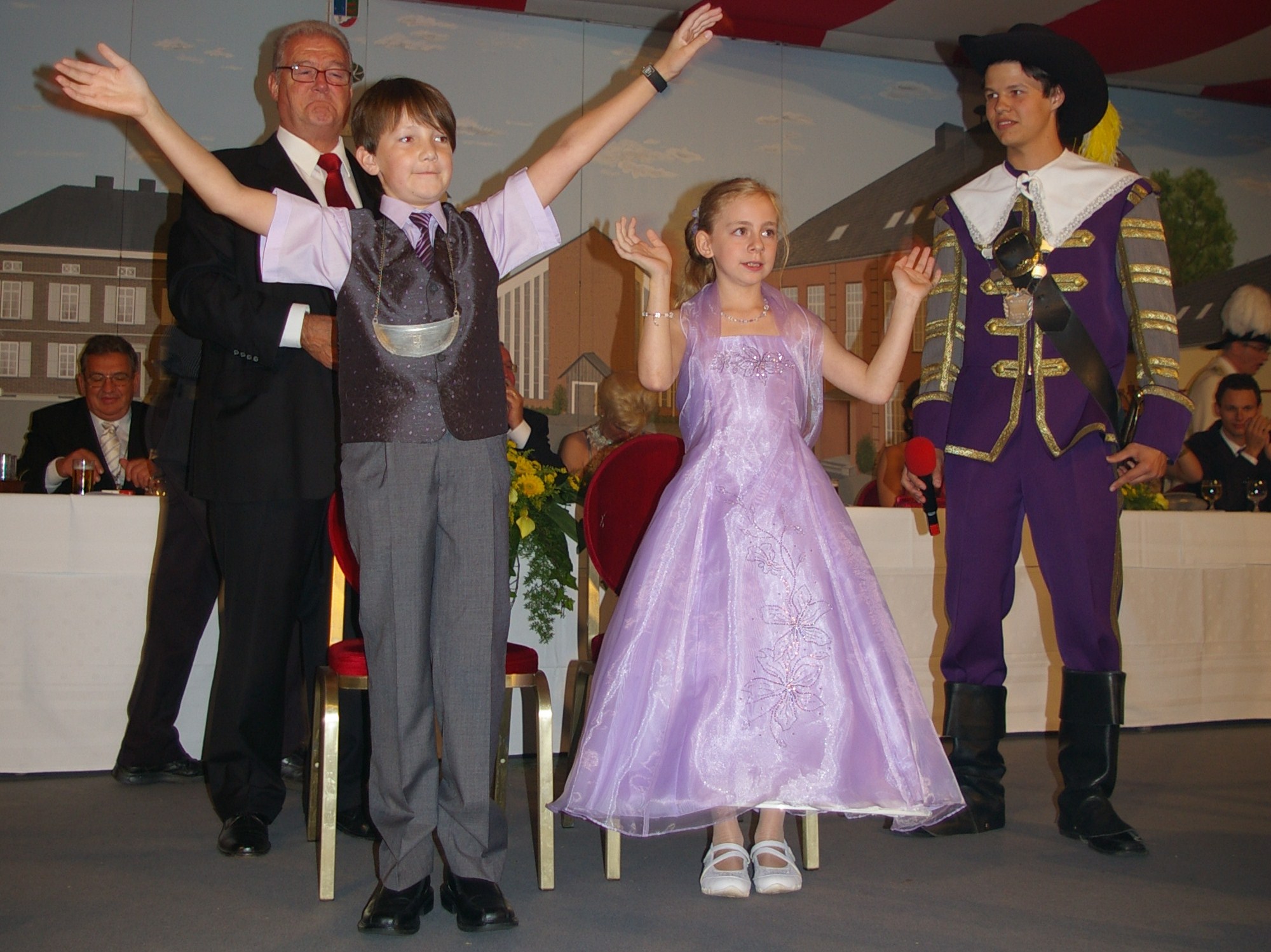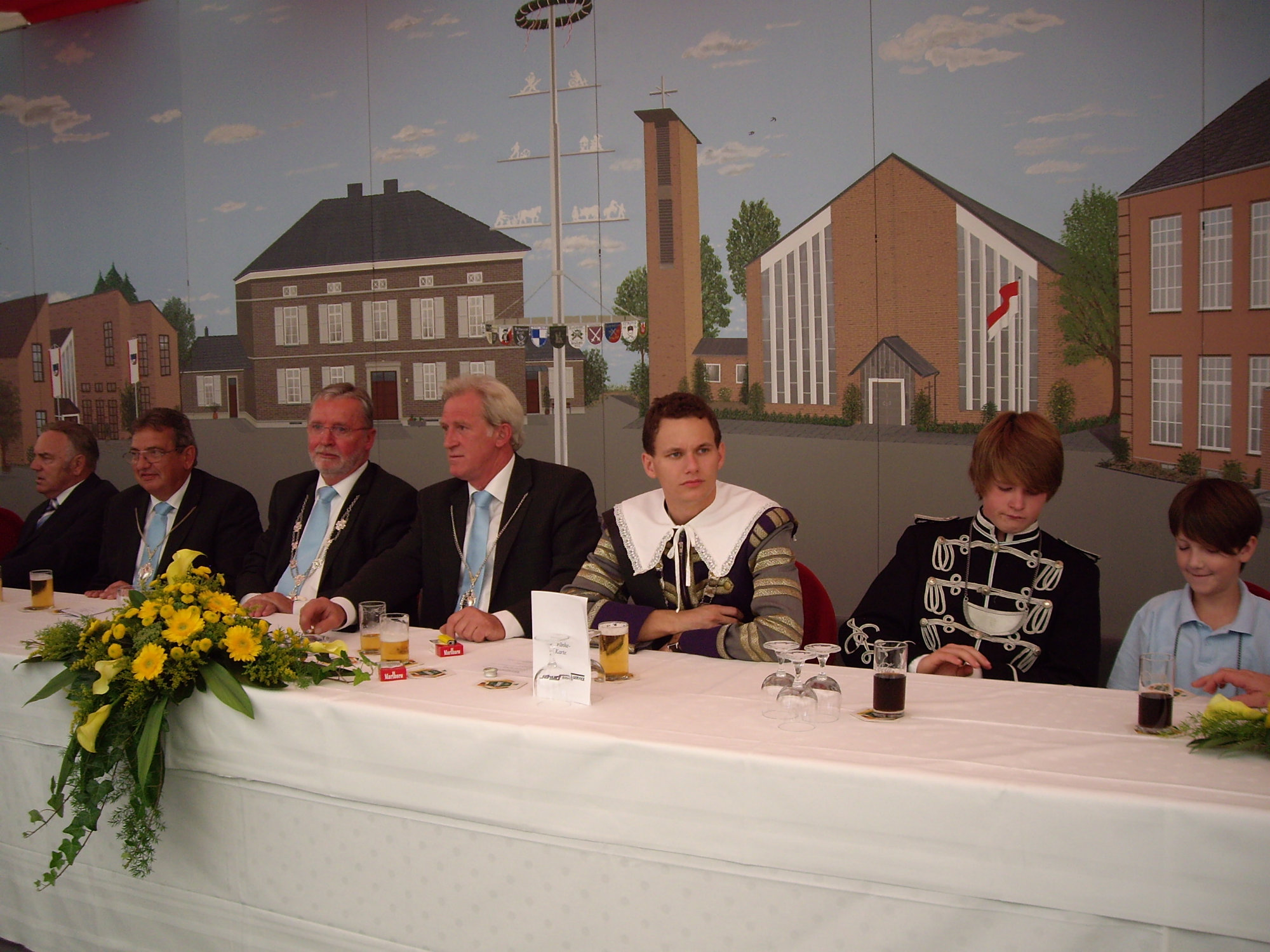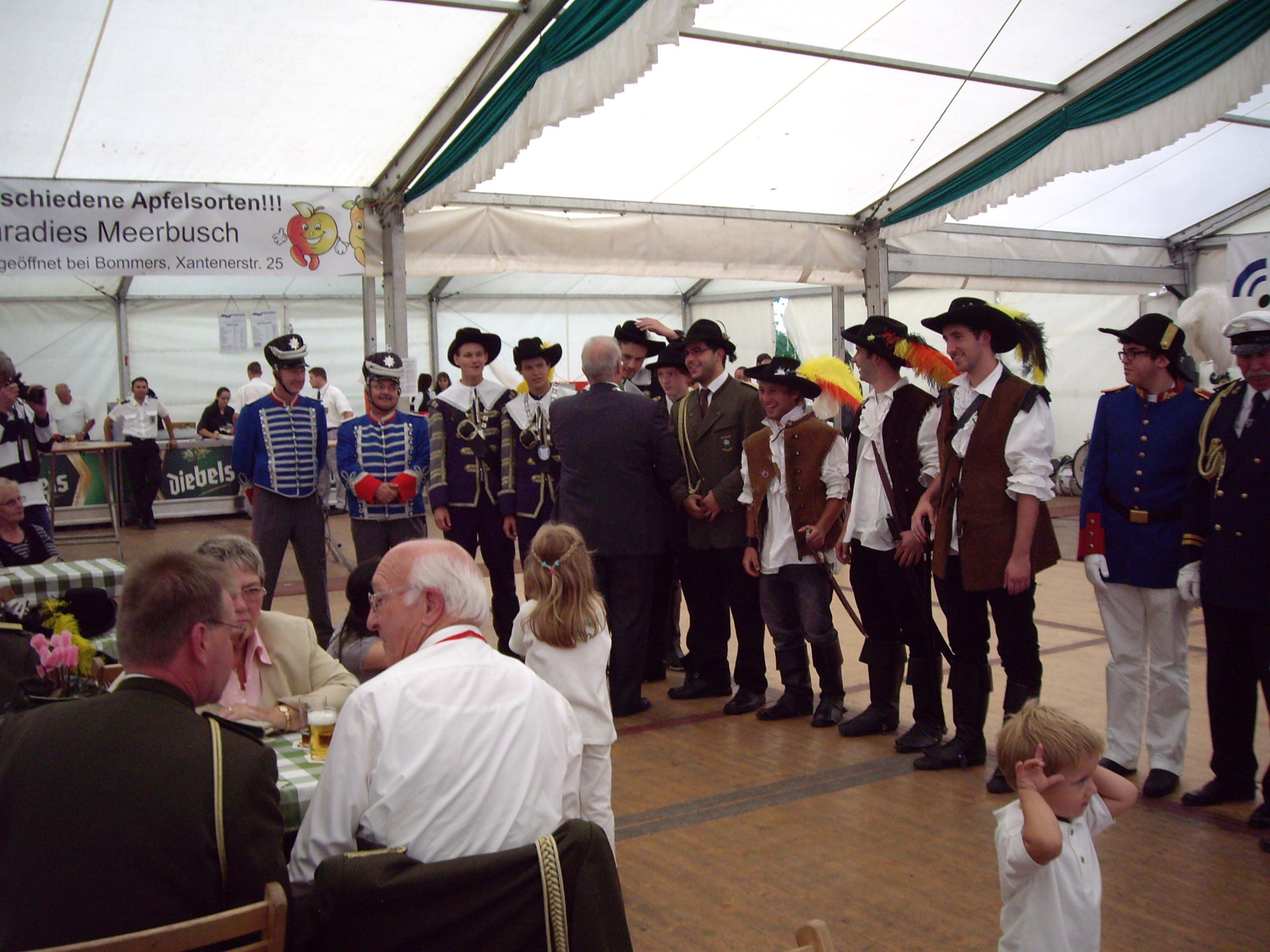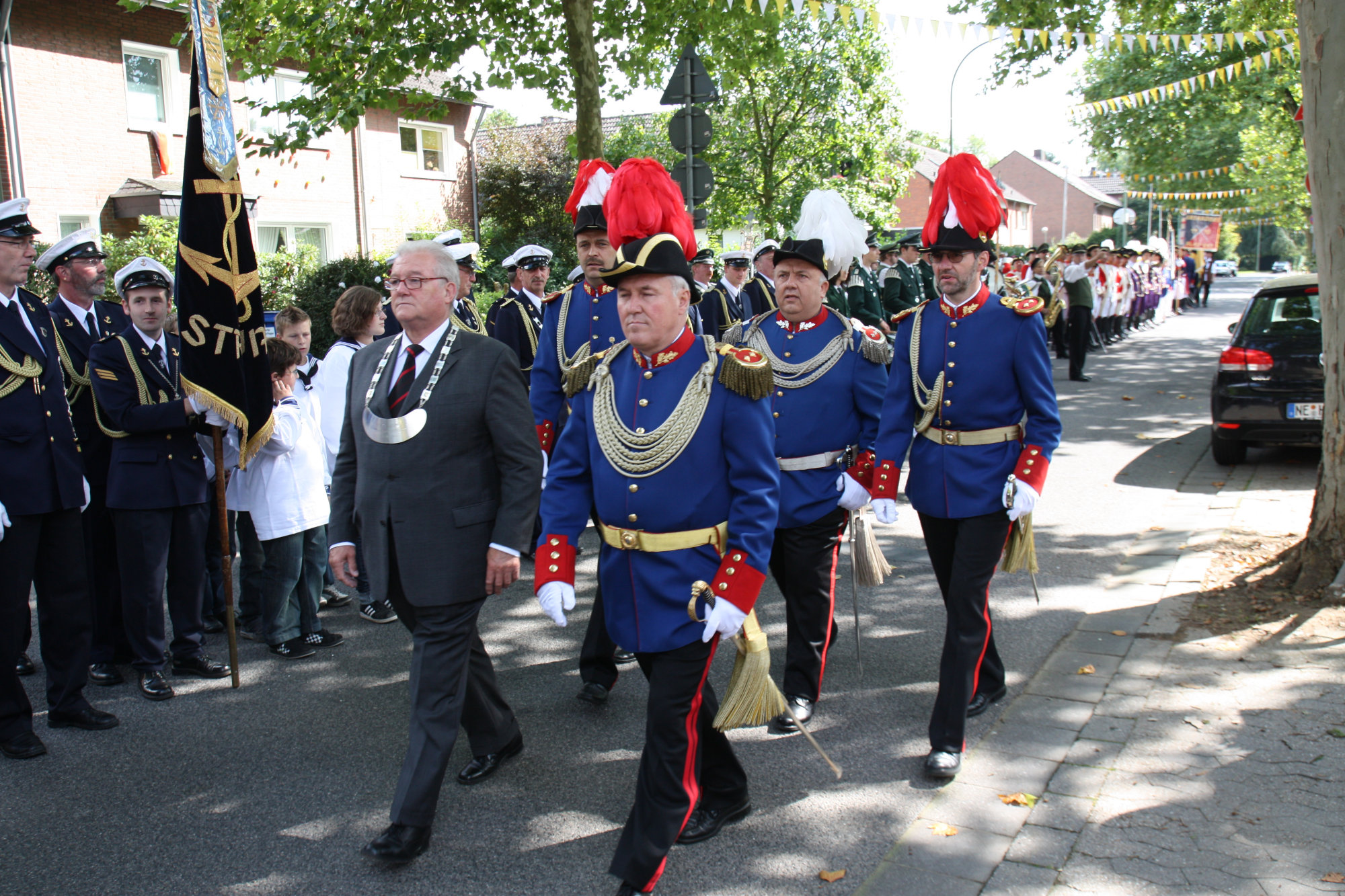 unten v.l.: Mundschenk Michael Grimm, Jungschützenkönigspaar Dominik Blömer und Linda Pukropski, Hofdamen Marie Giesler, Jayde Watton, Sophie Webers und Maureen Paas, Kinderprinzenpaar Linus Debüser und Sofia Steinfort, Standartenträger Maximilian Crieé