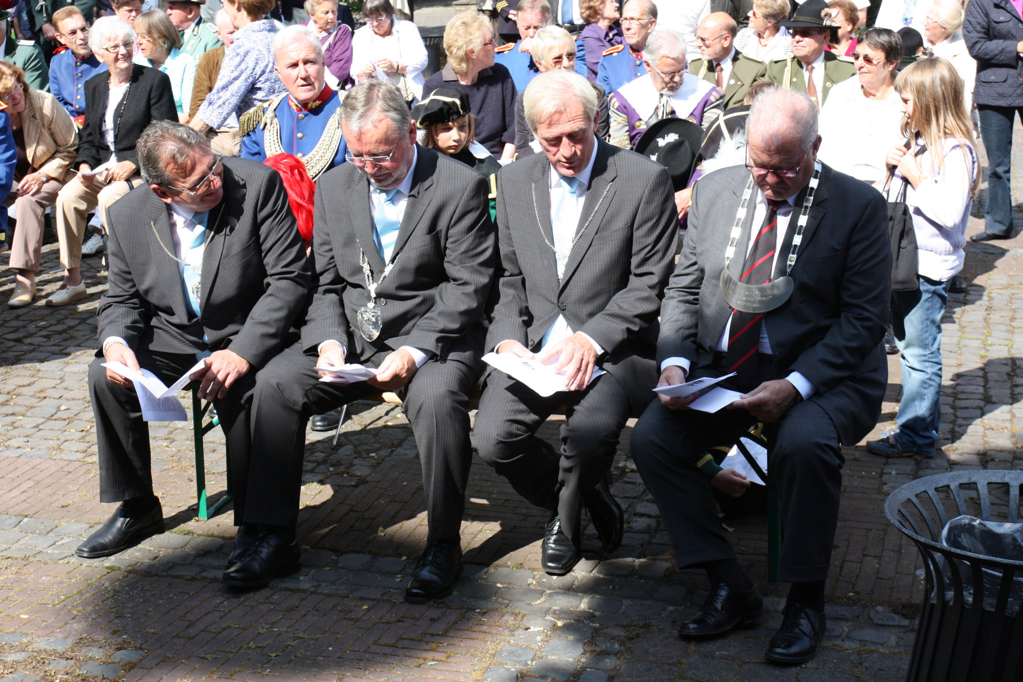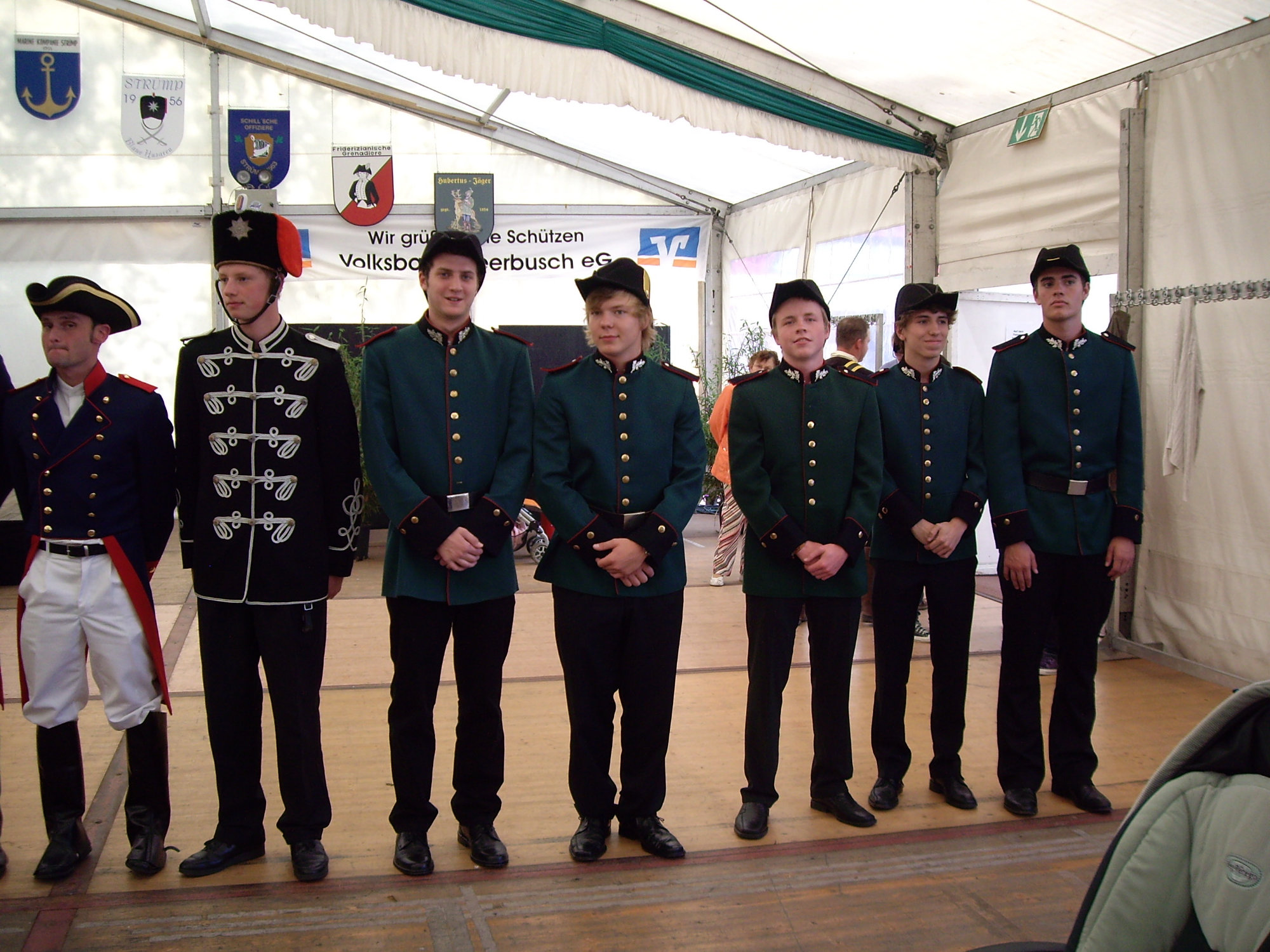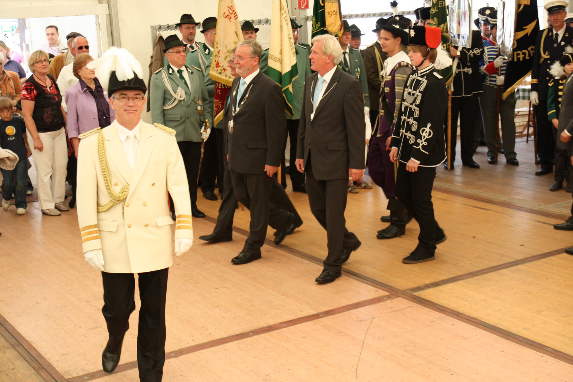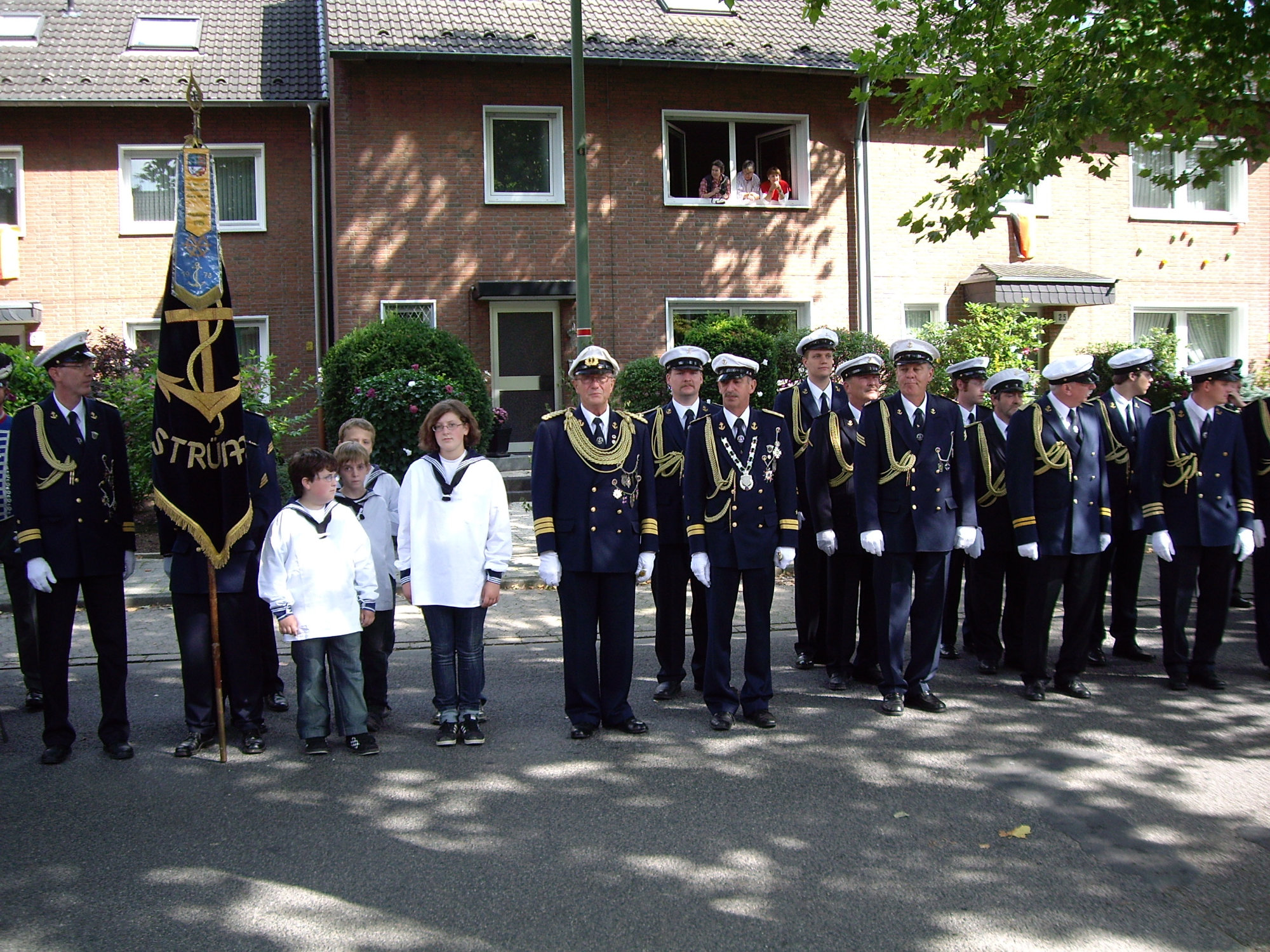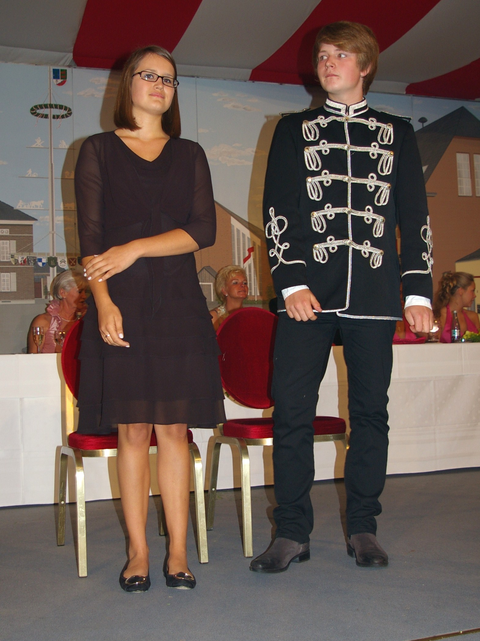 unten v.l.: Mundschenk Michael Grimm, Jungschützenkönigspaar Dominik Blömer und Linda Pukropski, Hofdamen Marie Giesler, Jayde Watton, Sophie Webers und Maureen Paas, Kinderprinzenpaar Linus Debüser und Sofia Steinfort, Standartenträger Maximilian Crieé
