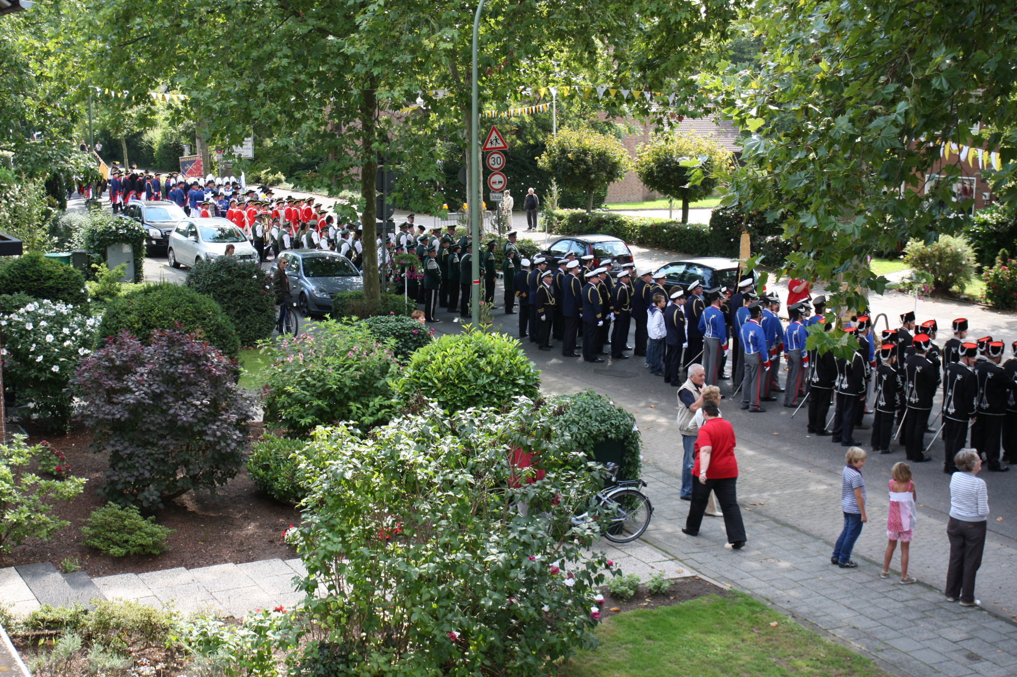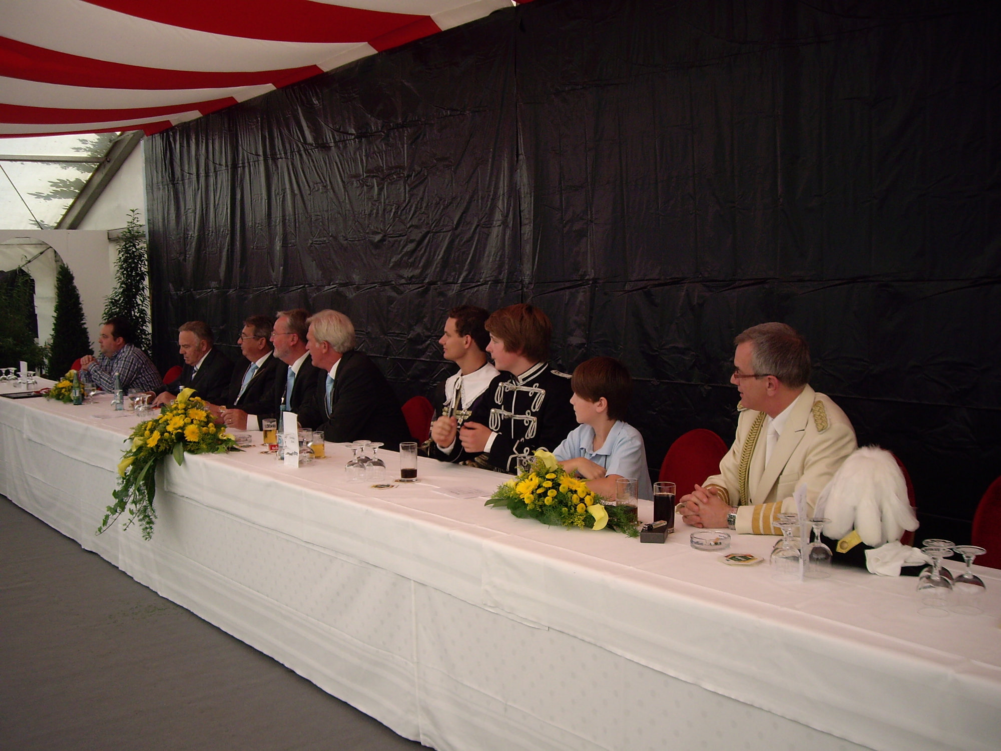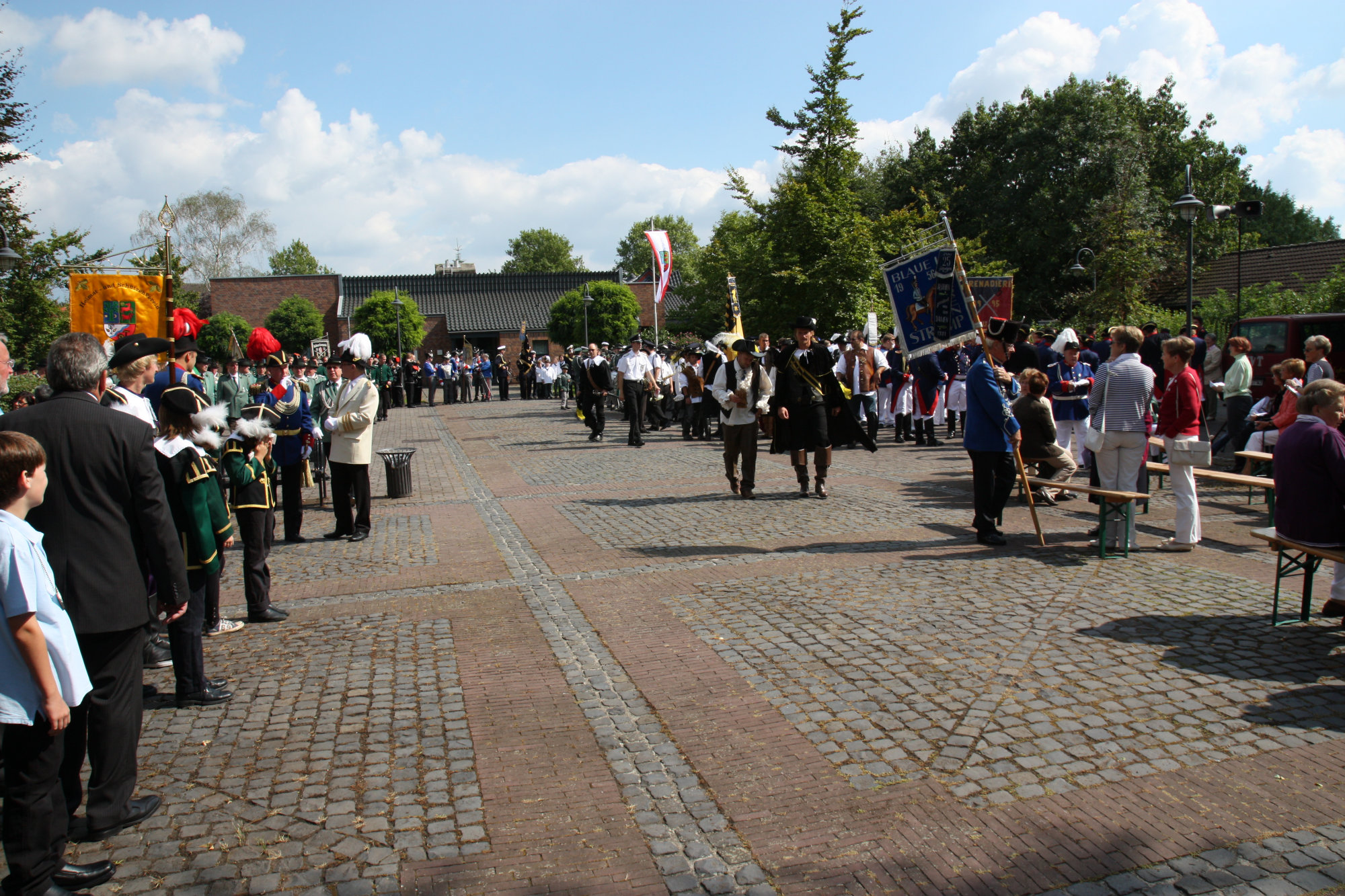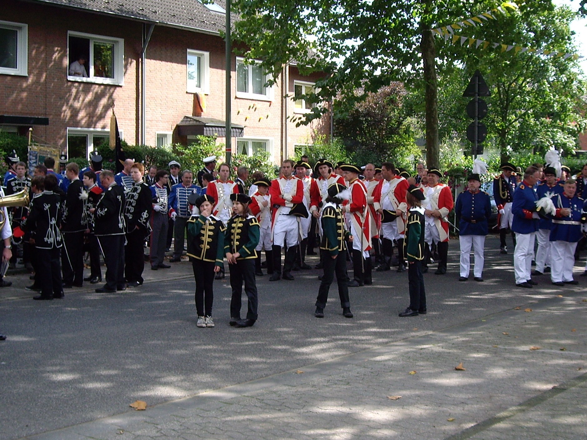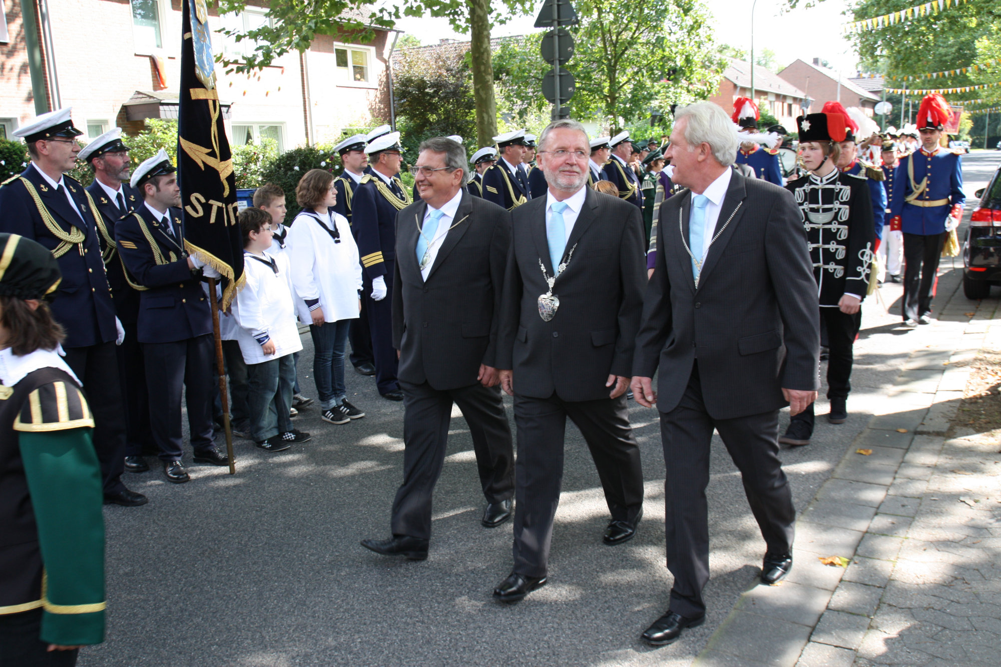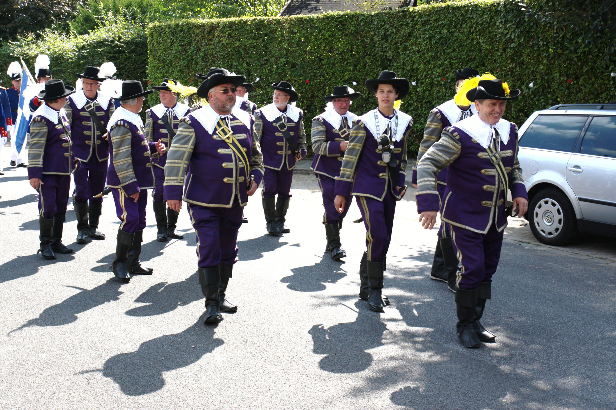 unten v.l.: Mundschenk Michael Grimm, Jungschützenkönigspaar Dominik Blömer und Linda Pukropski, Hofdamen Marie Giesler, Jayde Watton, Sophie Webers und Maureen Paas, Kinderprinzenpaar Linus Debüser und Sofia Steinfort, Standartenträger Maximilian Crieé