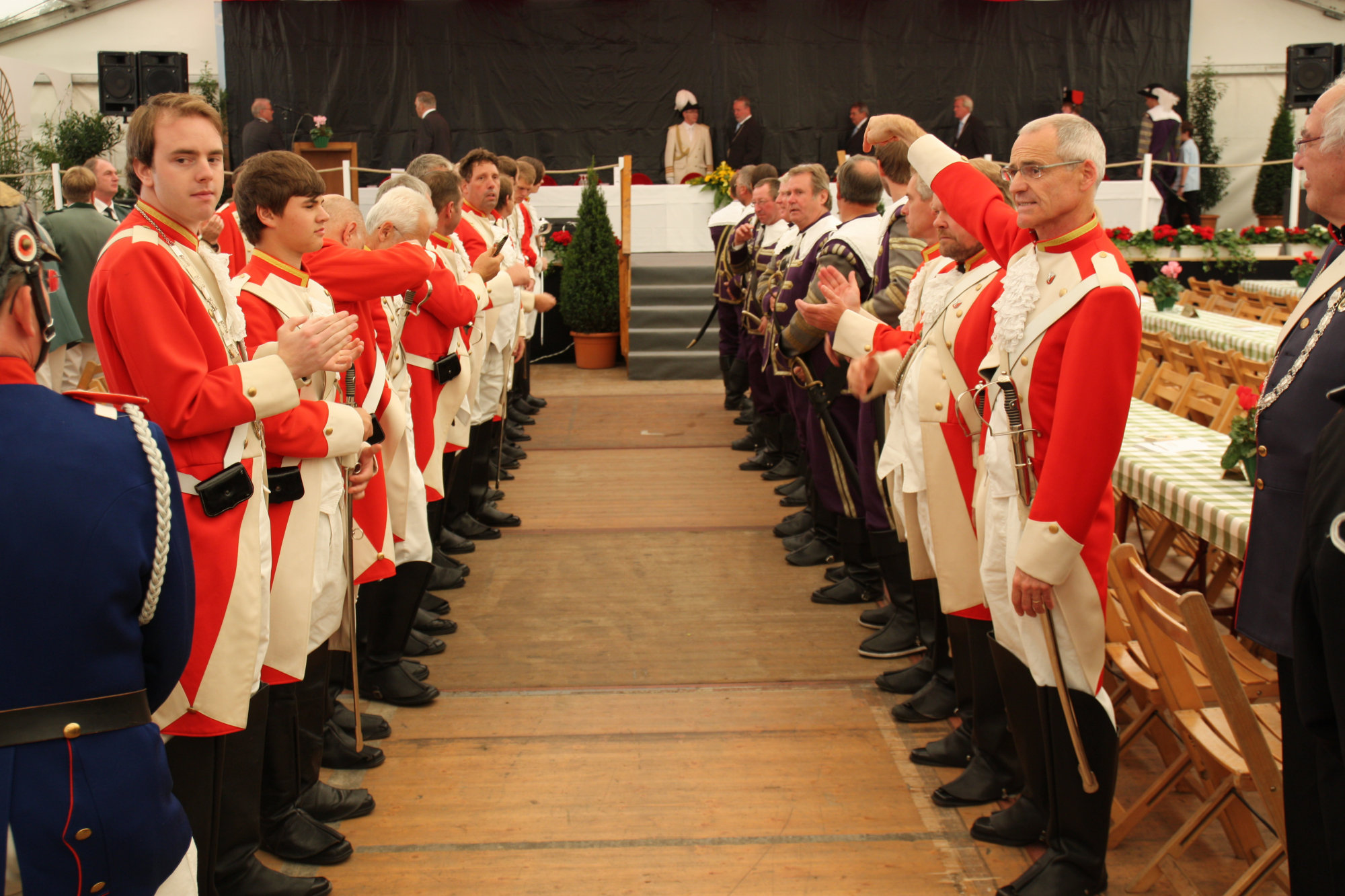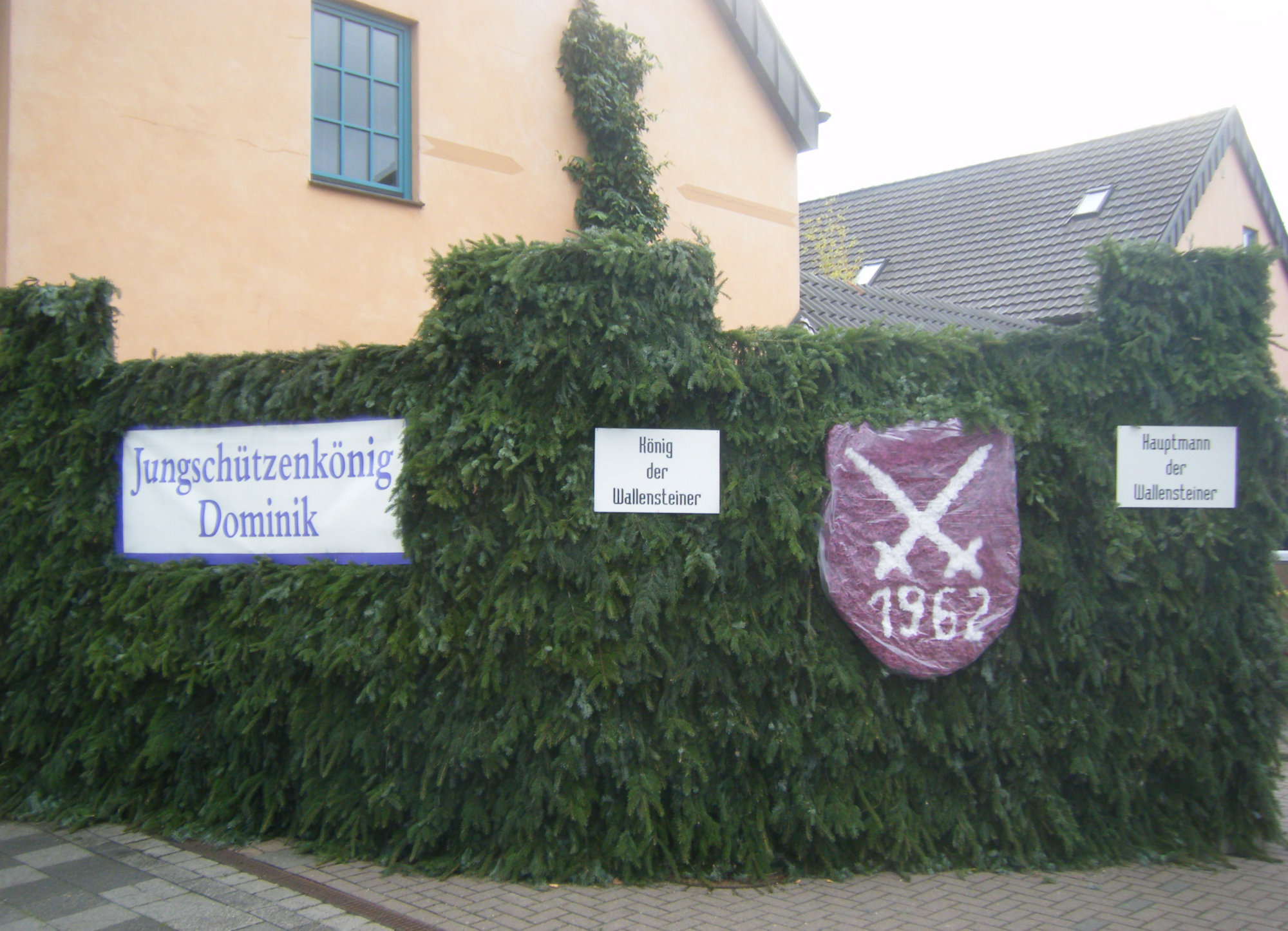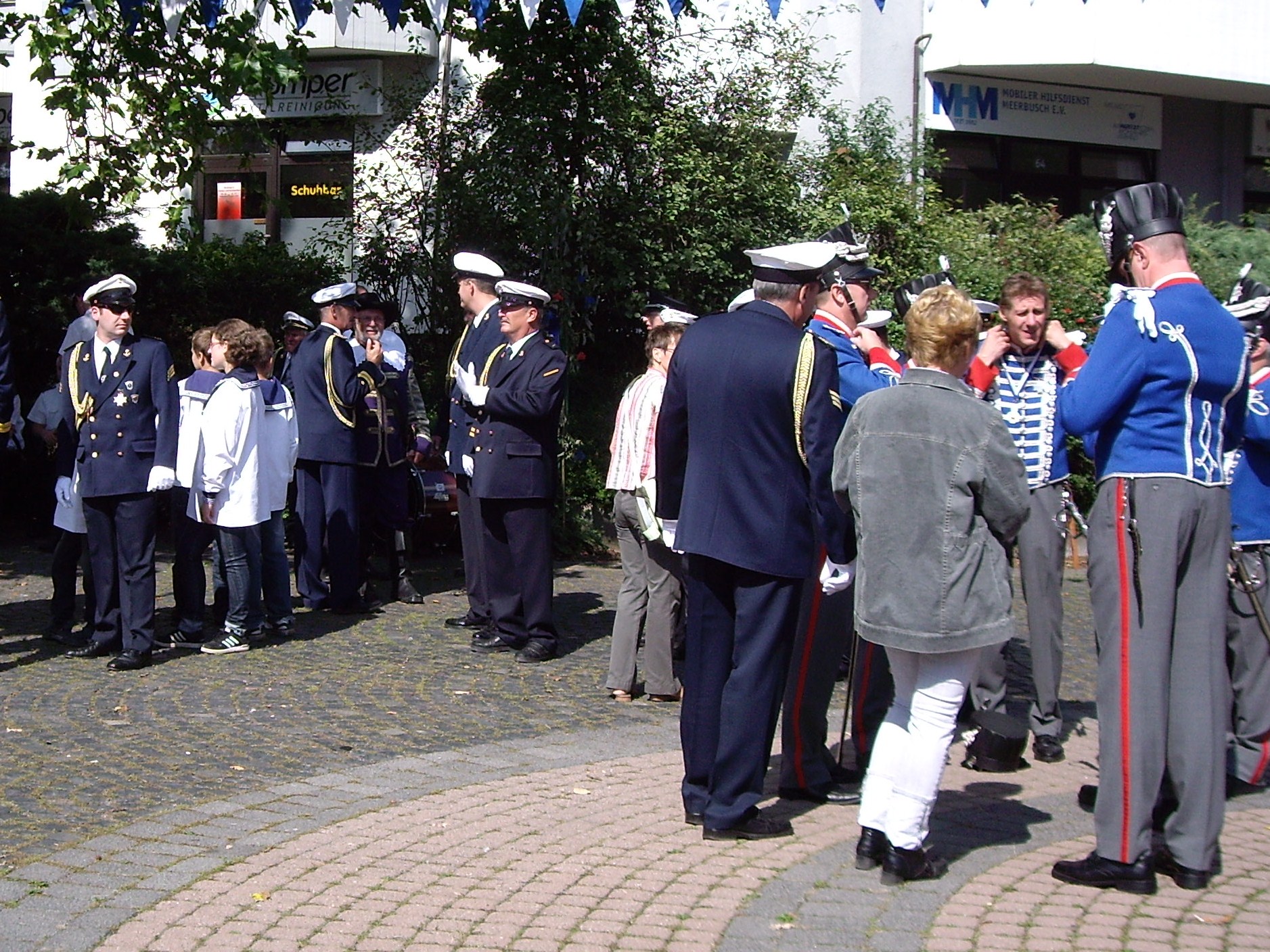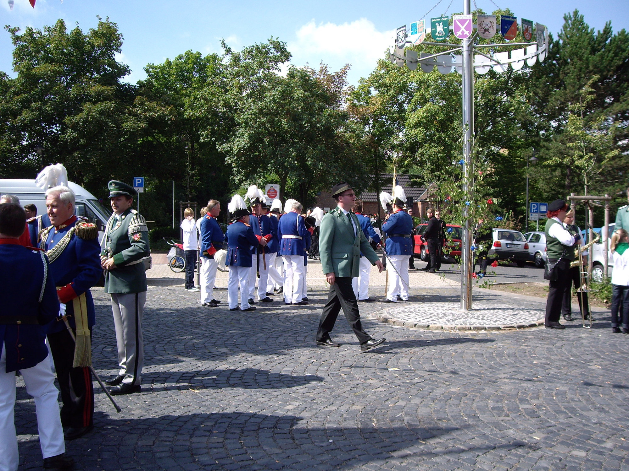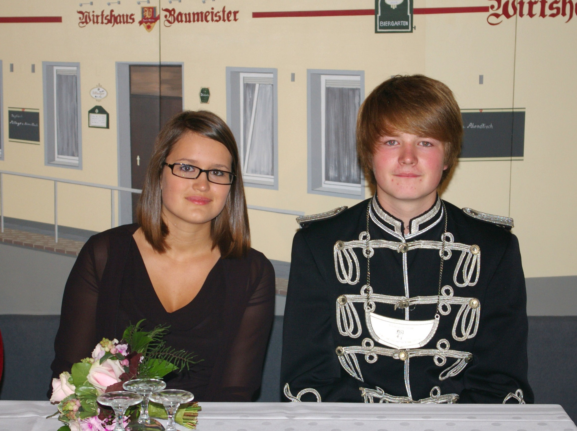 unten v.l.: Mundschenk Michael Grimm, Jungschützenkönigspaar Dominik Blömer und Linda Pukropski, Hofdamen Marie Giesler, Jayde Watton, Sophie Webers und Maureen Paas, Kinderprinzenpaar Linus Debüser und Sofia Steinfort, Standartenträger Maximilian Crieé