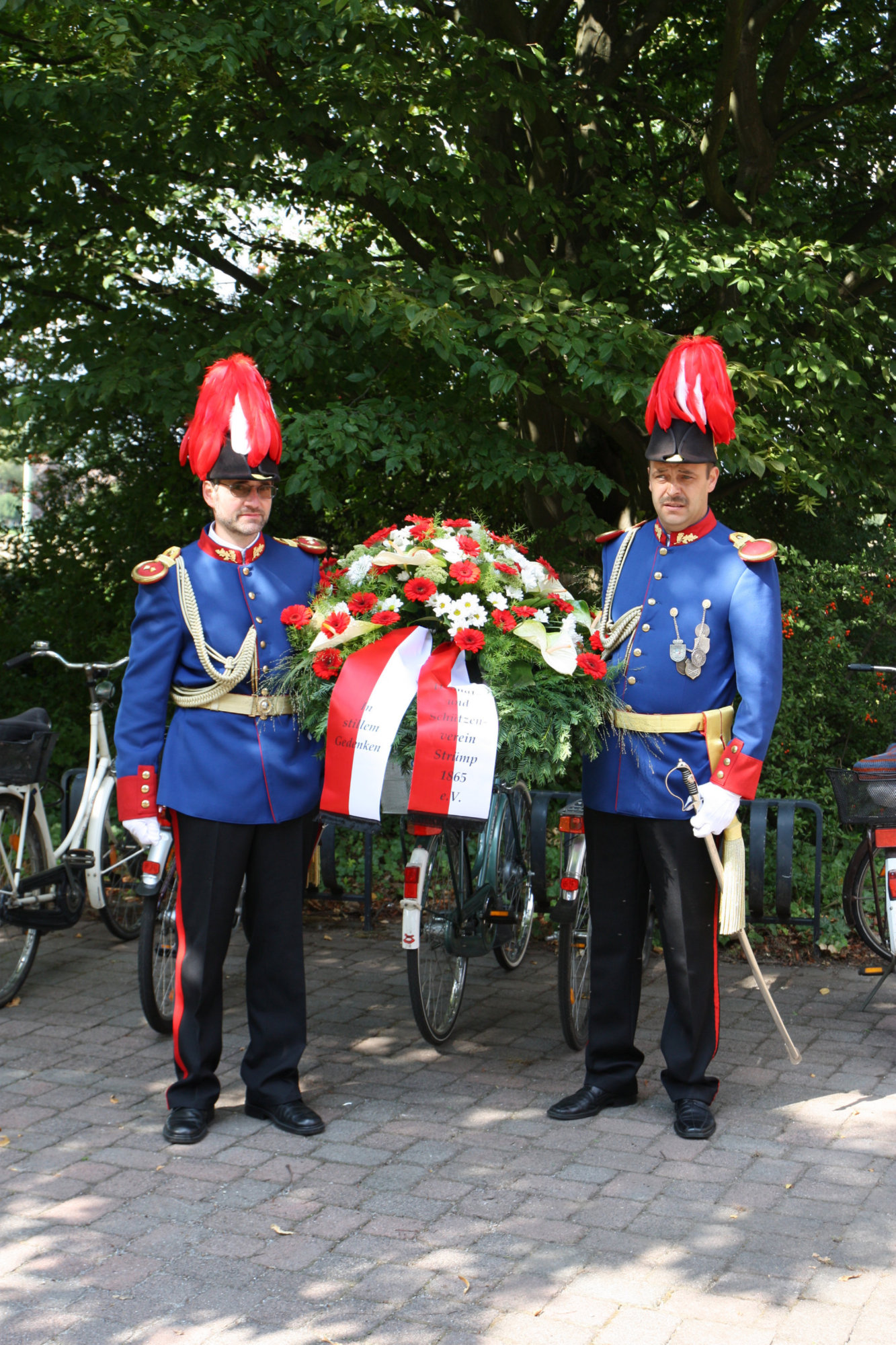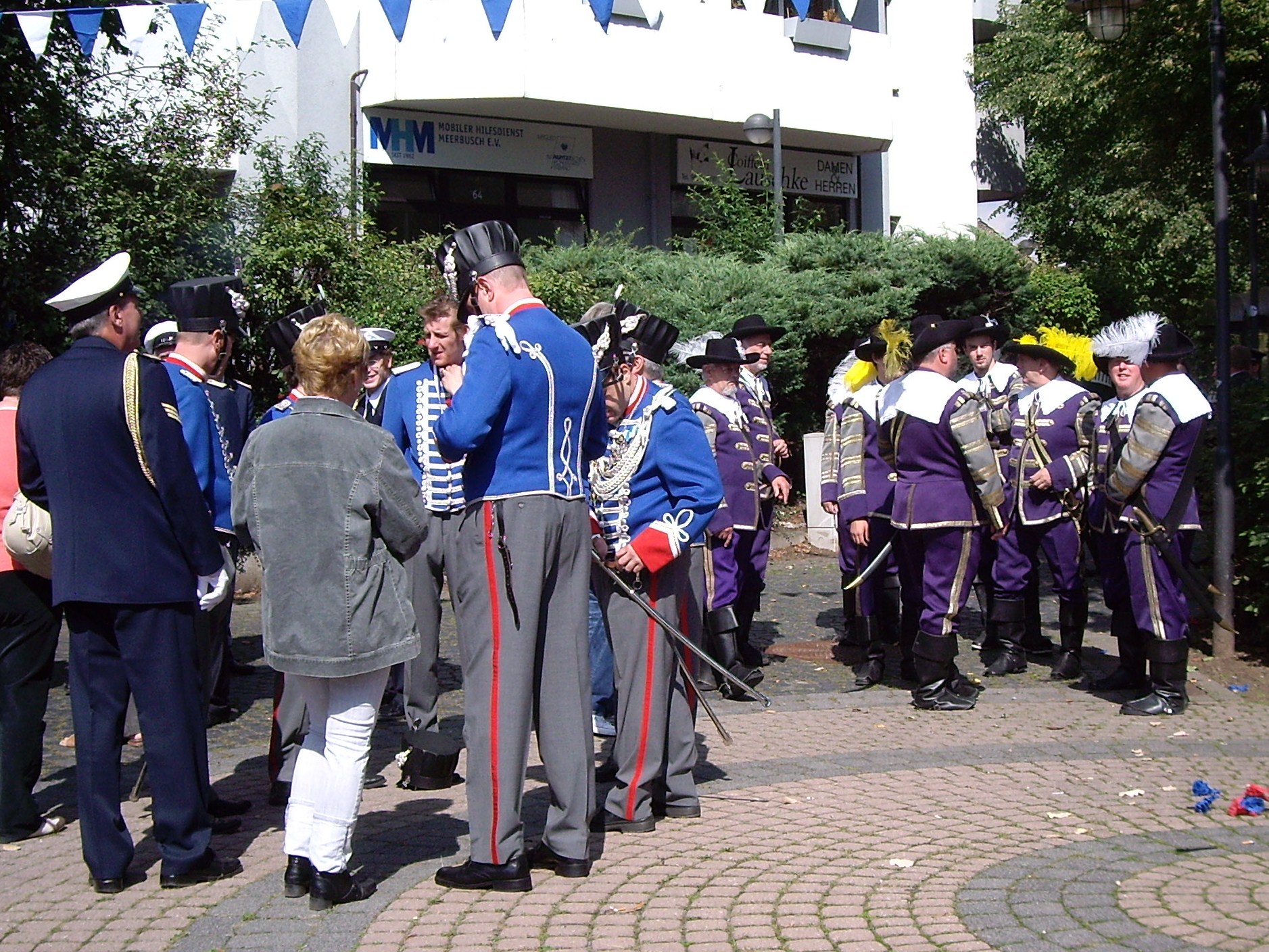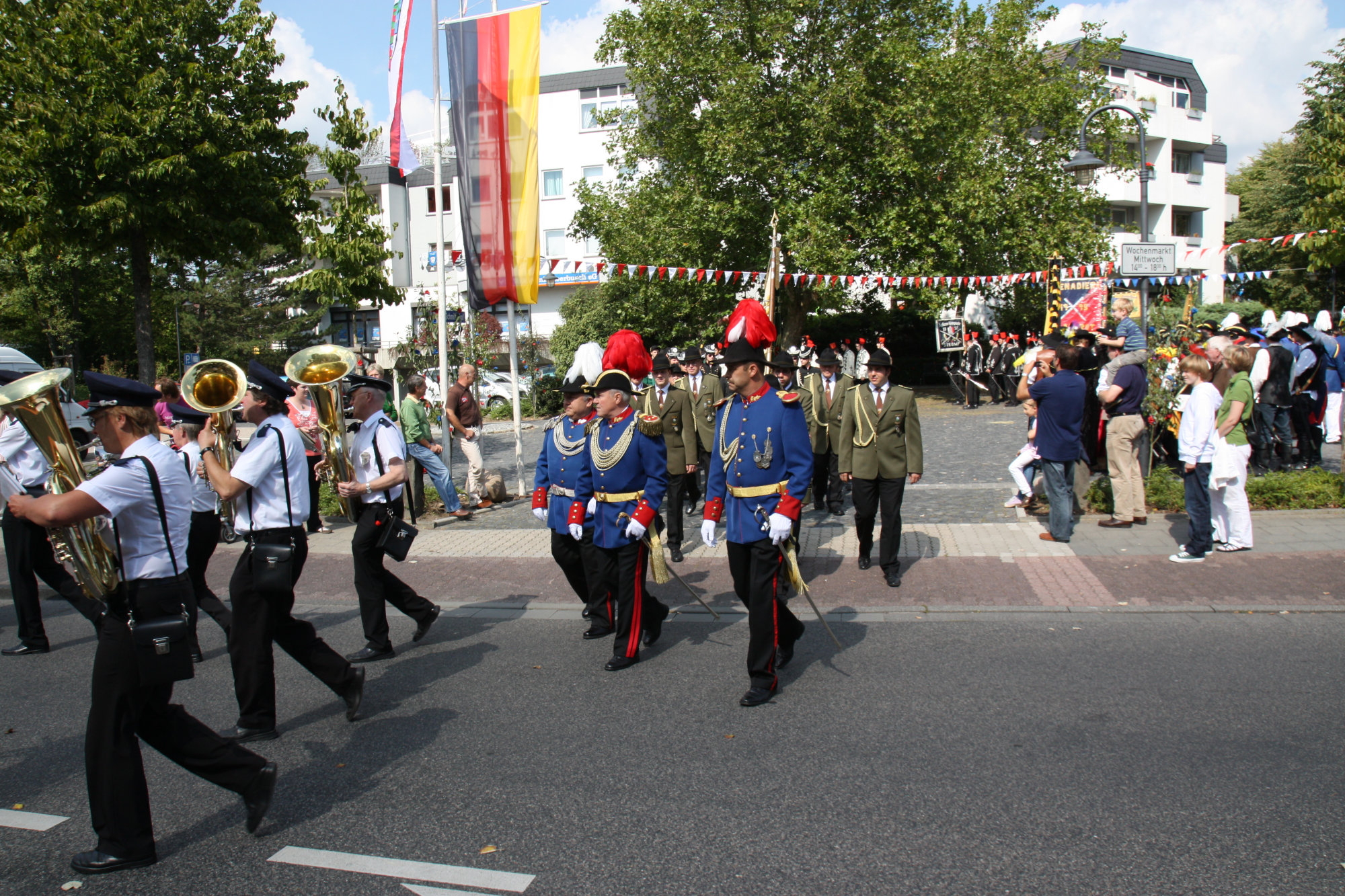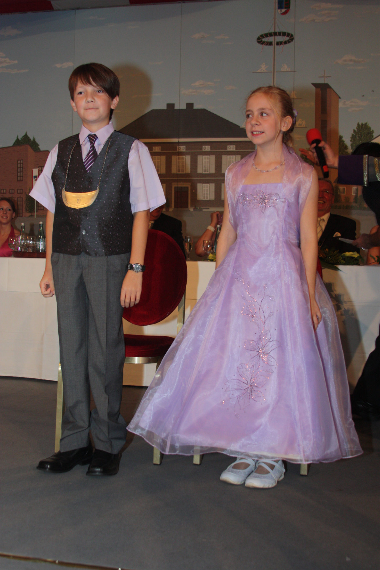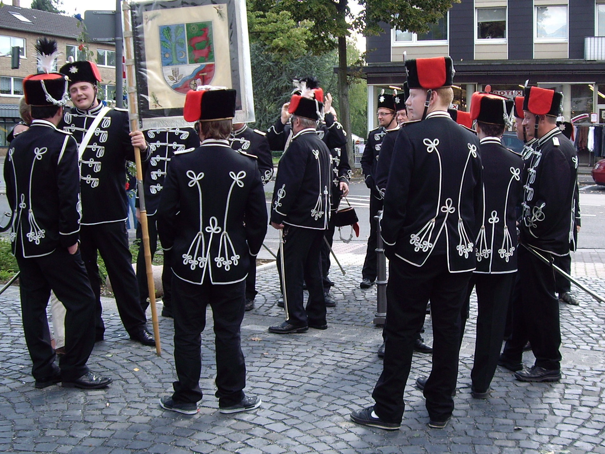 unten v.l.: Mundschenk Michael Grimm, Jungschützenkönigspaar Dominik Blömer und Linda Pukropski, Hofdamen Marie Giesler, Jayde Watton, Sophie Webers und Maureen Paas, Kinderprinzenpaar Linus Debüser und Sofia Steinfort, Standartenträger Maximilian Crieé