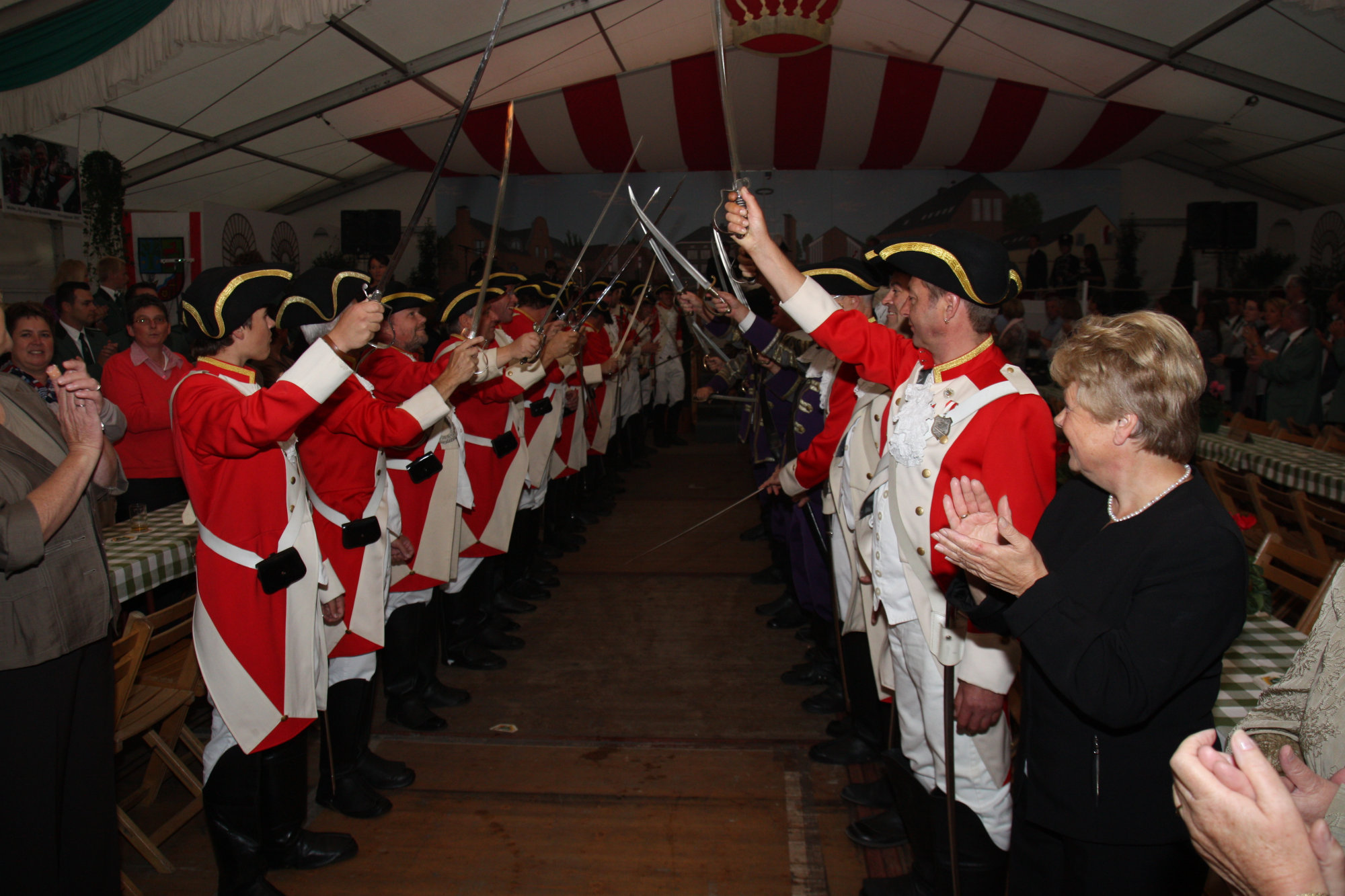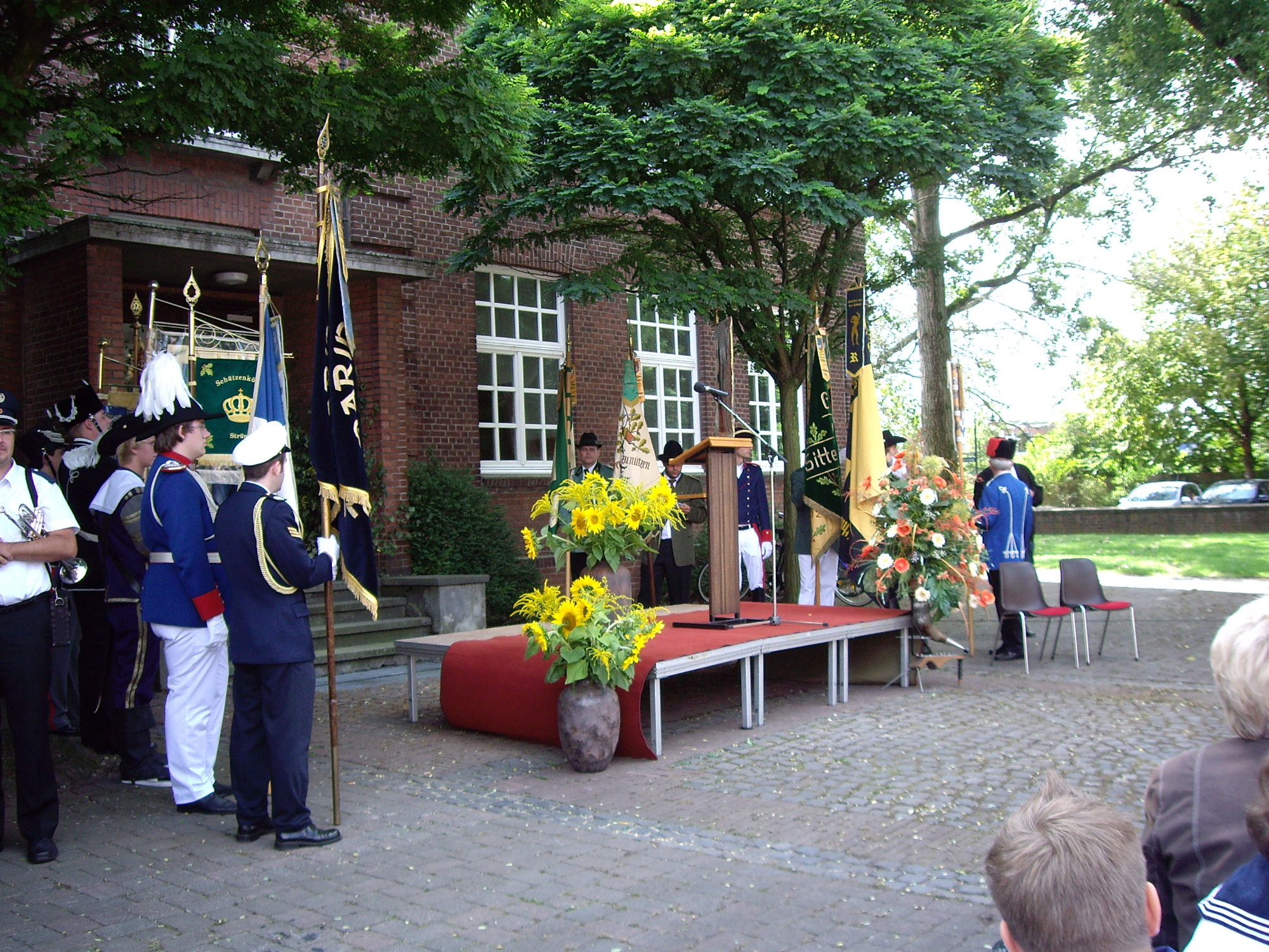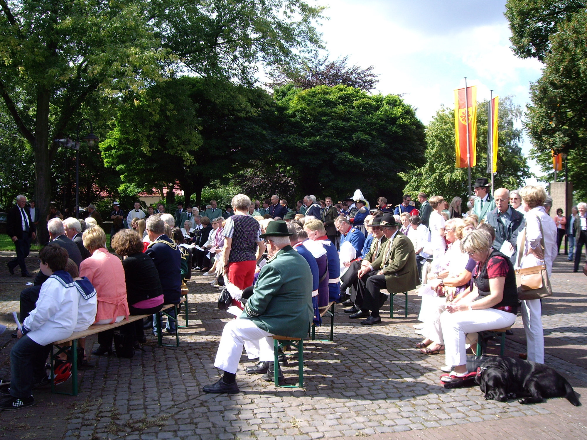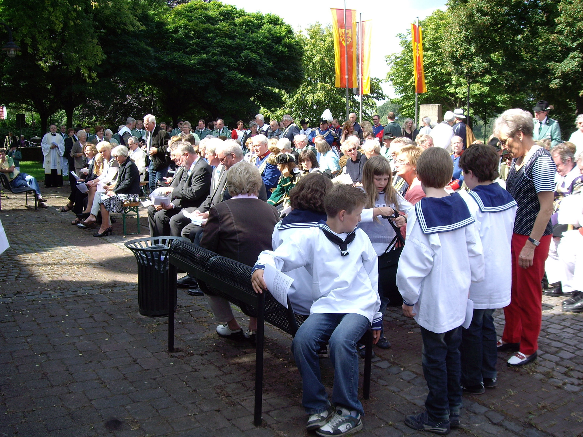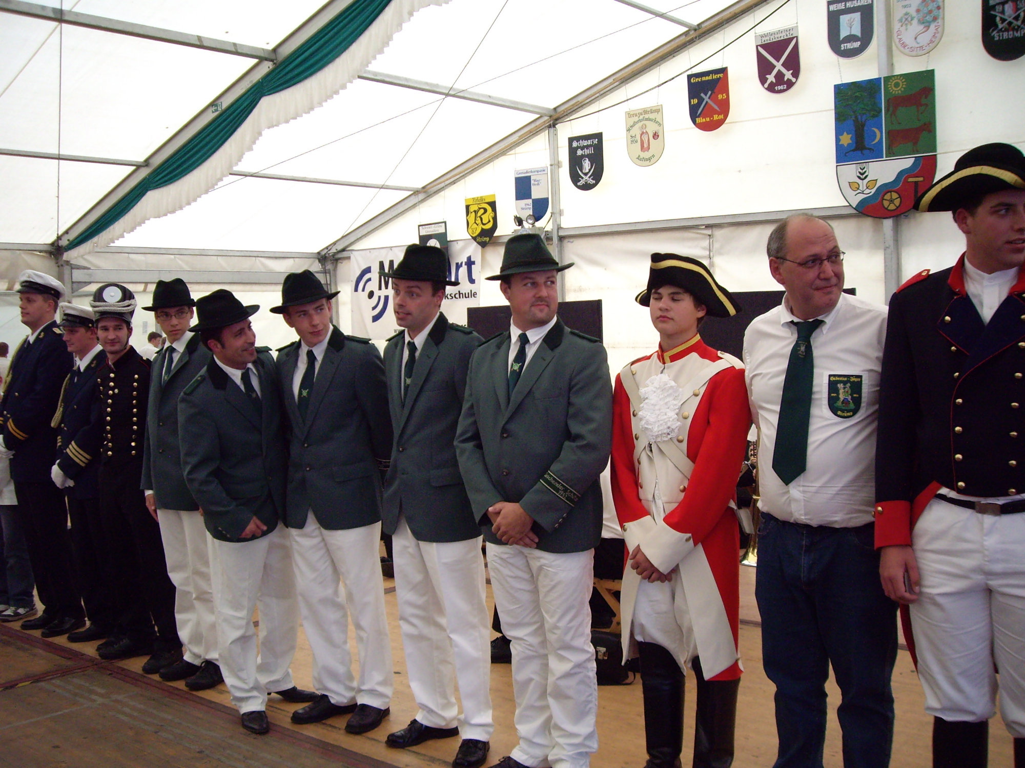 unten v.l.: Mundschenk Michael Grimm, Jungschützenkönigspaar Dominik Blömer und Linda Pukropski, Hofdamen Marie Giesler, Jayde Watton, Sophie Webers und Maureen Paas, Kinderprinzenpaar Linus Debüser und Sofia Steinfort, Standartenträger Maximilian Crieé