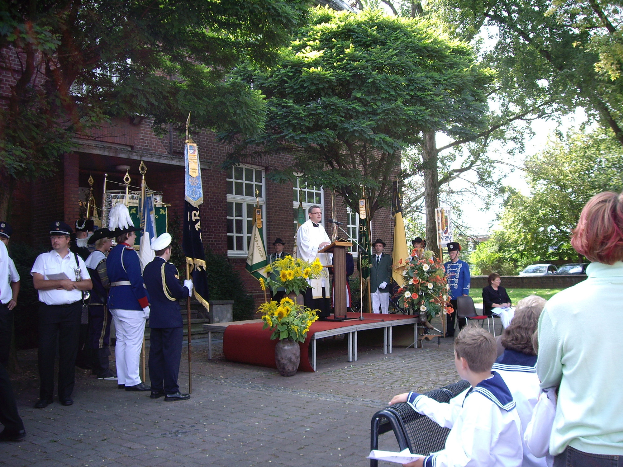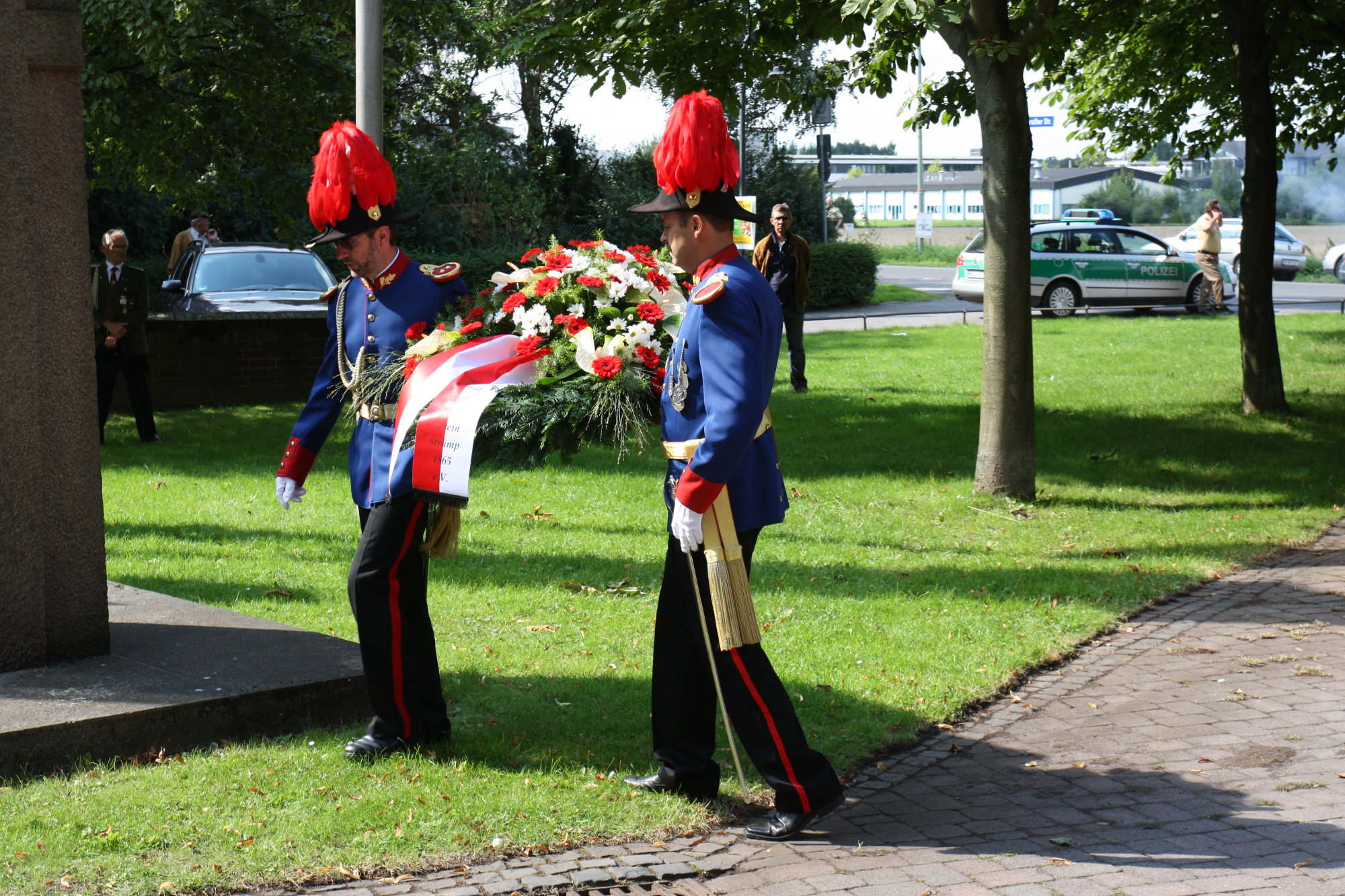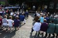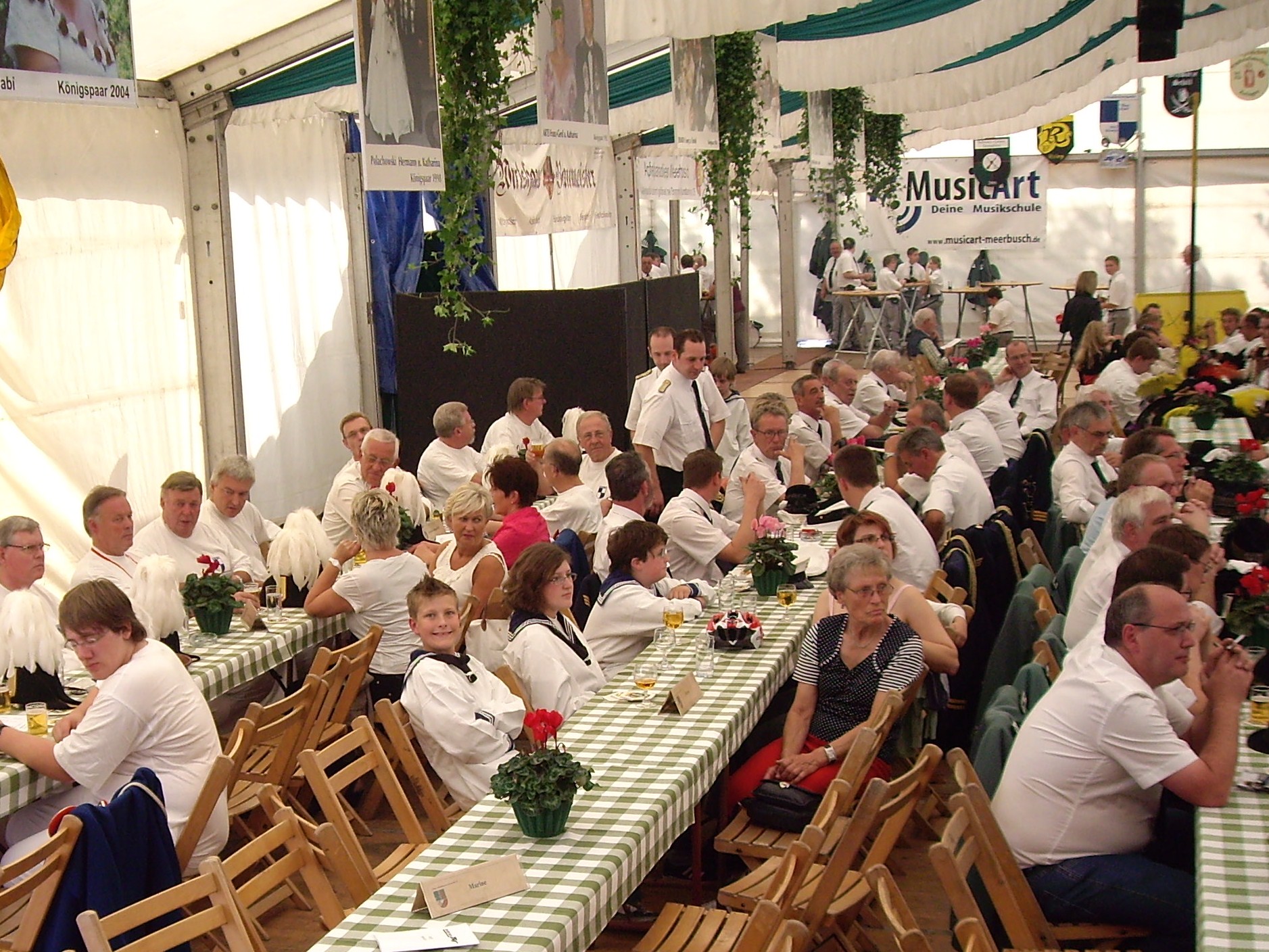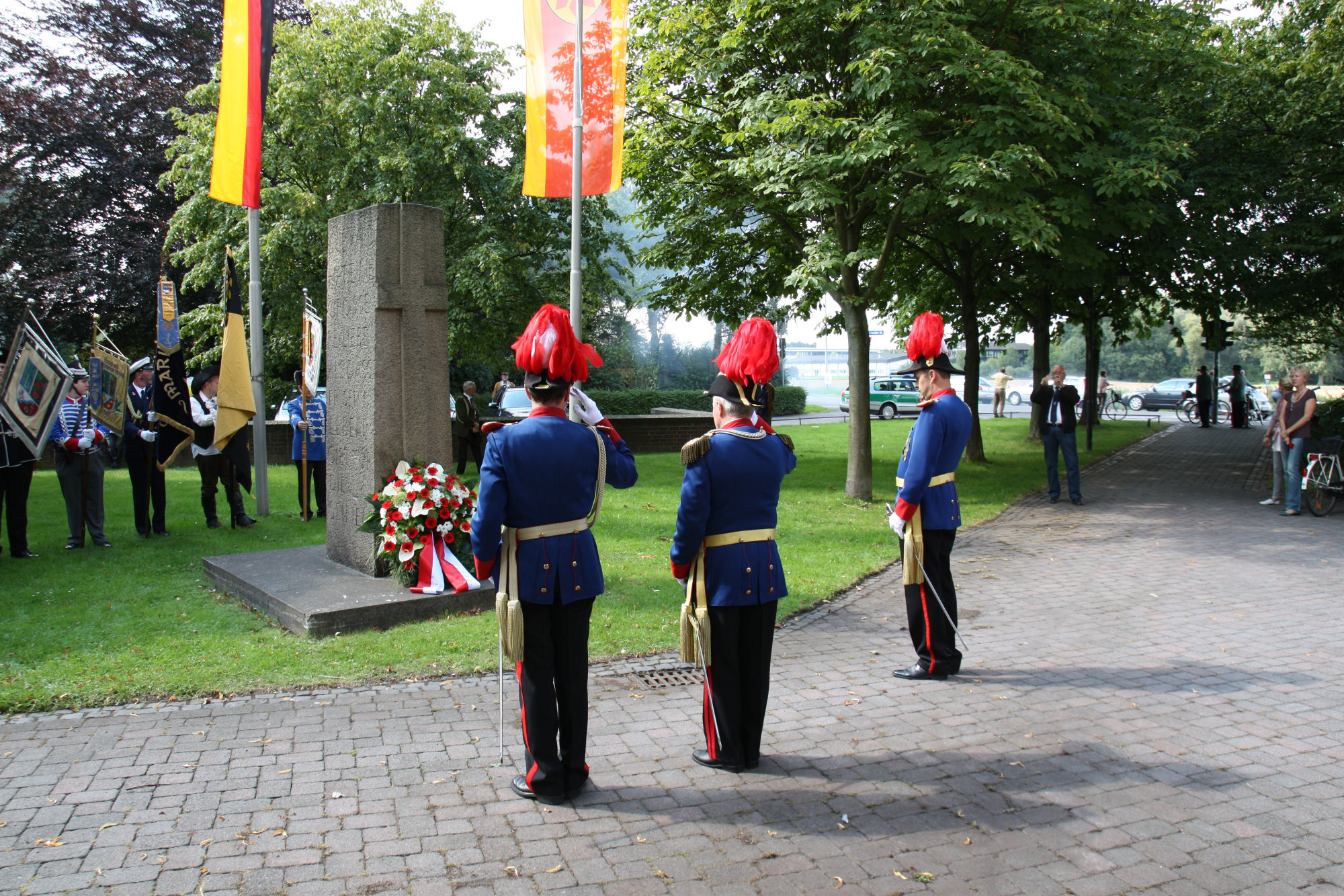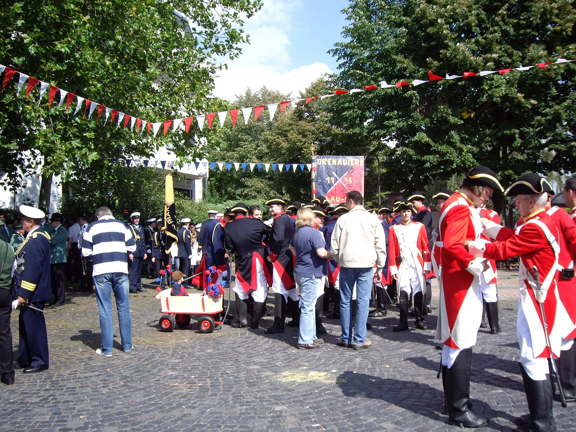 unten v.l.: Mundschenk Michael Grimm, Jungschützenkönigspaar Dominik Blömer und Linda Pukropski, Hofdamen Marie Giesler, Jayde Watton, Sophie Webers und Maureen Paas, Kinderprinzenpaar Linus Debüser und Sofia Steinfort, Standartenträger Maximilian Crieé