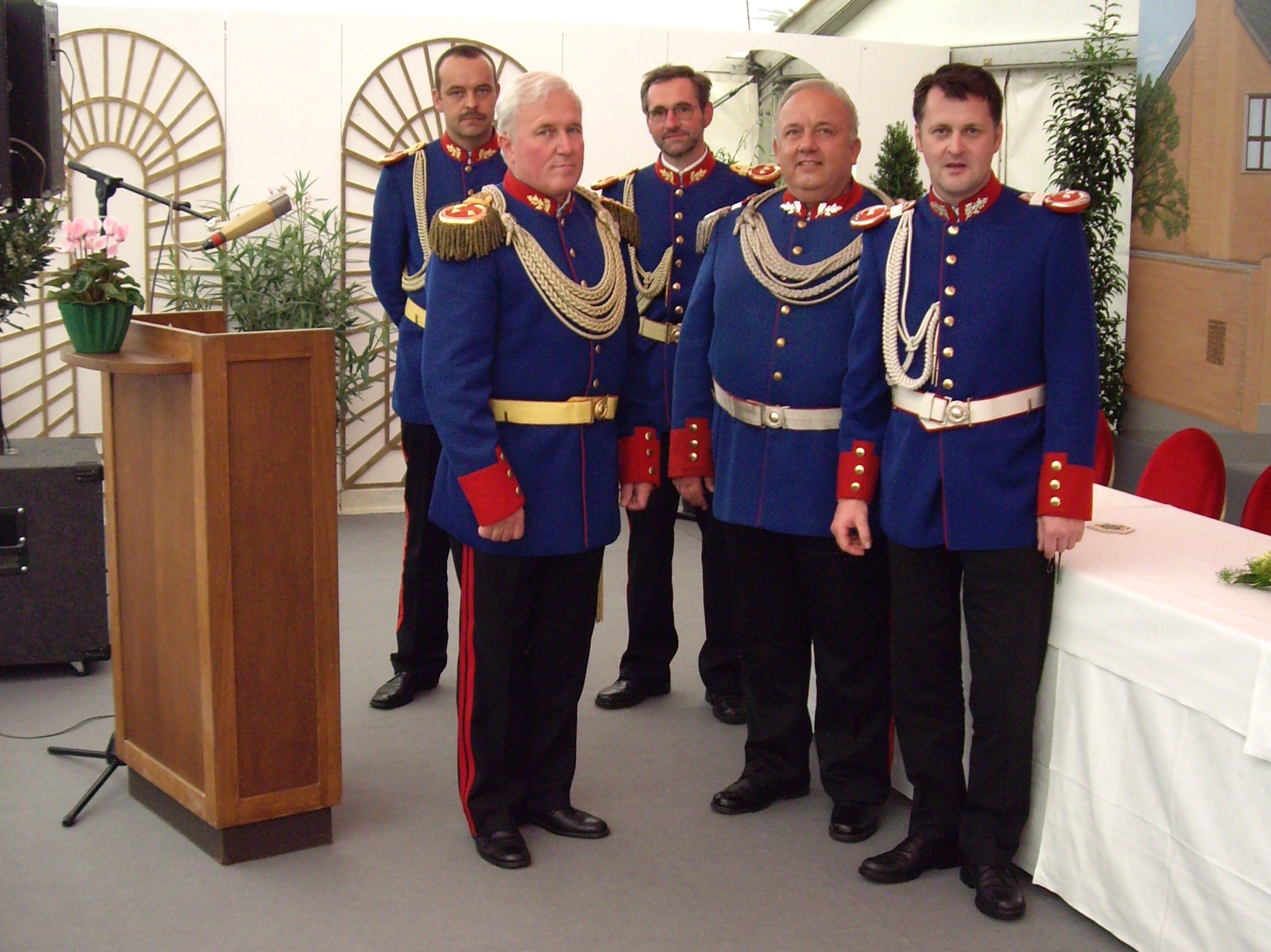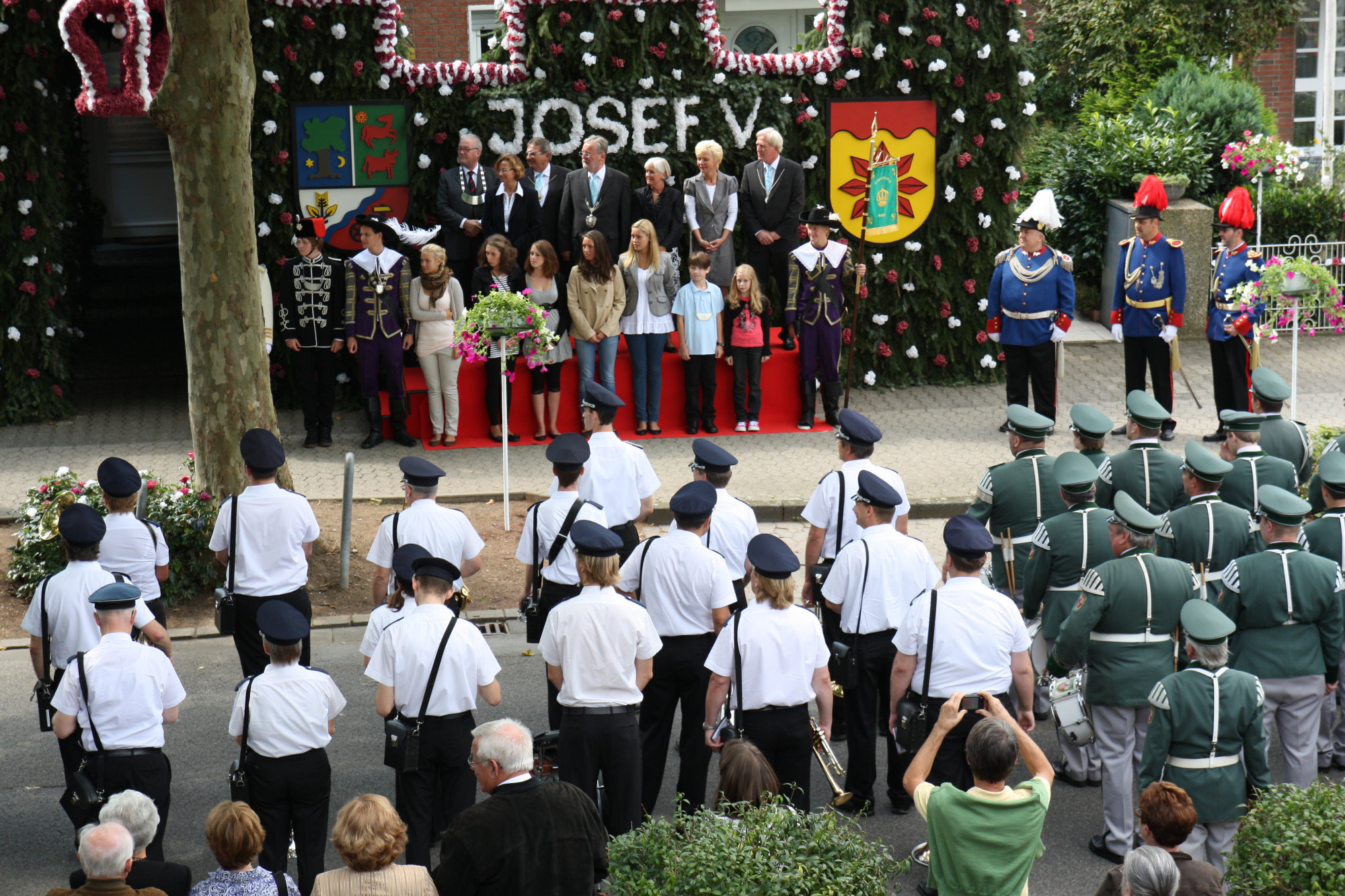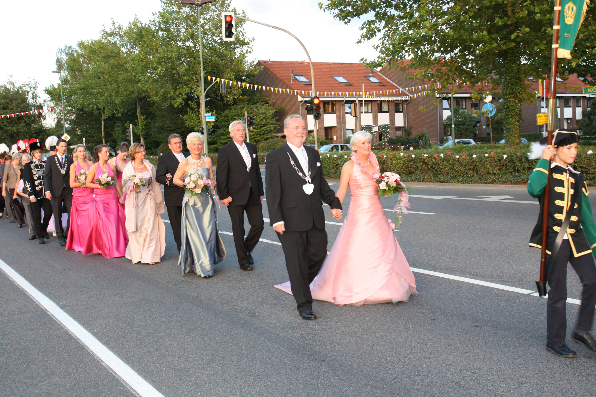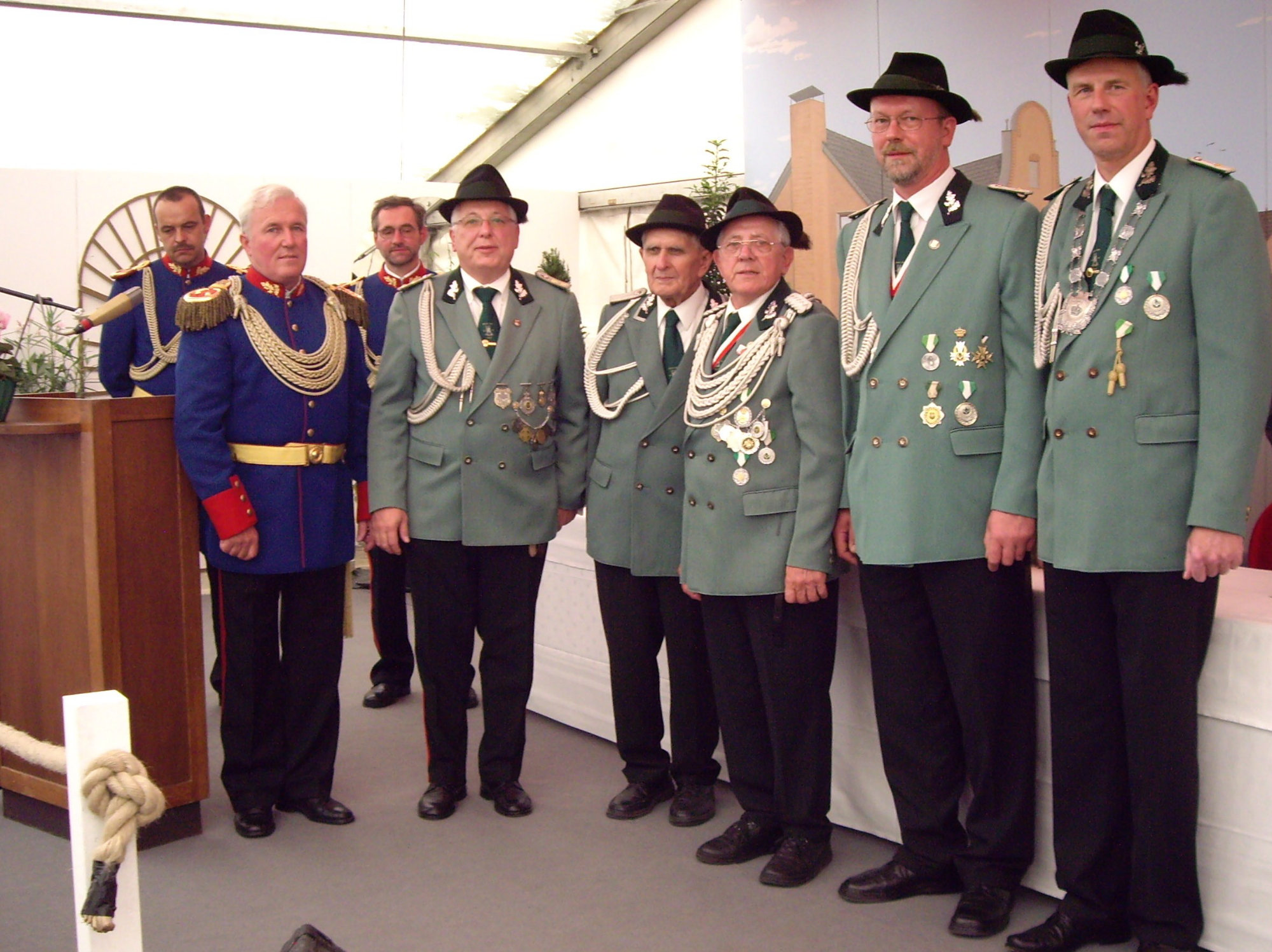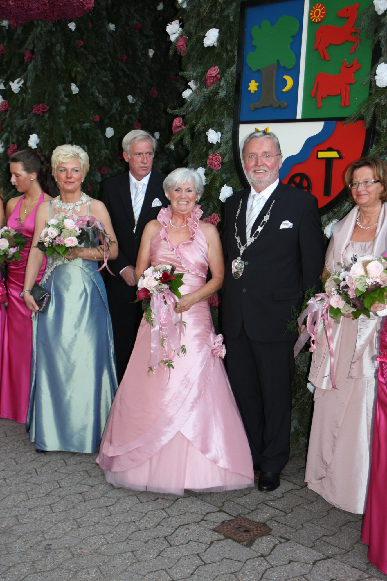 bei der Serenade vor der Königsburgoben v.l.: Präsident Karl-Heinz Rütten, Ministerpaar Christine und Matthias Vieten, Königspaar Josef und Marlene Arts, Ministerpaar Claudia Sparla und Herbert Baumeister