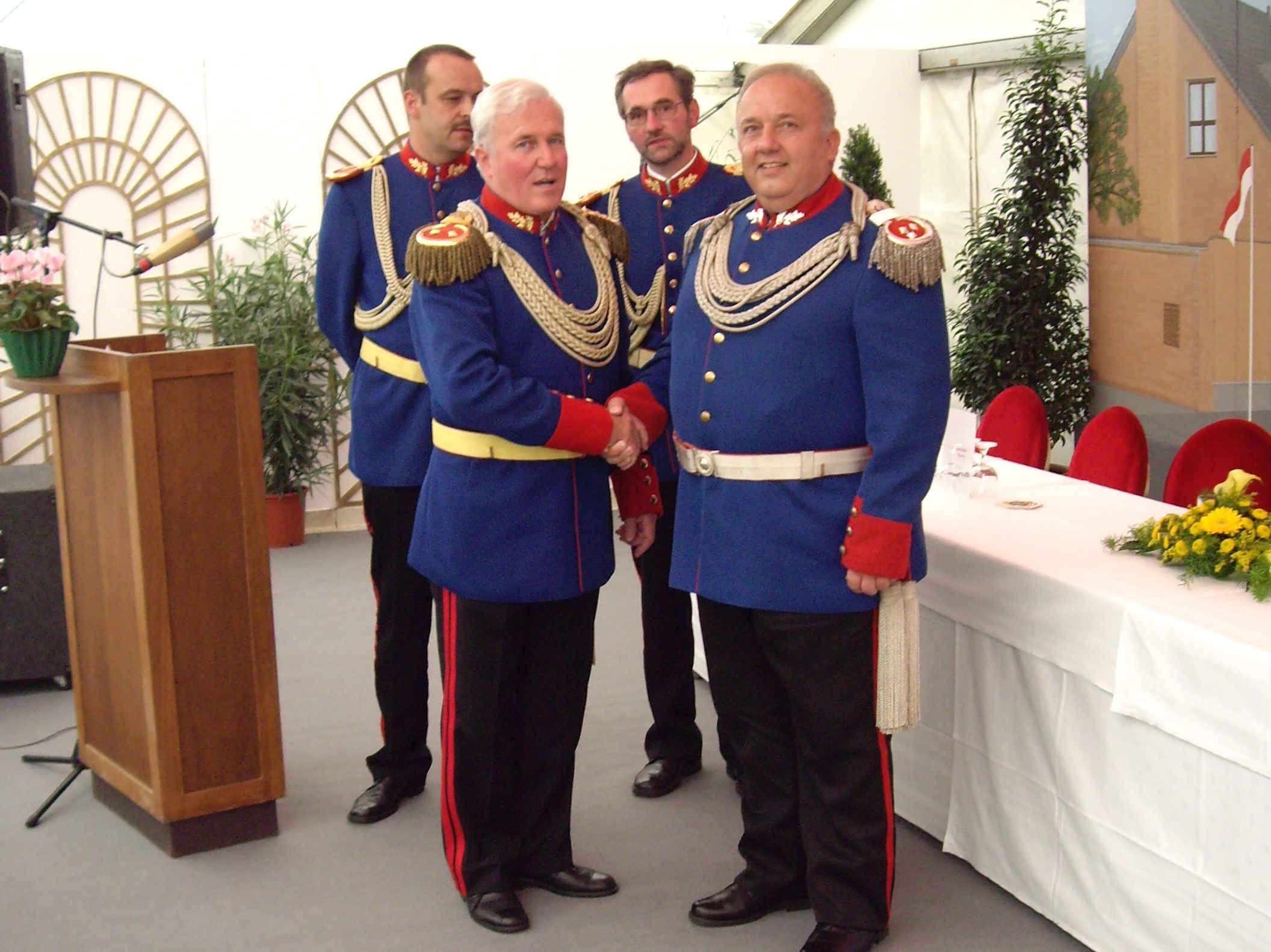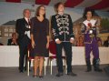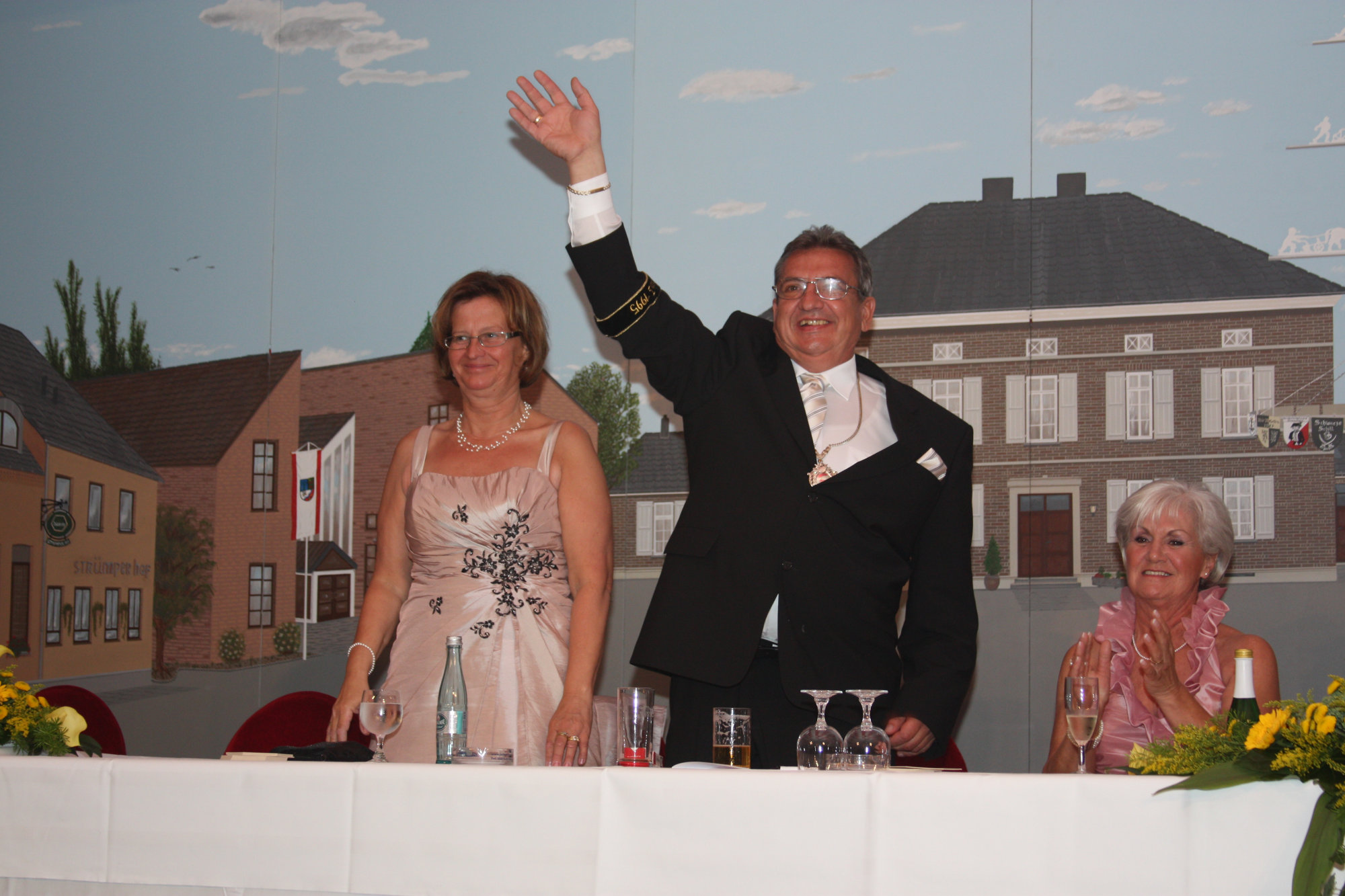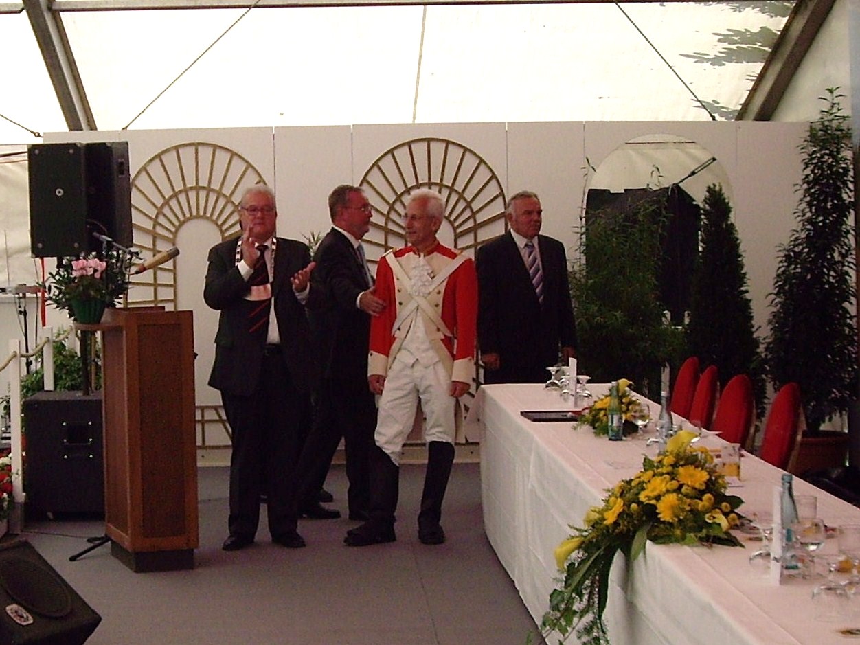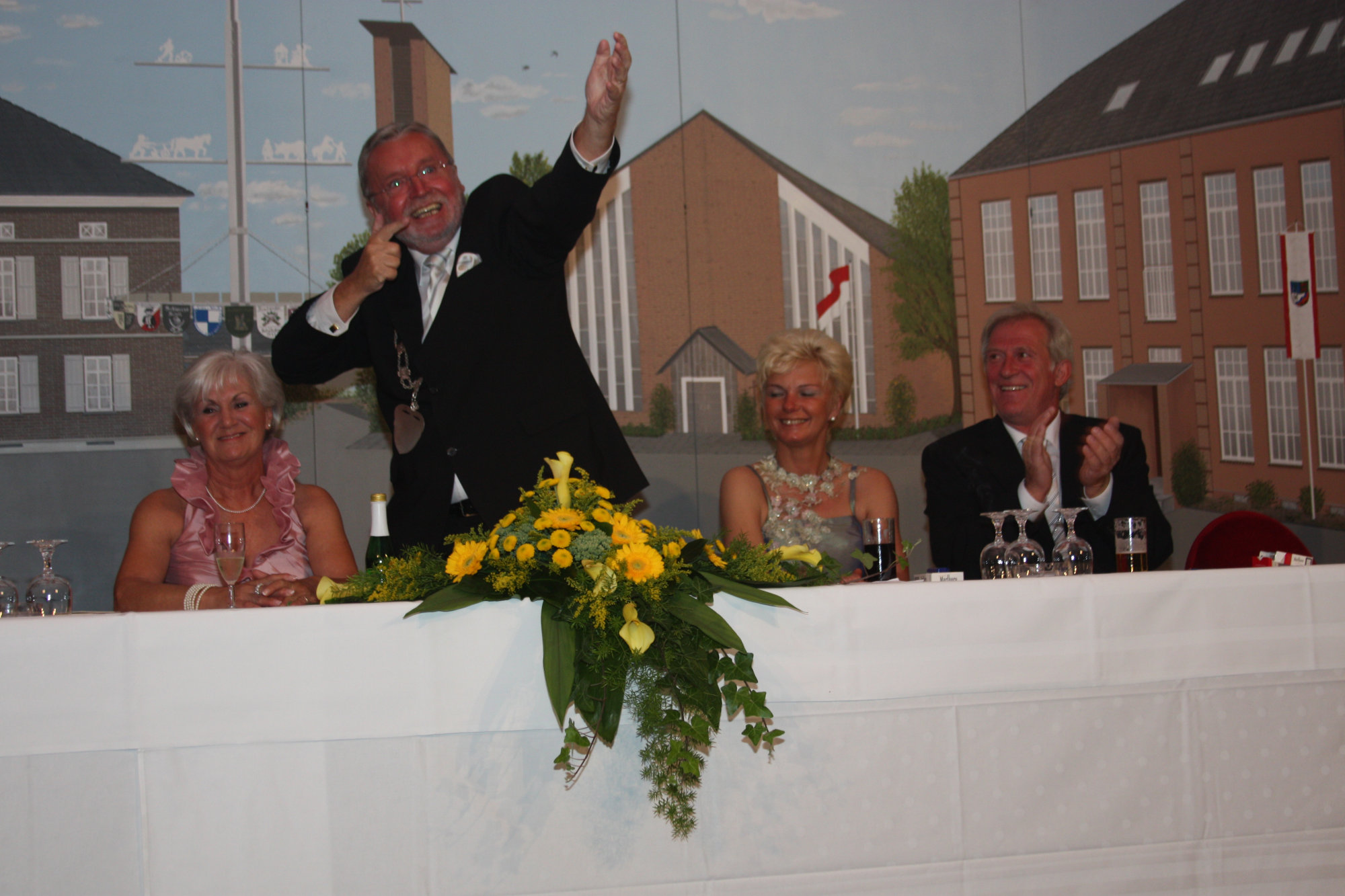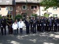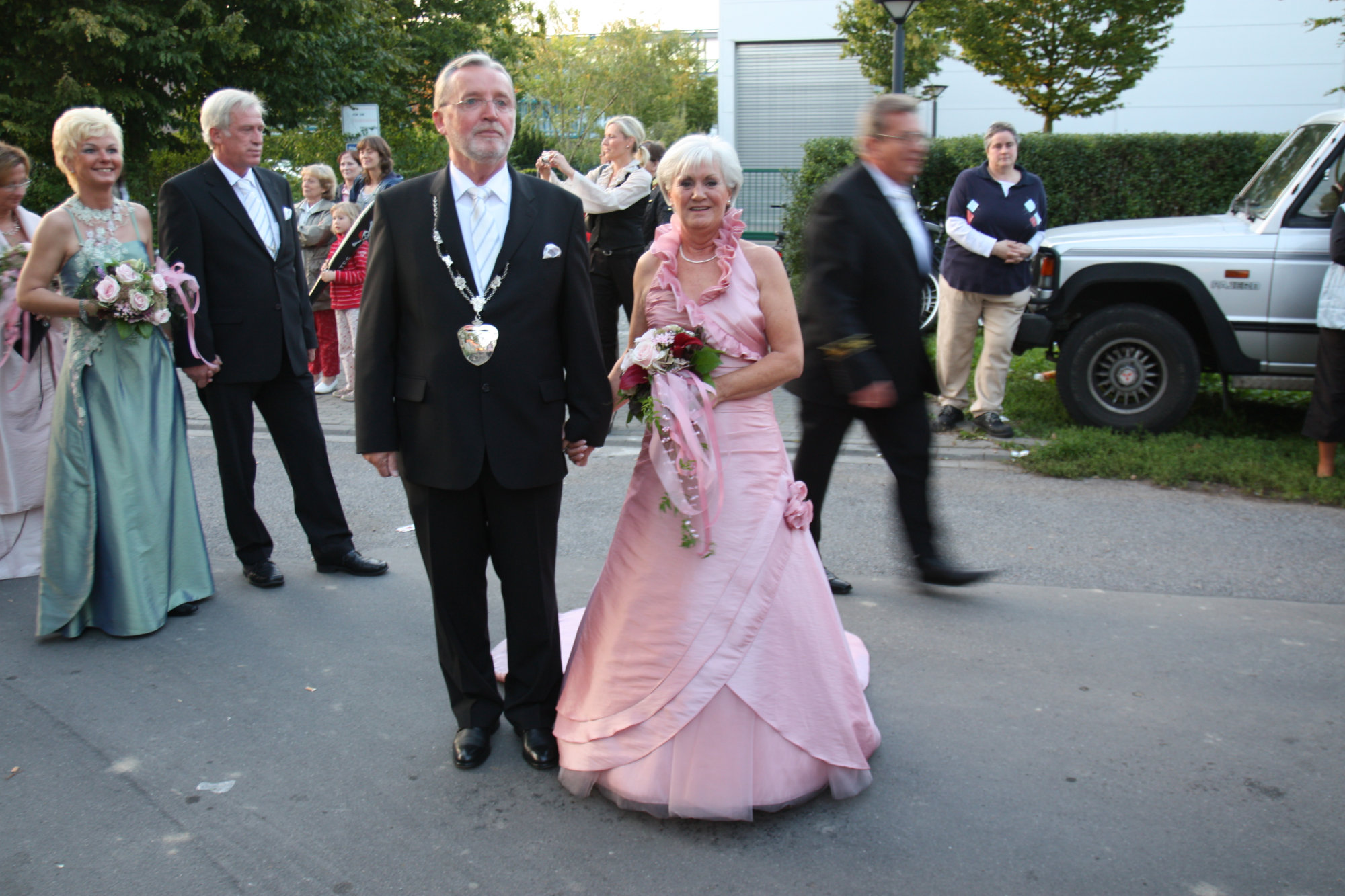bei der Serenade vor der Königsburgoben v.l.: Präsident Karl-Heinz Rütten, Ministerpaar Christine und Matthias Vieten, Königspaar Josef und Marlene Arts, Ministerpaar Claudia Sparla und Herbert Baumeister