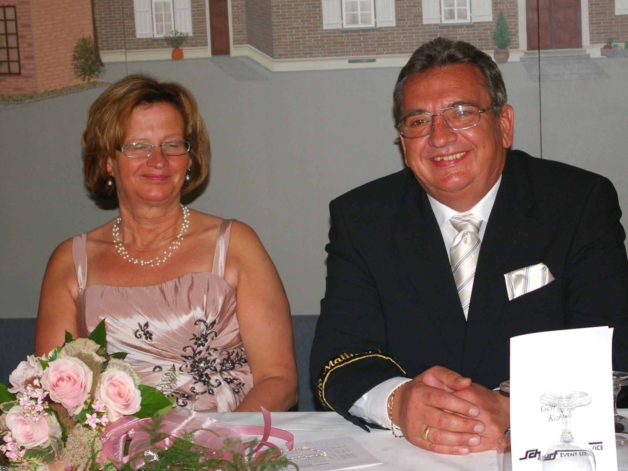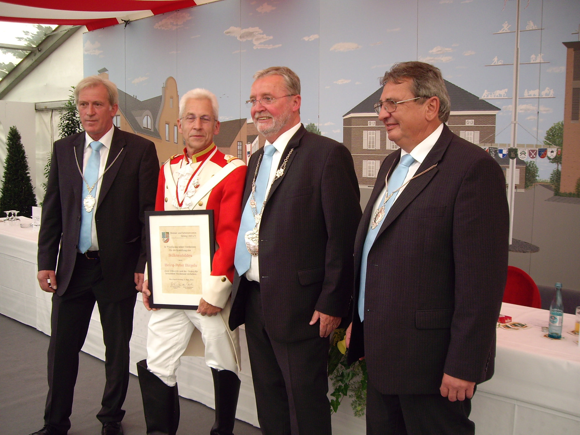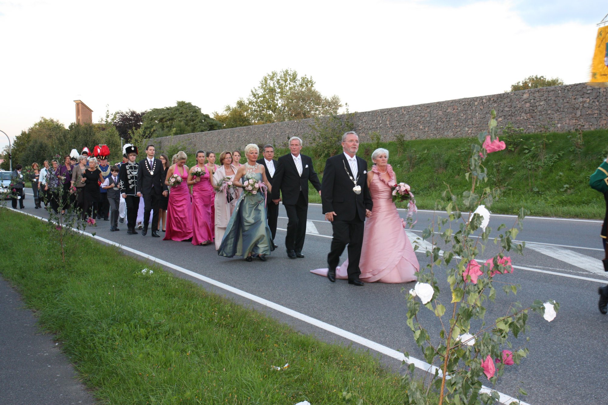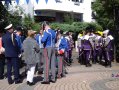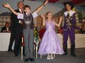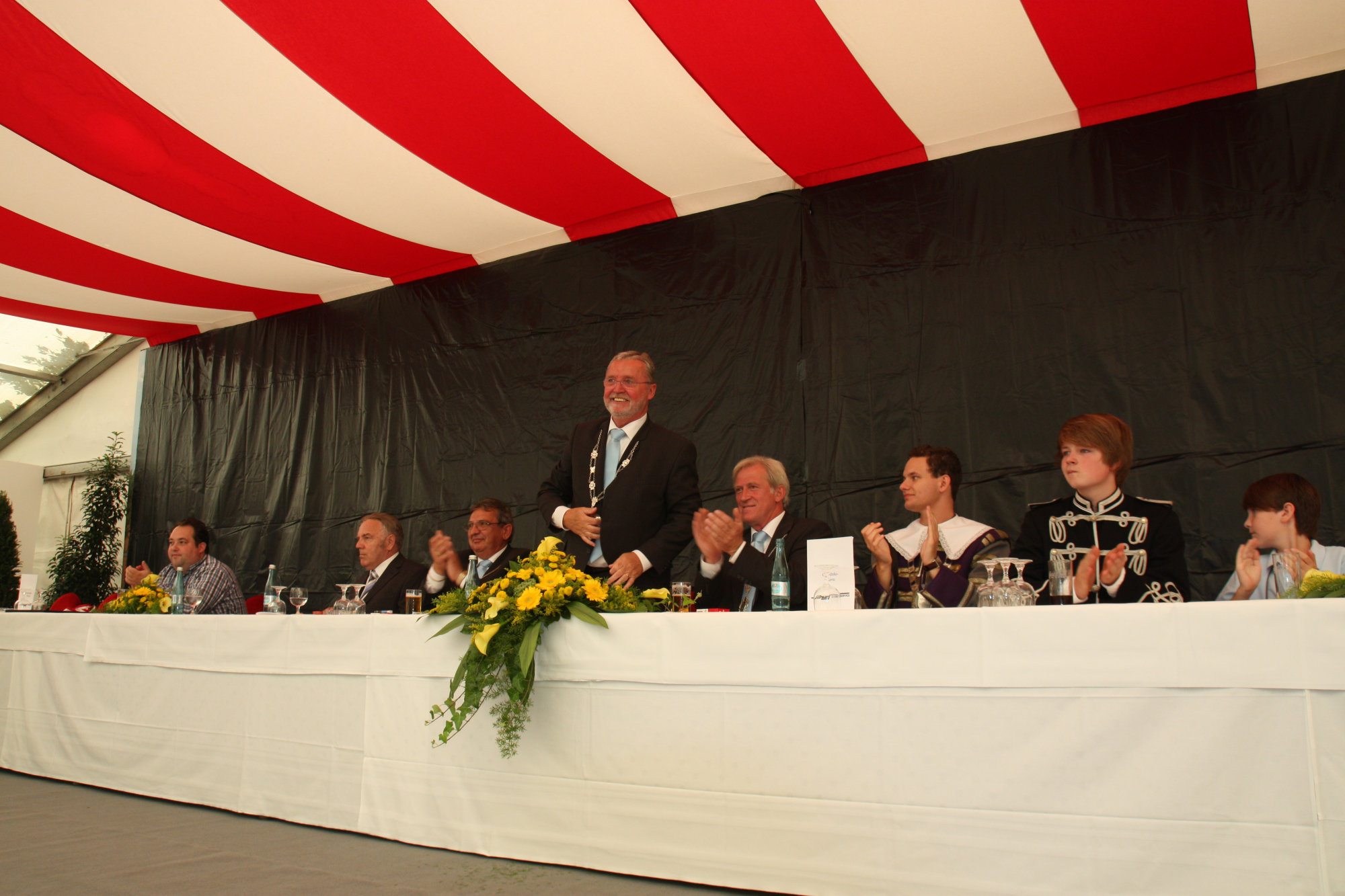bei der Serenade vor der Königsburgoben v.l.: Präsident Karl-Heinz Rütten, Ministerpaar Christine und Matthias Vieten, Königspaar Josef und Marlene Arts, Ministerpaar Claudia Sparla und Herbert Baumeister
