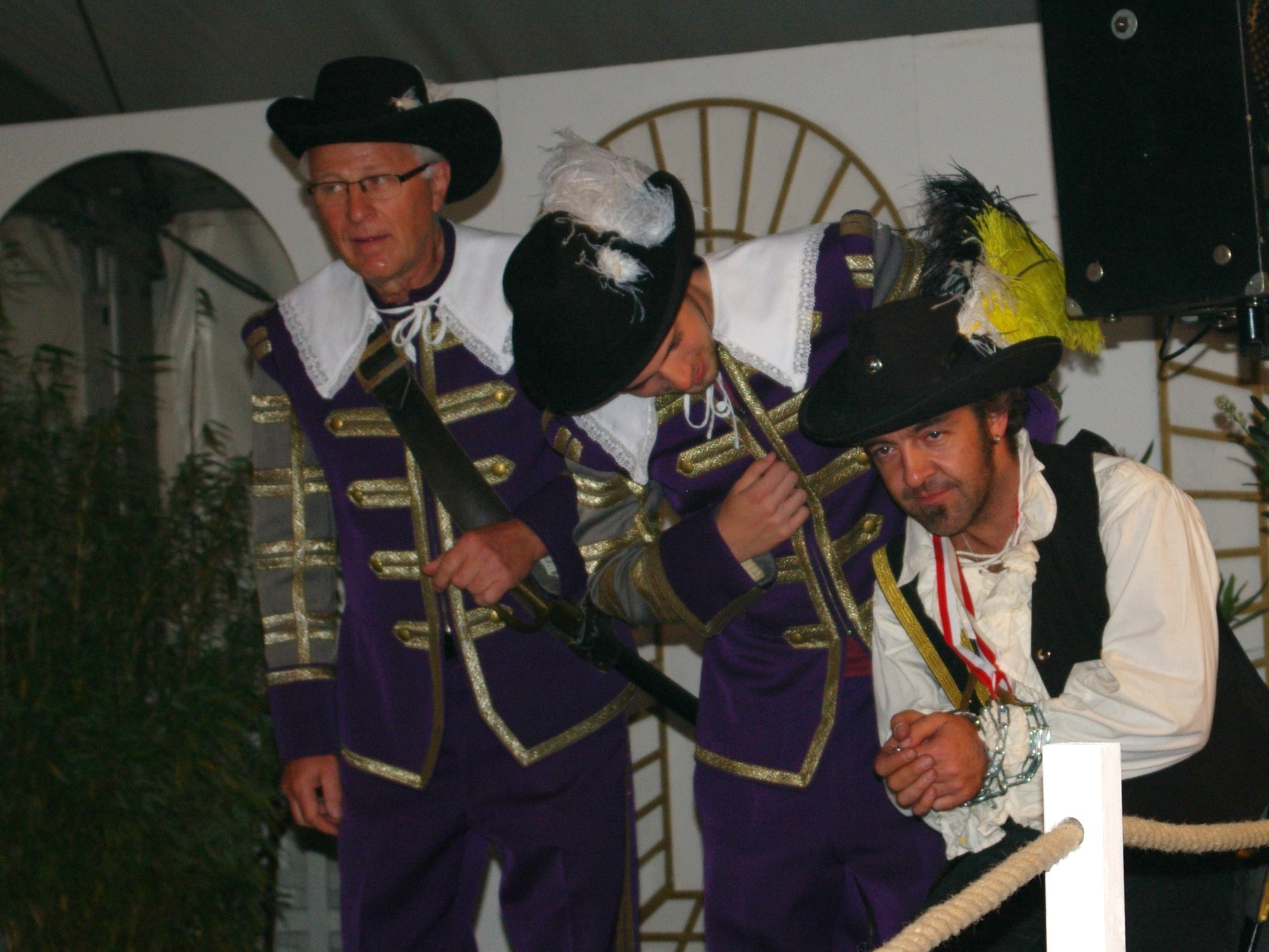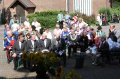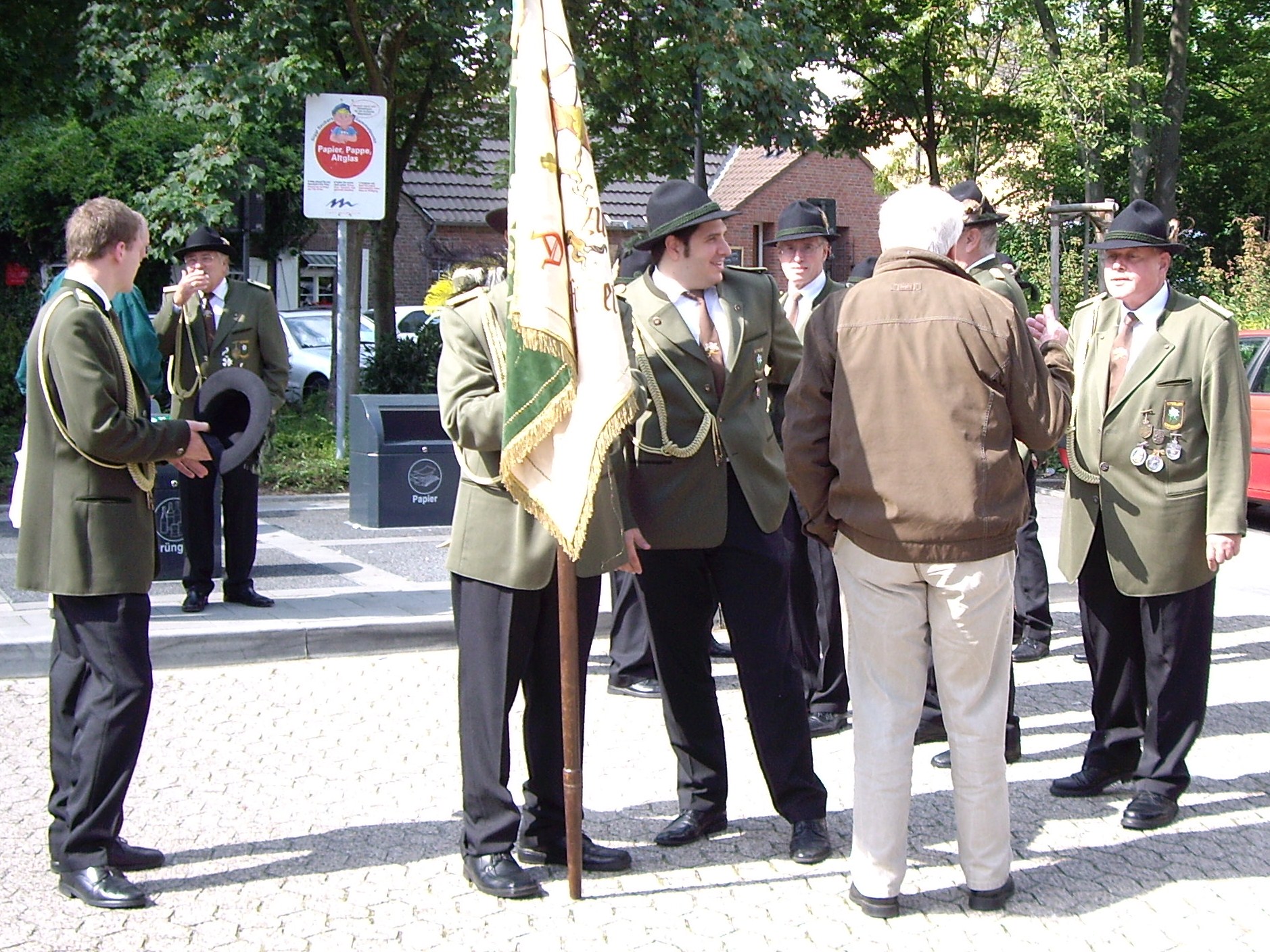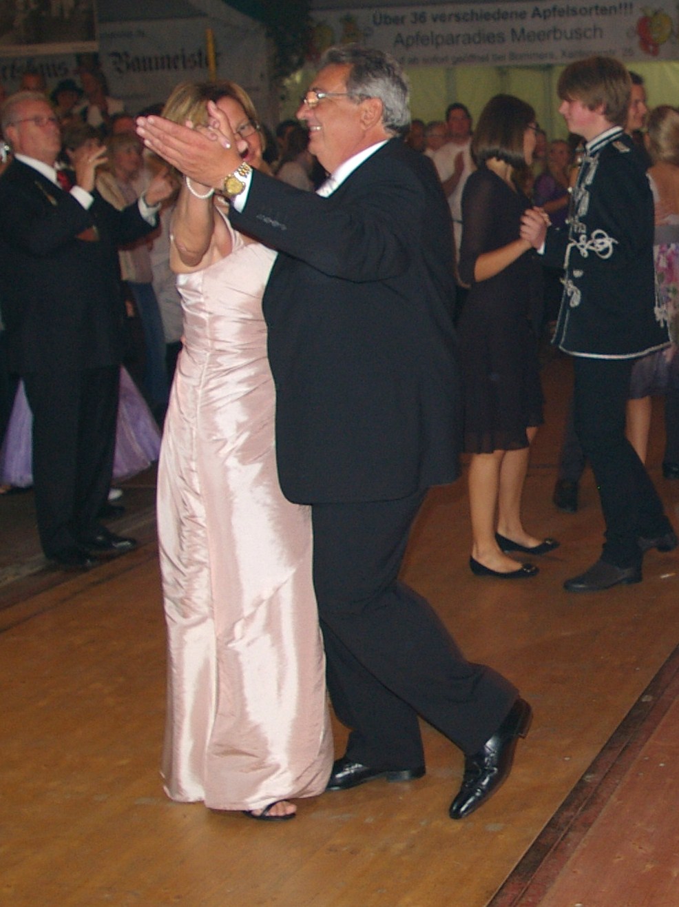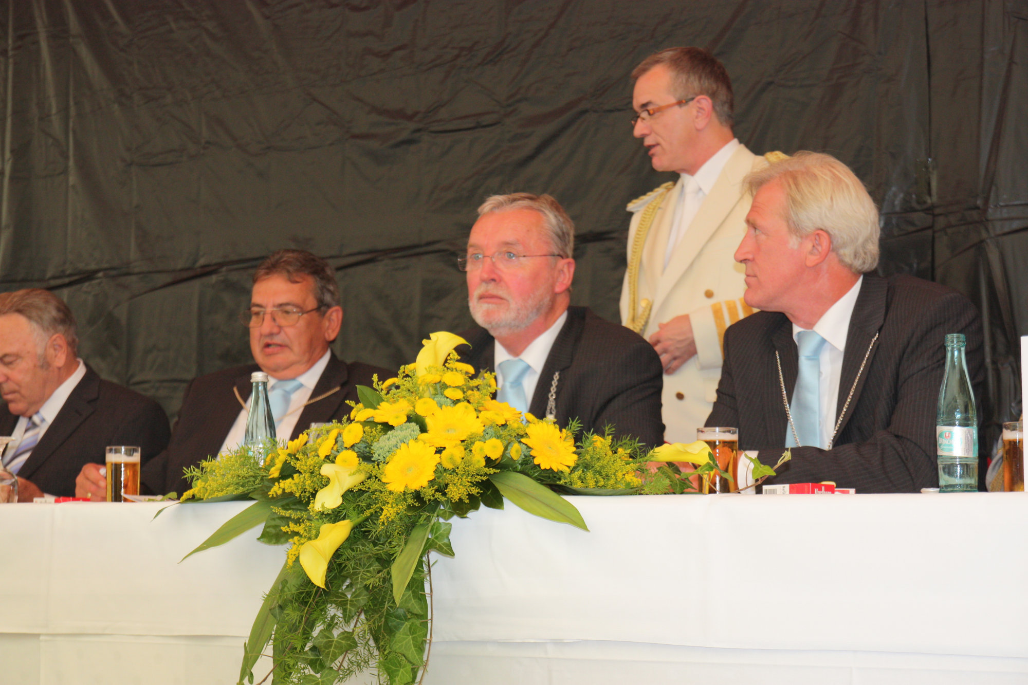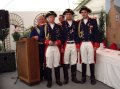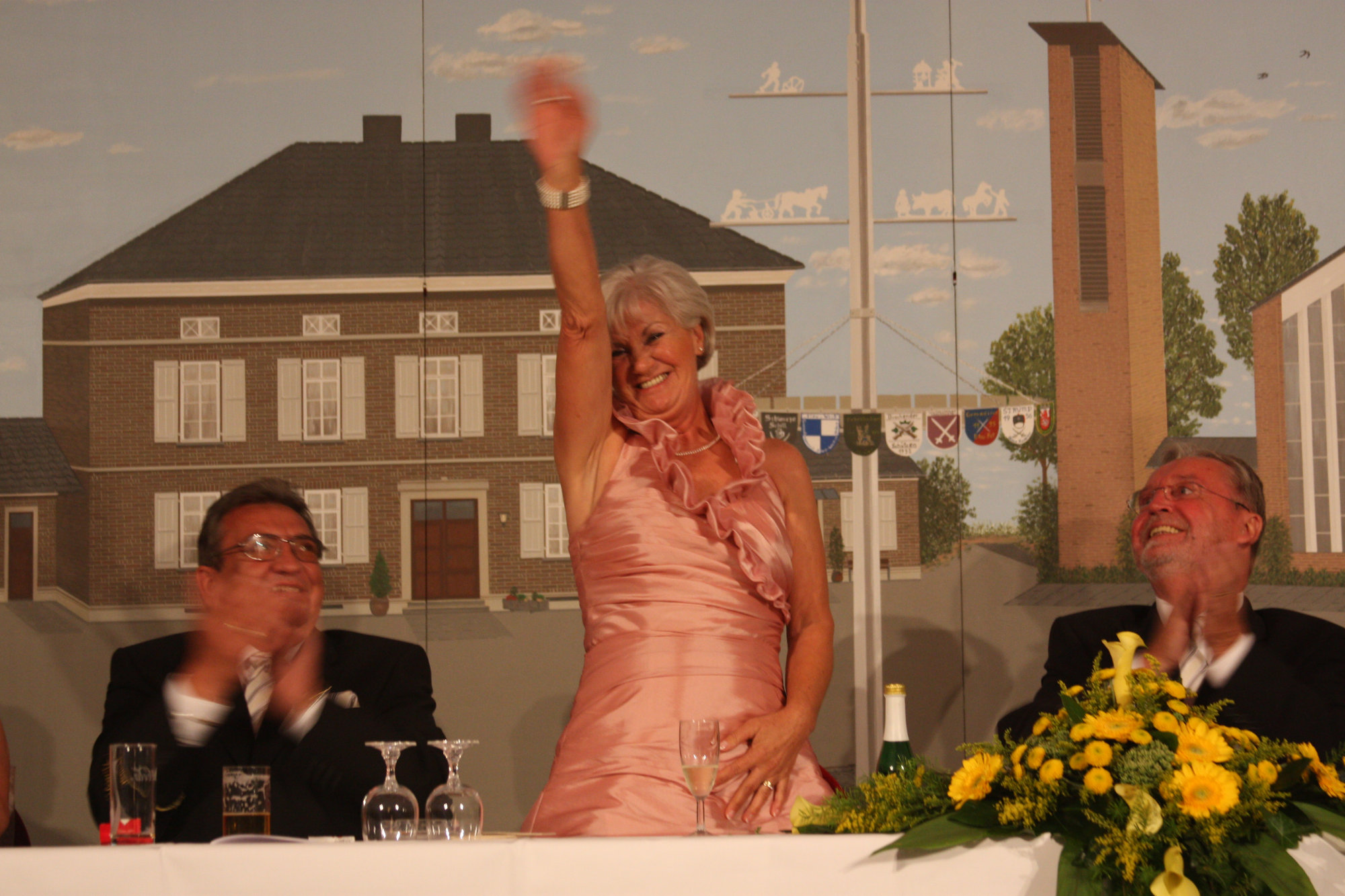 bei der Serenade vor der Königsburgoben v.l.: Präsident Karl-Heinz Rütten, Ministerpaar Christine und Matthias Vieten, Königspaar Josef und Marlene Arts, Ministerpaar Claudia Sparla und Herbert Baumeister