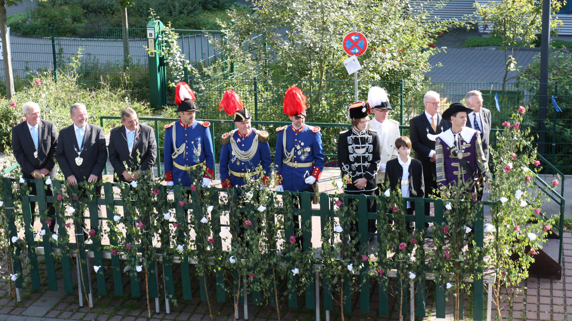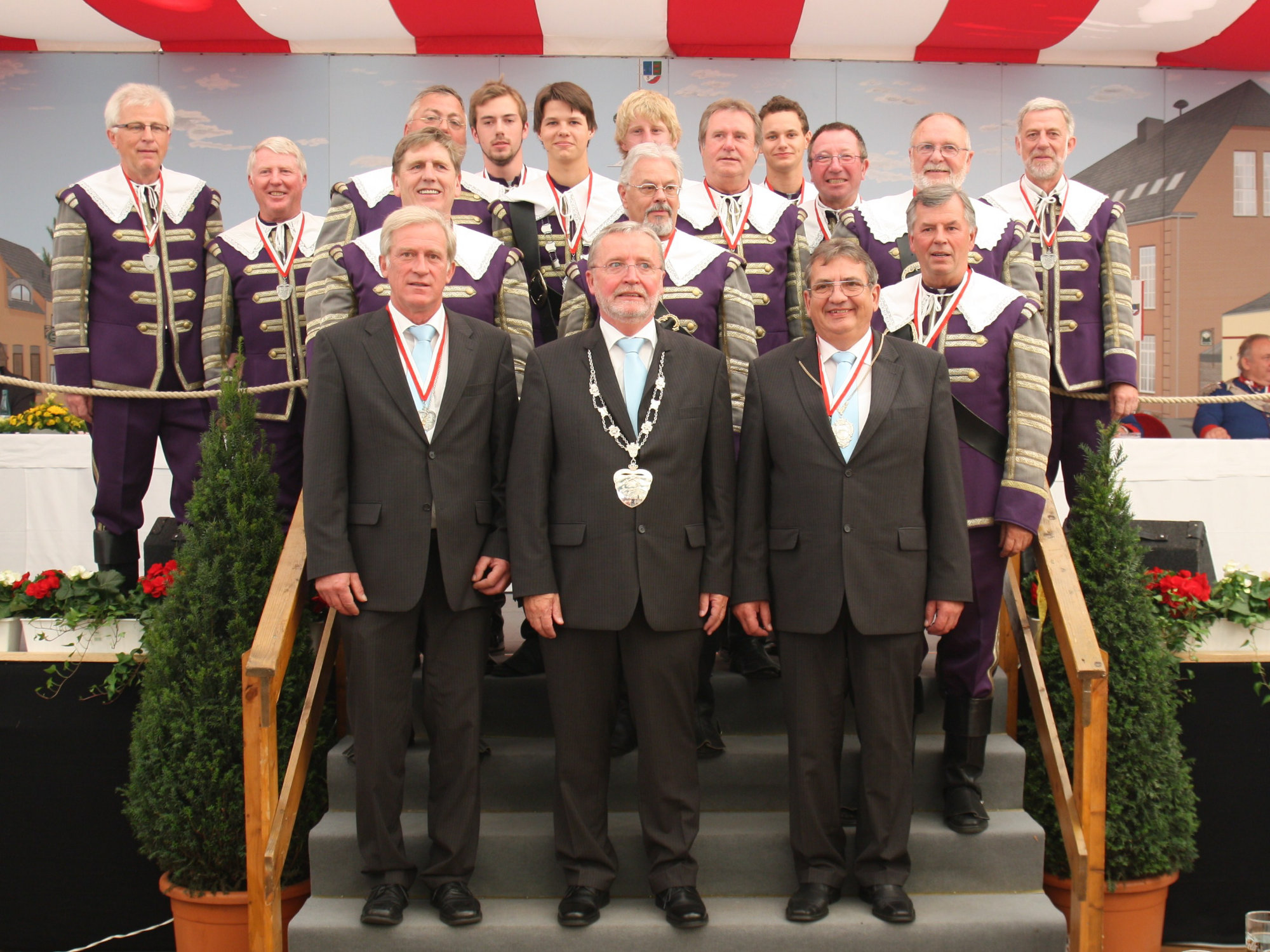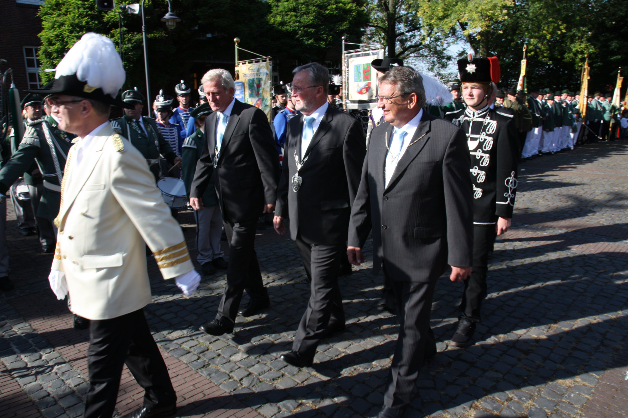 Frontabnahme durch das Königshausbegleitet von den Ehrengästen (von links):Präsident Karl-Heinz Rütten, Stadtschützenkönig Thomas Holter, Bürgermeister Dieter Spindler, MdL Lutz Lienenkämper, Vorstandsmitglied Bernhard Fucken