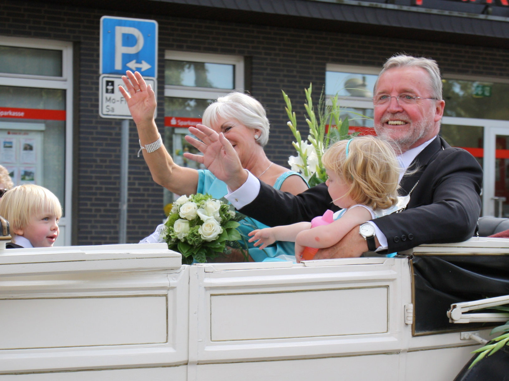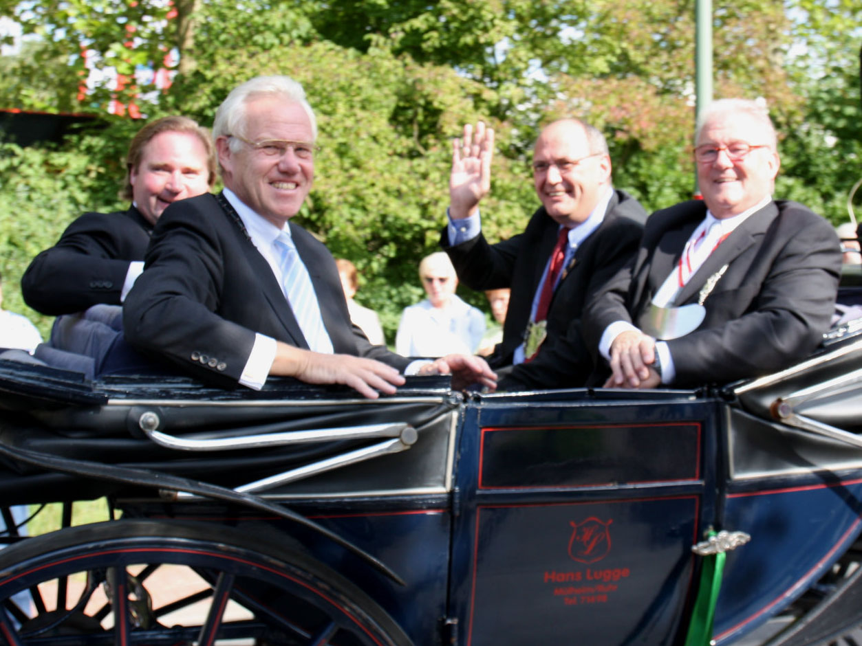 Kutsche der Ehrengästevon links: MdL Lutz Lienenkämper, Bürgermeister Dieter Spindler, Stadtschützenkönig Thomas Holter, Präsident Karl-Heinz Rütten