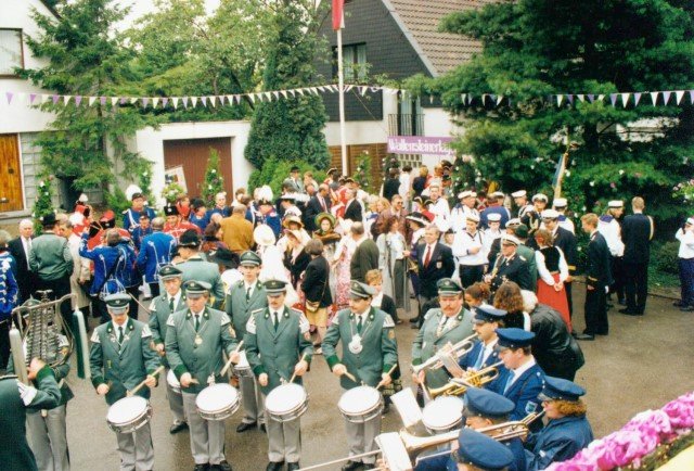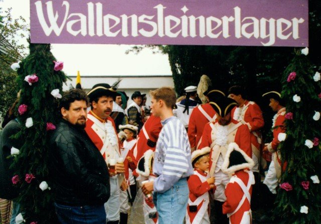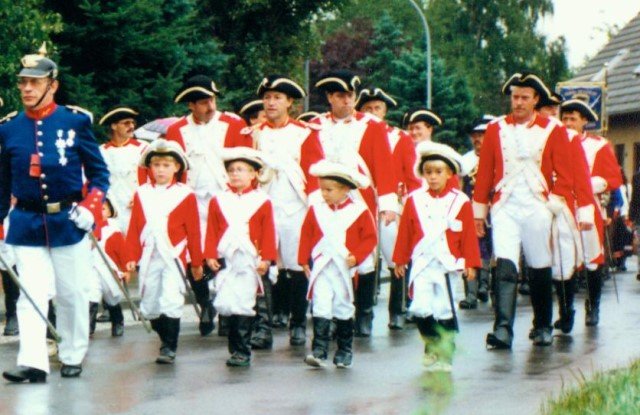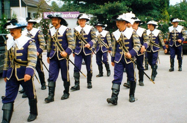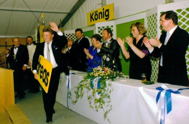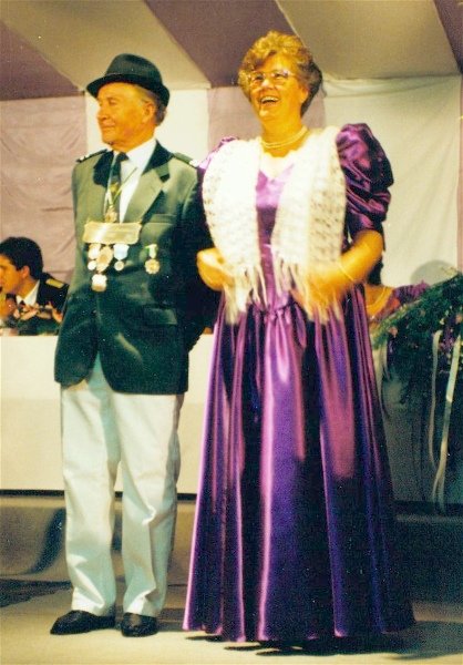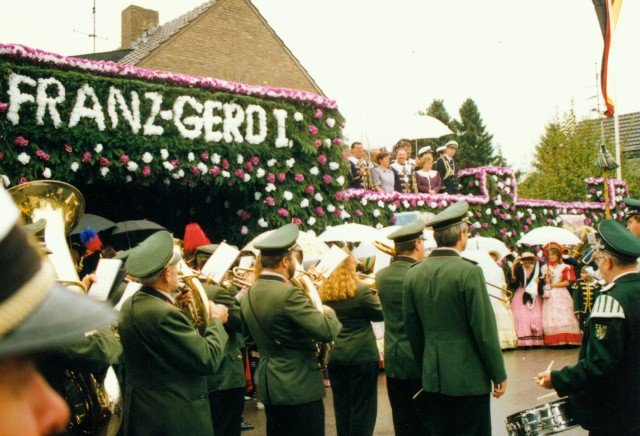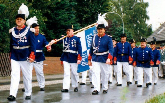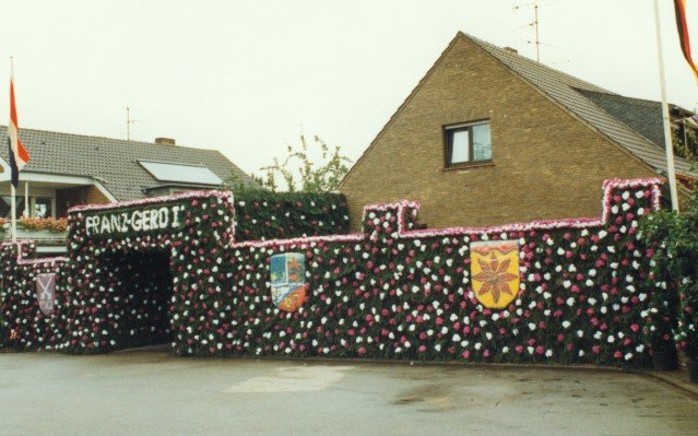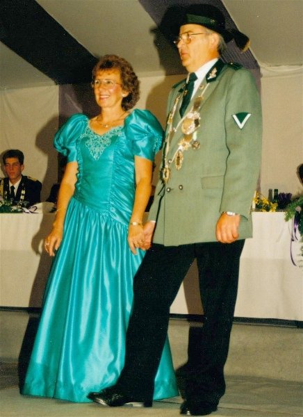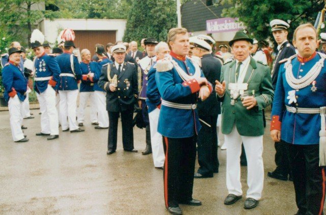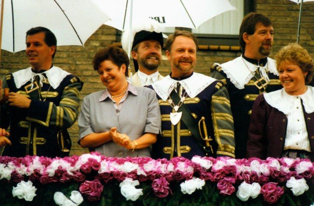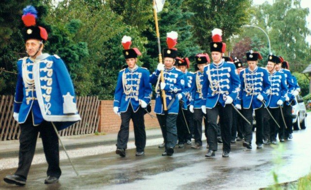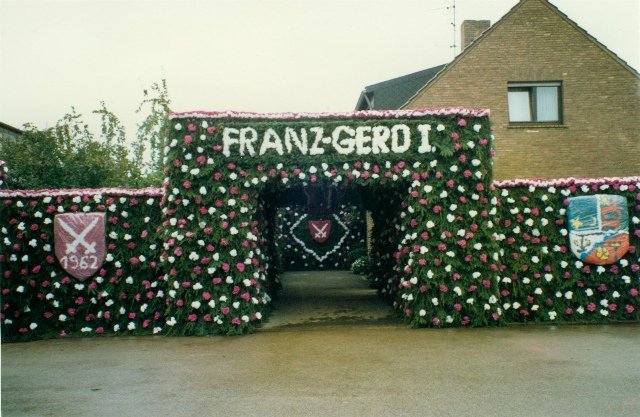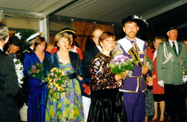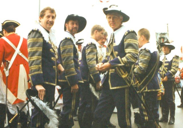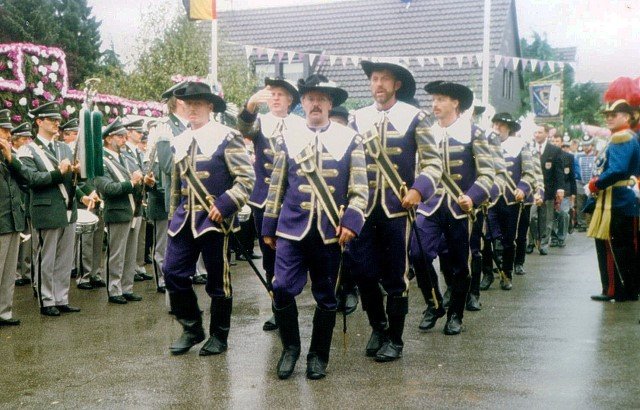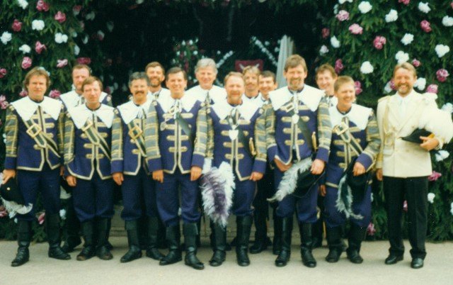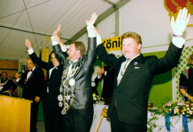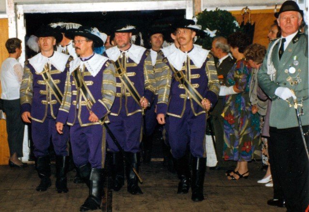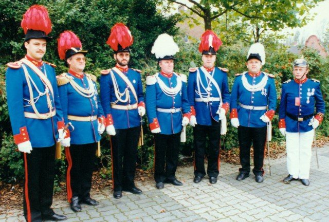 Königskompanie Wallensteiner Landsknechtevon links: Hans-Gerd Louis, Heinz Lonny, Hubert van Hees, Hauptmann Willi Mertens, Hans Baumeister, Minister Peter Mertens, Heinz Baumeister, König Franz-Gerd Arts, Roland Heise, Matthias Vieten, Minister Hans-Helmut Hüsges, Hans Faßbender, Theo Wellmann, Mundschenk Josef Arts