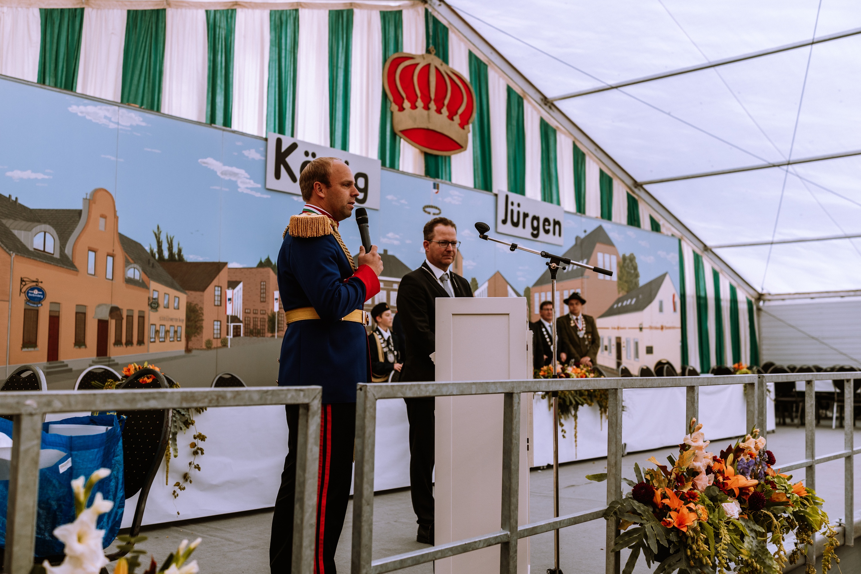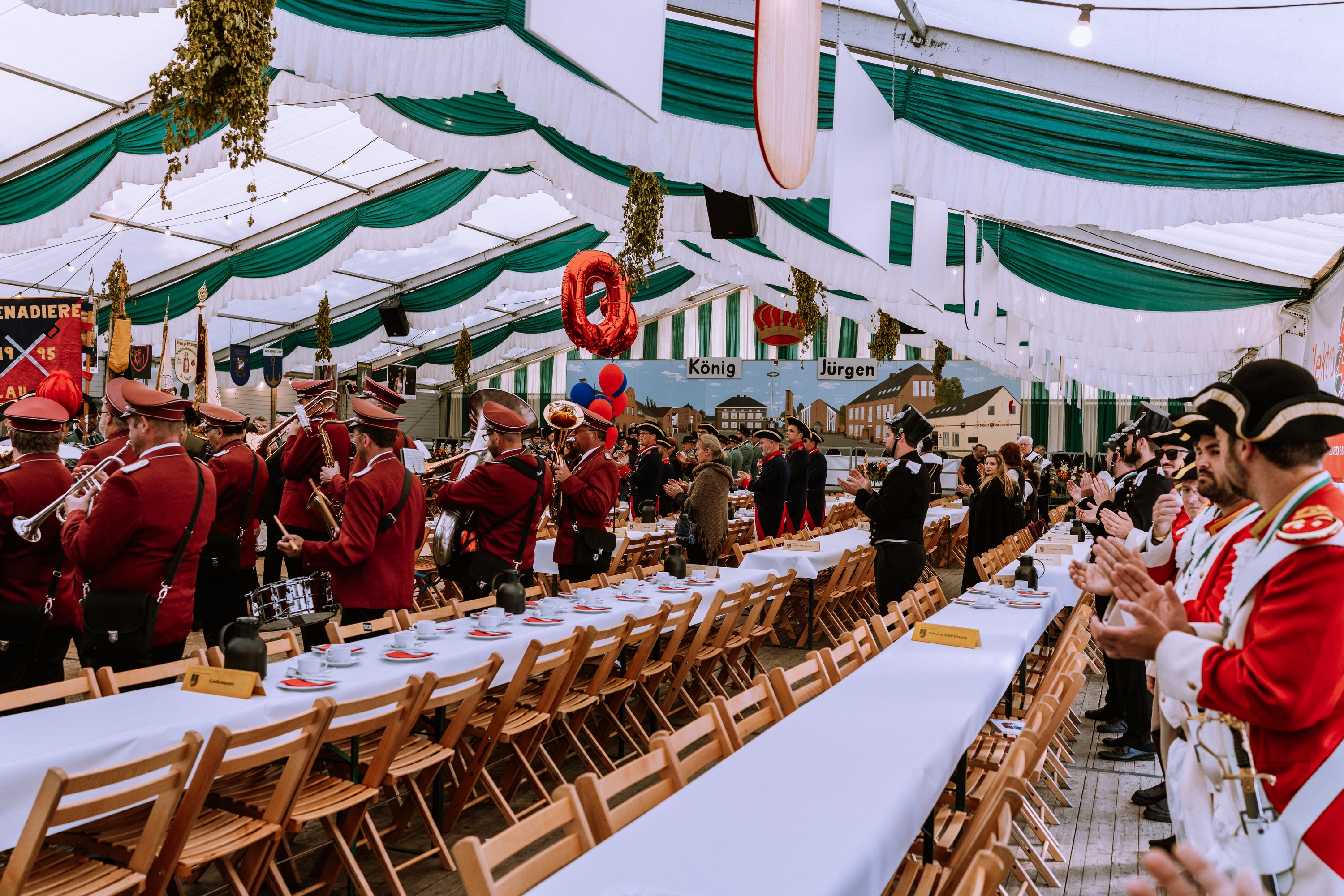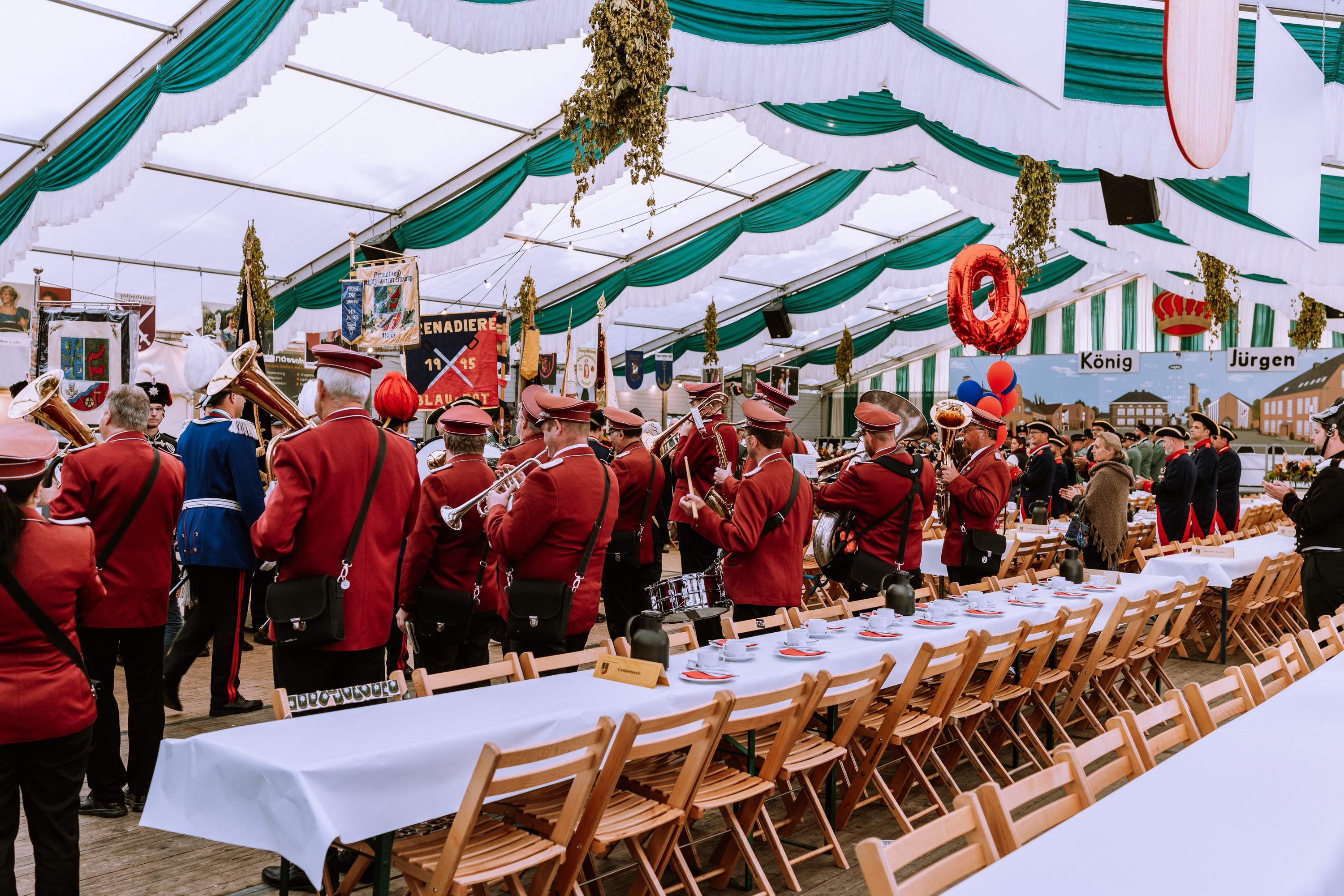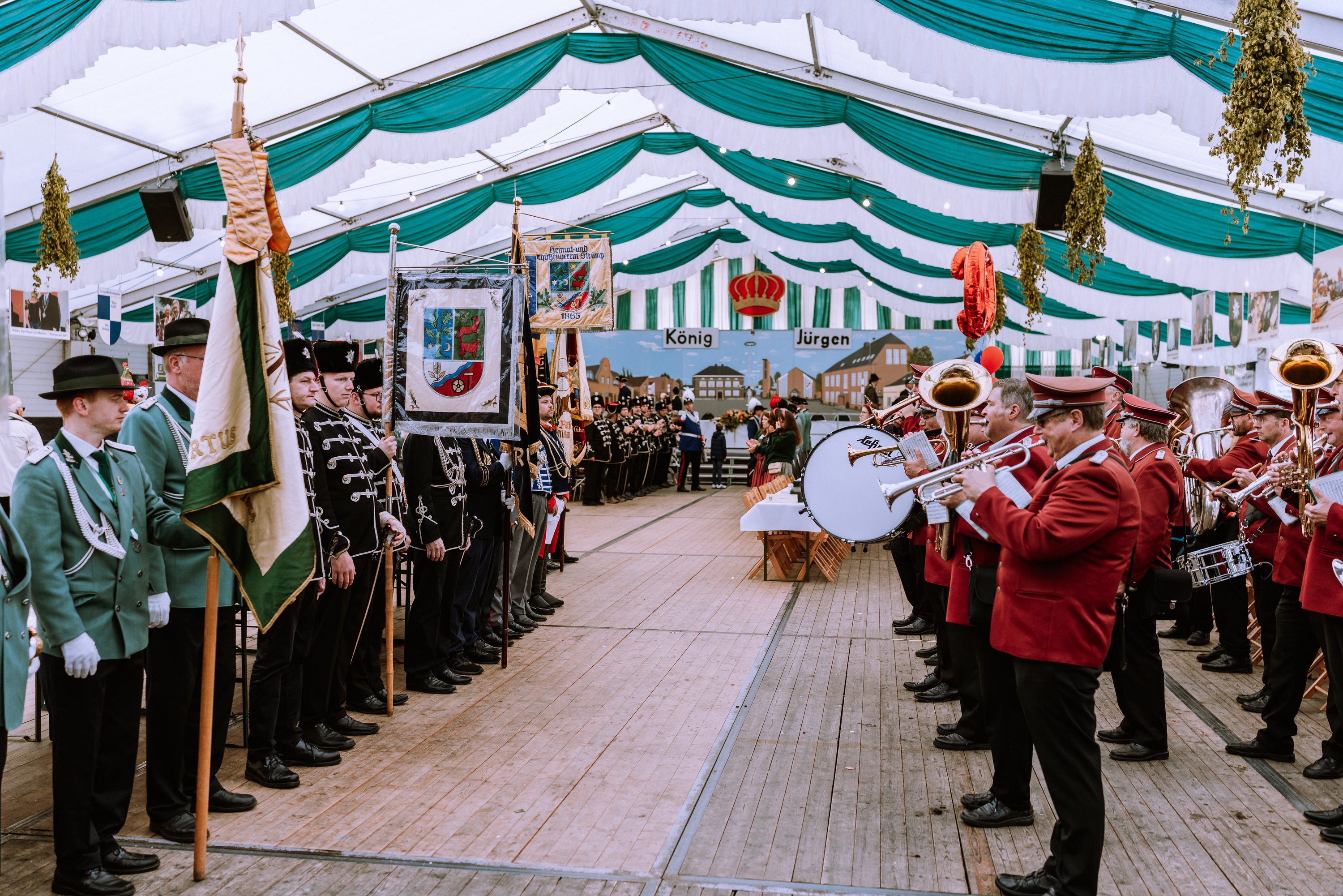 Wappen, Bühnenbild, Schützenbaum, Fahnen, Standarte