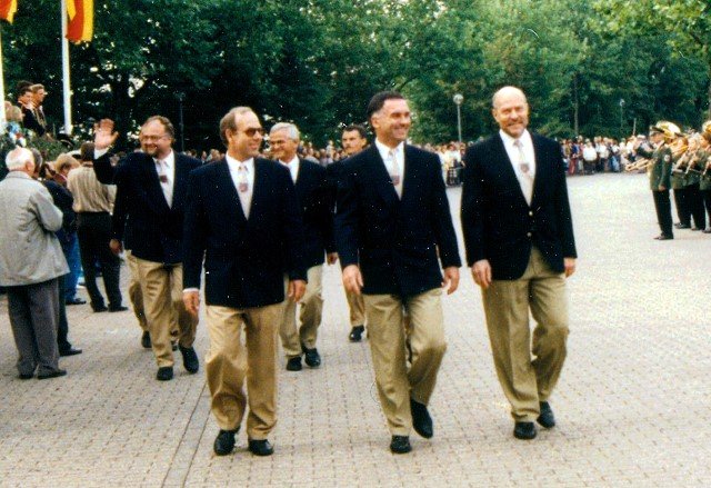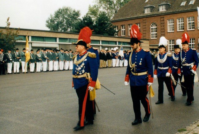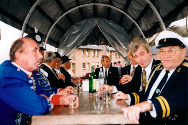vorne links: Friedel Thönissen, vorne rechts: Viktor Spielhagen, hinten: Ehrenoberst Franz-Josef Cames