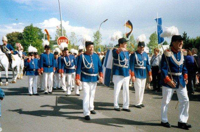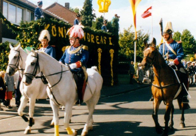 König Andreas Wasgien mit seiner Königin Juttadie Königskompanie "Blaue Husaren" steht Spalier