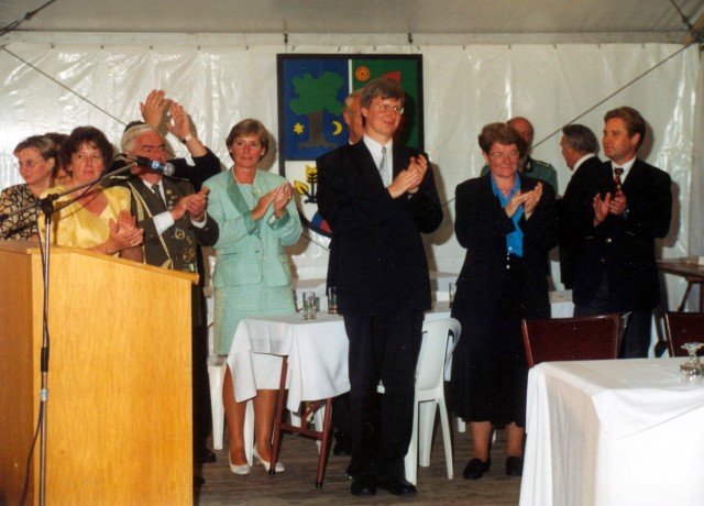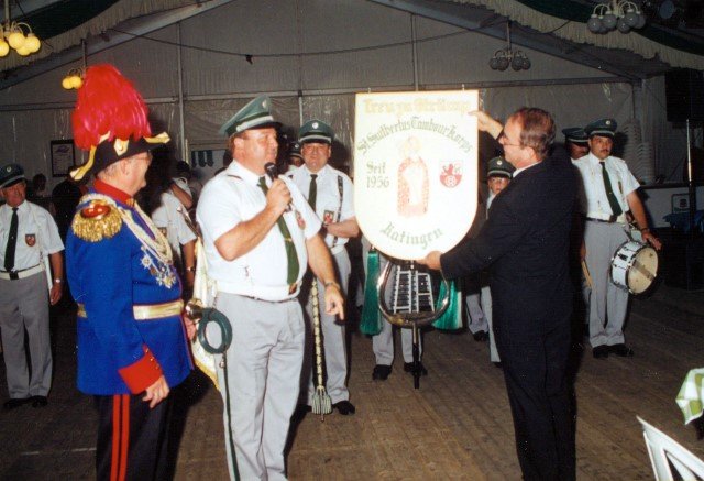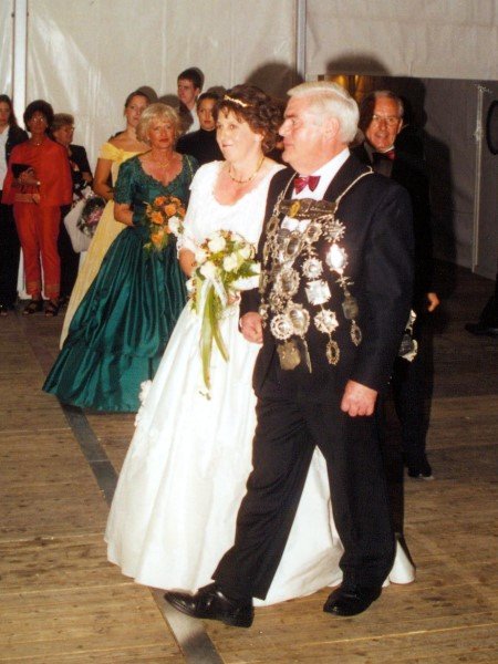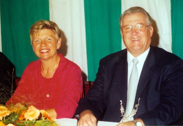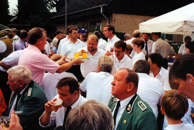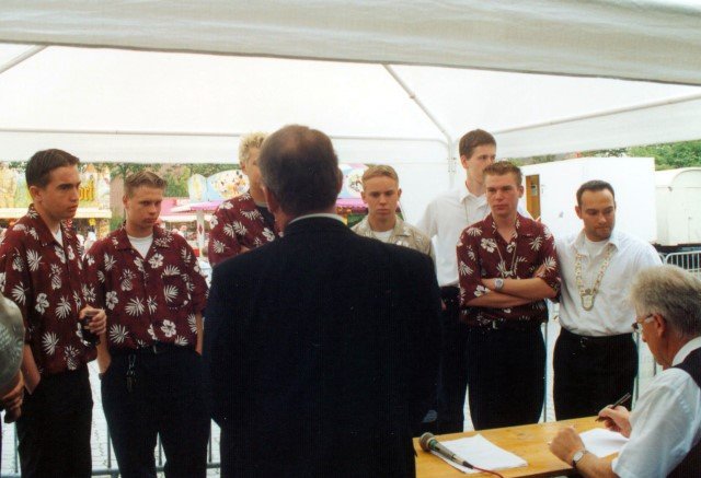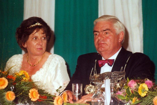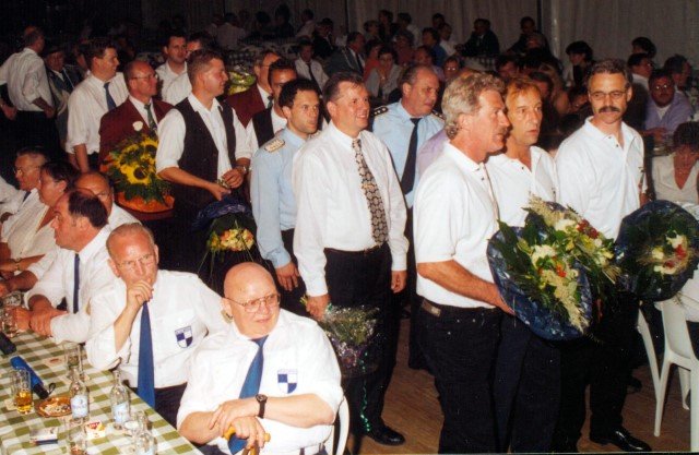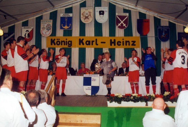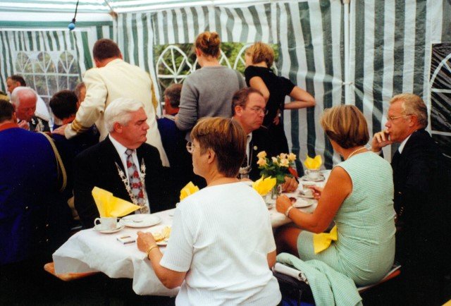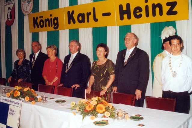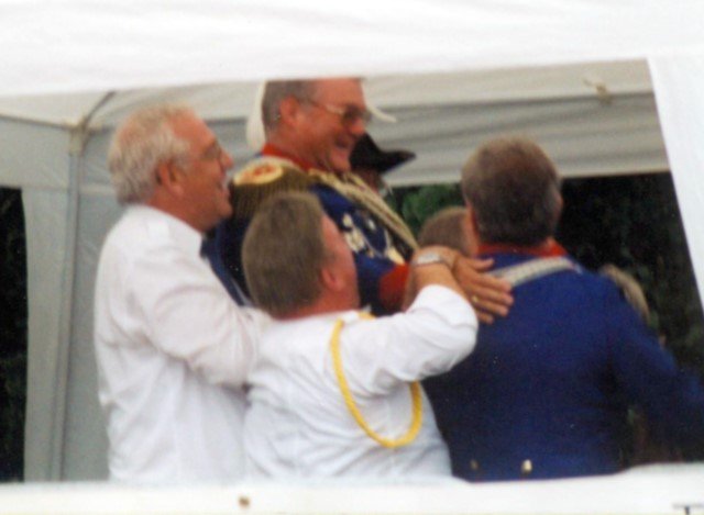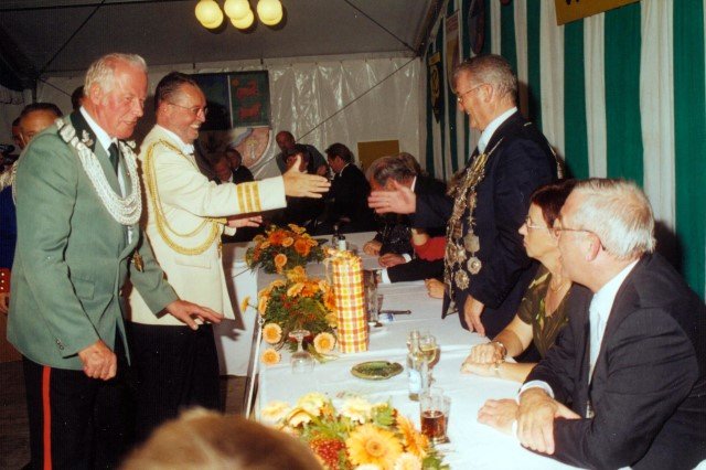 Ehrengäste auf der Bühne im Festzeltim Vordergrund von rechts: MdL Lutz Lienenkämper, Pfarrerin Ute Saß, Pfarrer Dr. Gerhard Saß, dahinter verdeckt Bürgermeister Dieter Spindler, Frau Doris Spindler, Ex-König Hermann Polachowski mit Ehefrau Katharina